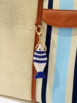 Reel in a splash of whimsy with our Fish Beaded Bag Charm/Key Ring. Featuring a playful blue and white striped beaded fish design, this charming accessory brings a nautical touch to your favorite tote or keys. It’s finished with a gold key ring and clasp hook, making it easy to clip on and go. Whether you're seaside or city-bound, this little fish makes a stylish statement.