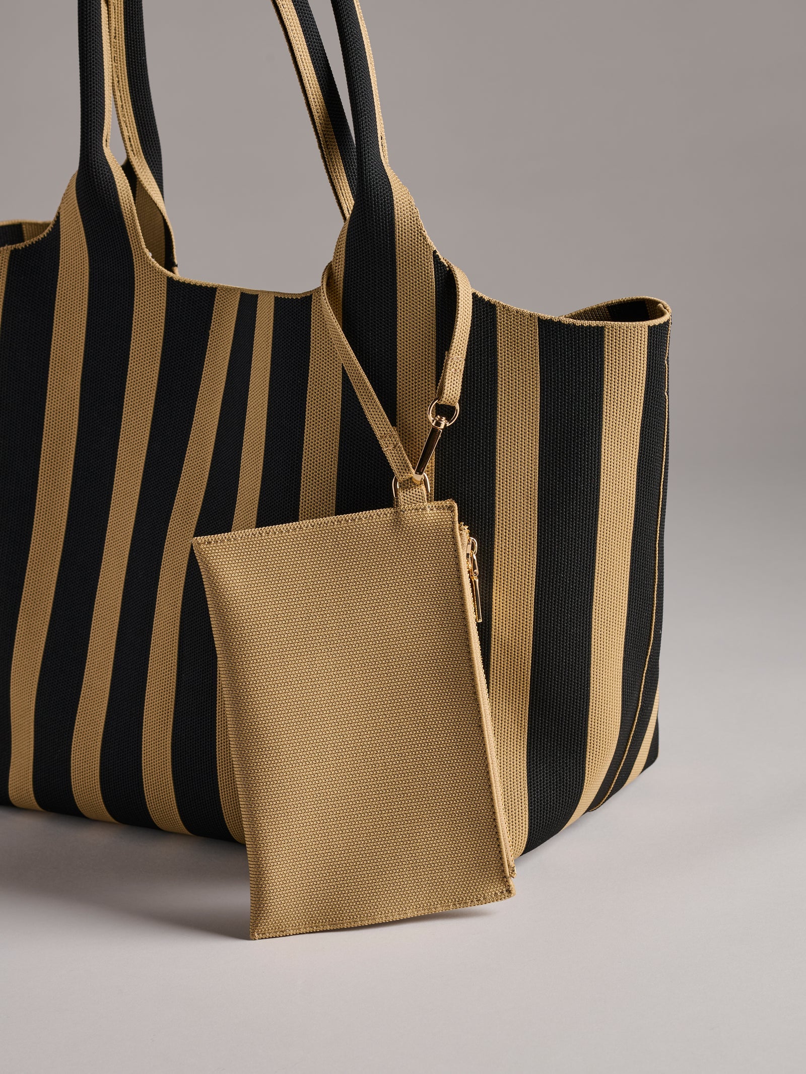 Made from washable polyester knit with gold hardware. Handwash, dry flat