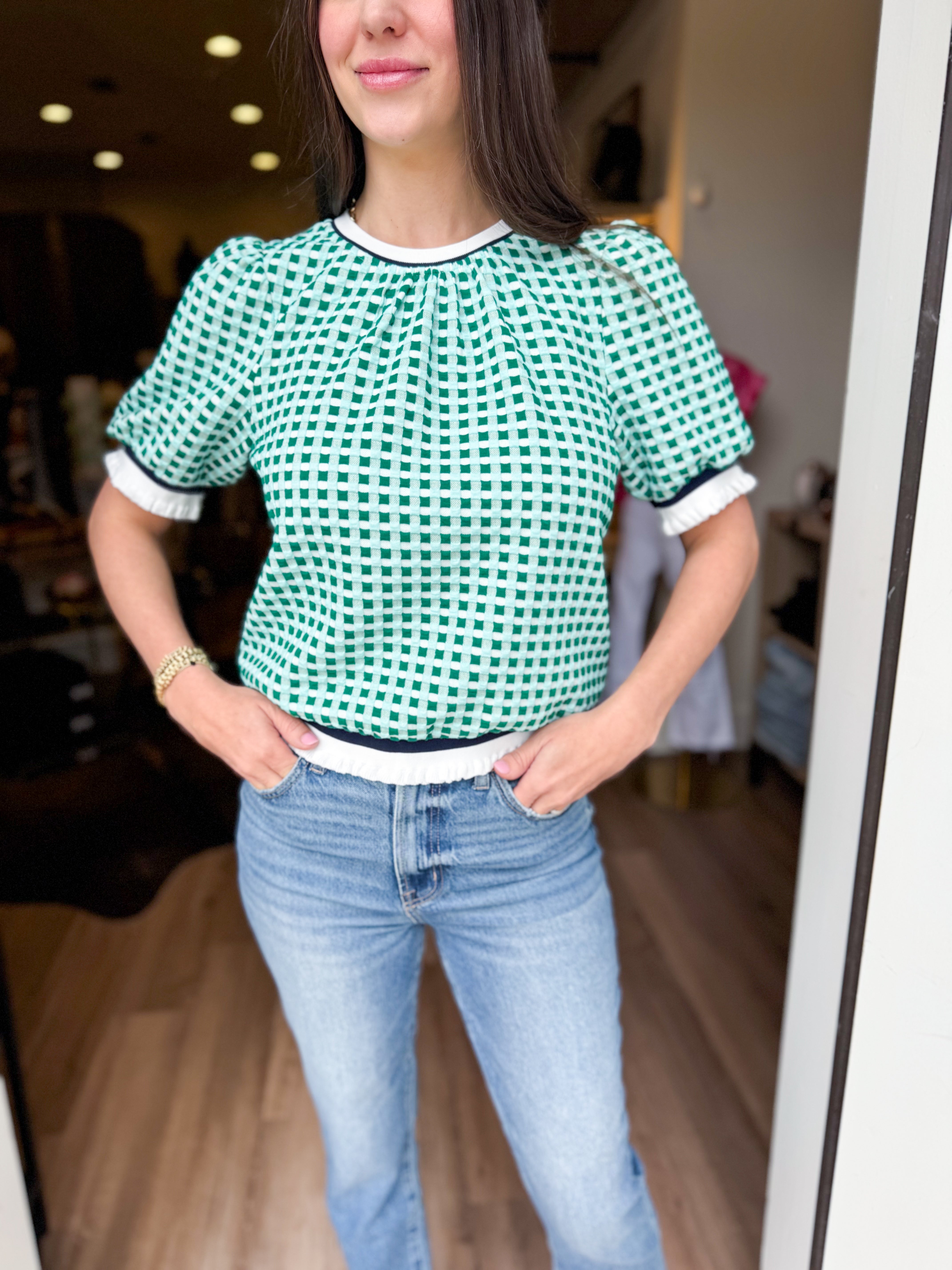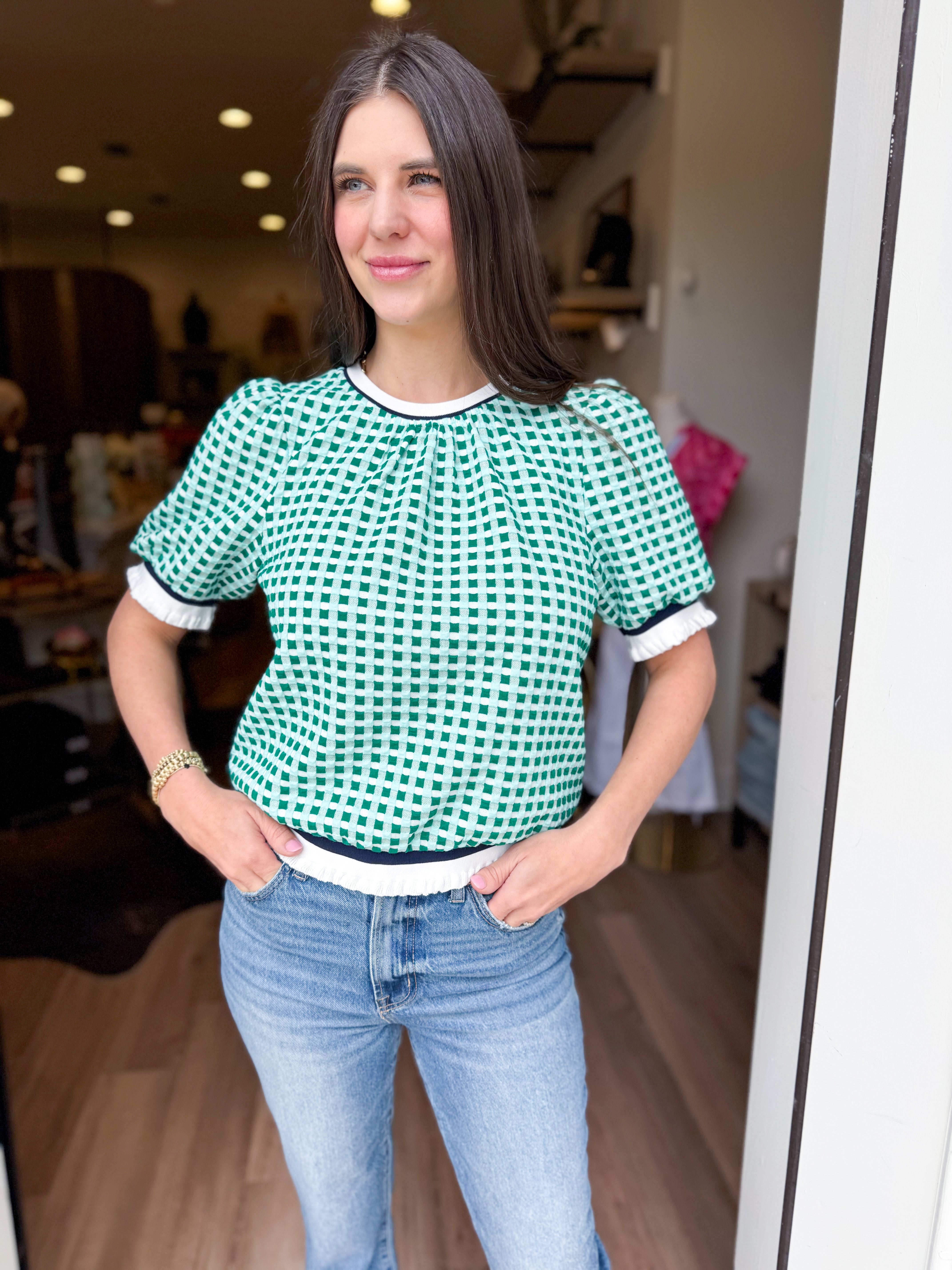The Callie Top brings effortless style with its charming puff sleeves and textured plaid knit construction. Featuring bold striped contrast detailing, this piece layers beautifully over basics or stands alone as a statement. The structured knit fabric offers comfortable wear throughout your day, while the thoughtful design details elevate any casual outfit.