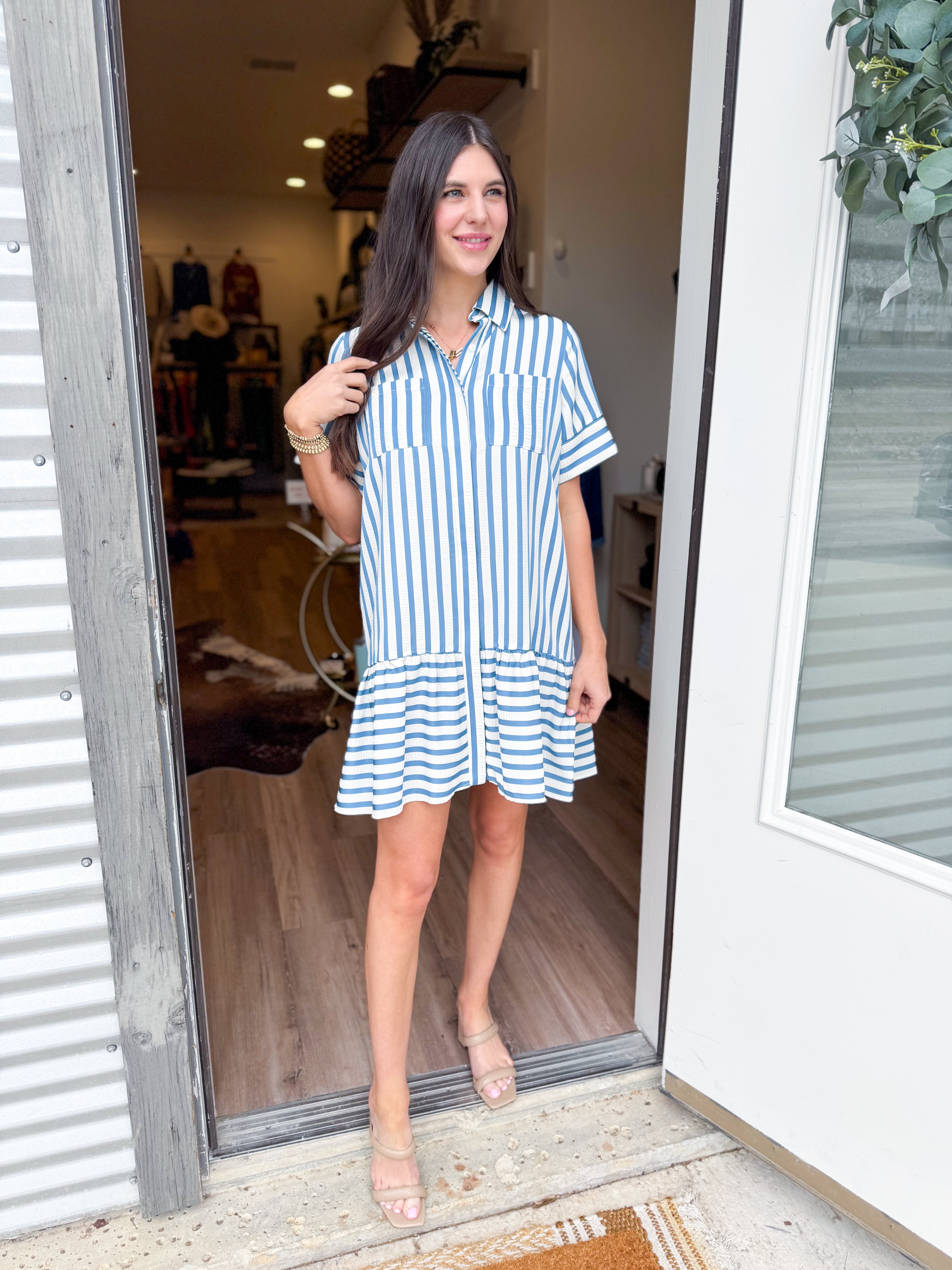 This striped short sleeve mini features charming tiered layers that create flattering movement and dimension. The classic stripe pattern pairs easily with your favorite accessories, making it a versatile go-to piece you'll reach for again and again.