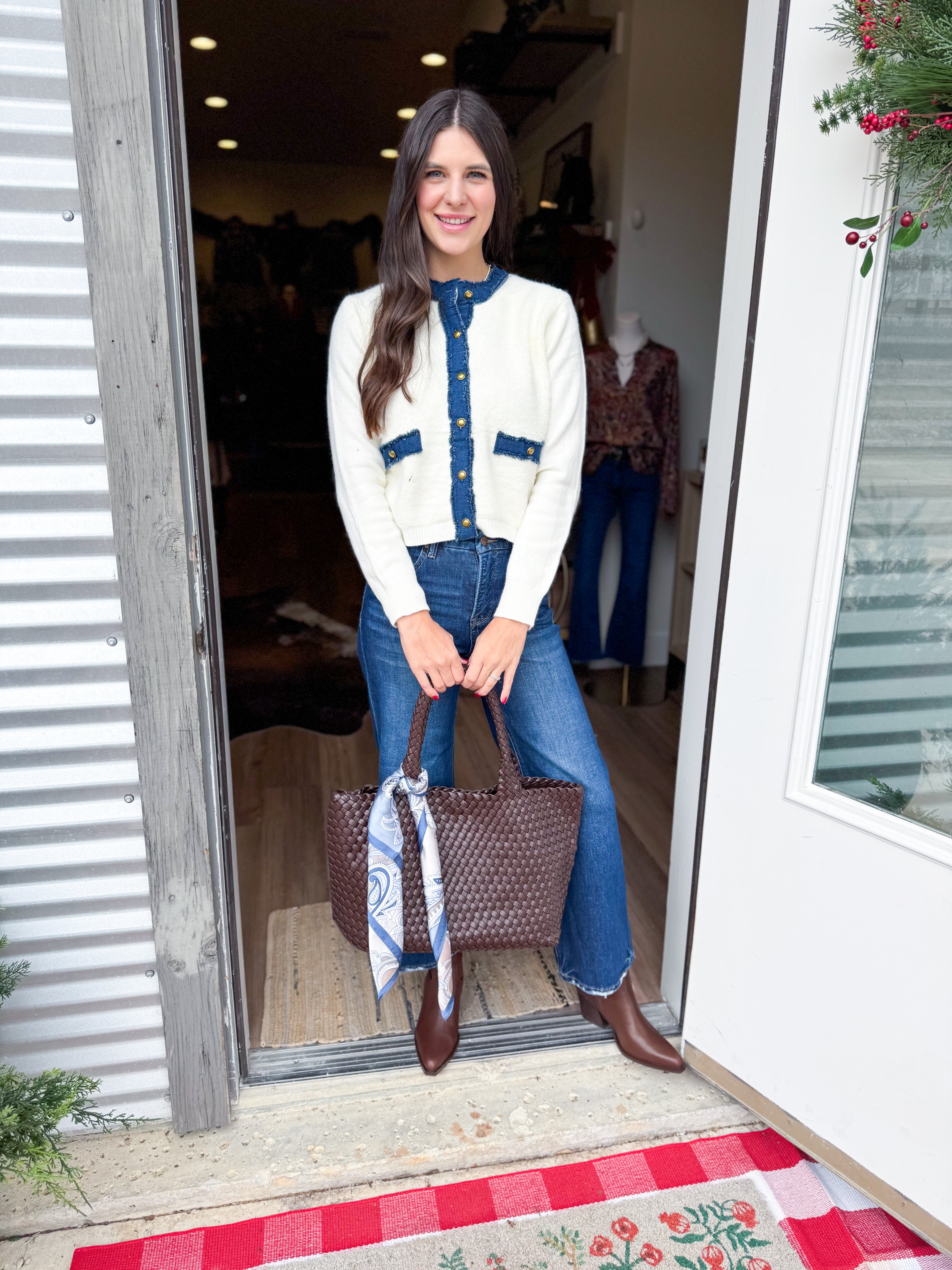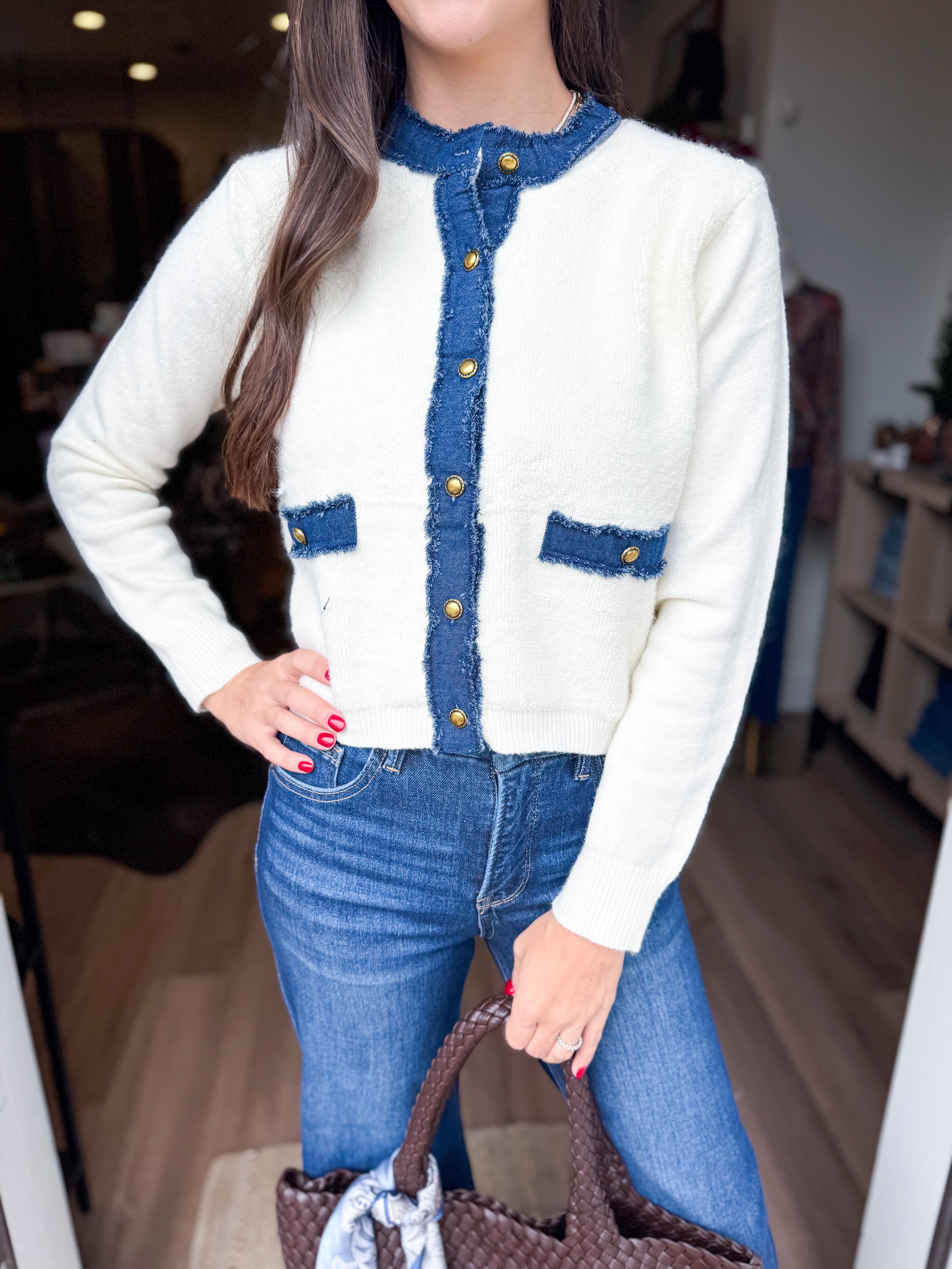 Experience the cozy charm of this cream knitted cardigan designed with long sleeves and a stylish crew neck. Its button-up front adds both functionality and flair while the navy blue denim accents lend a touch of sophistication. Perfect for any occasion this cardigan is a must-have addition to your wardrobe!