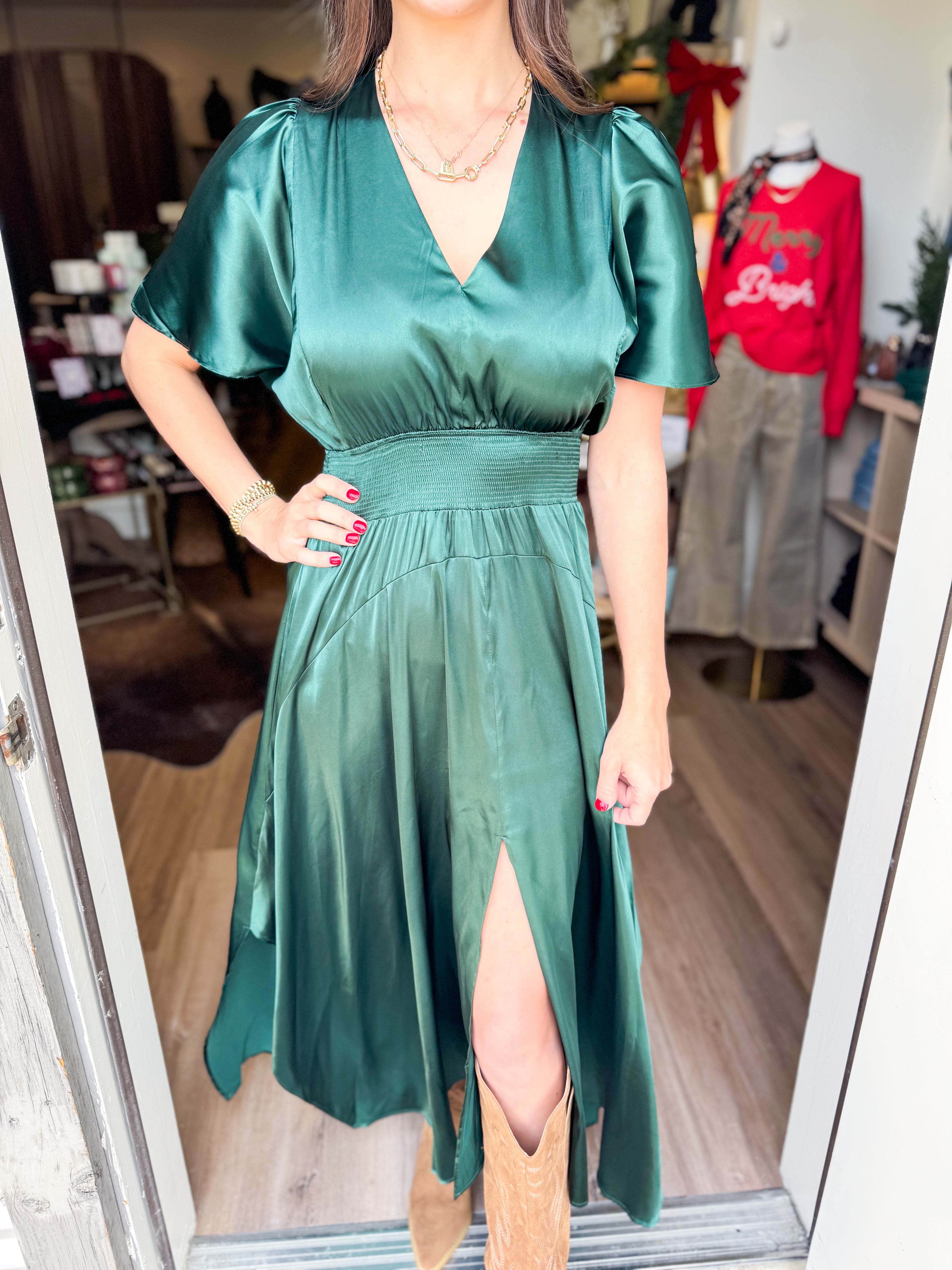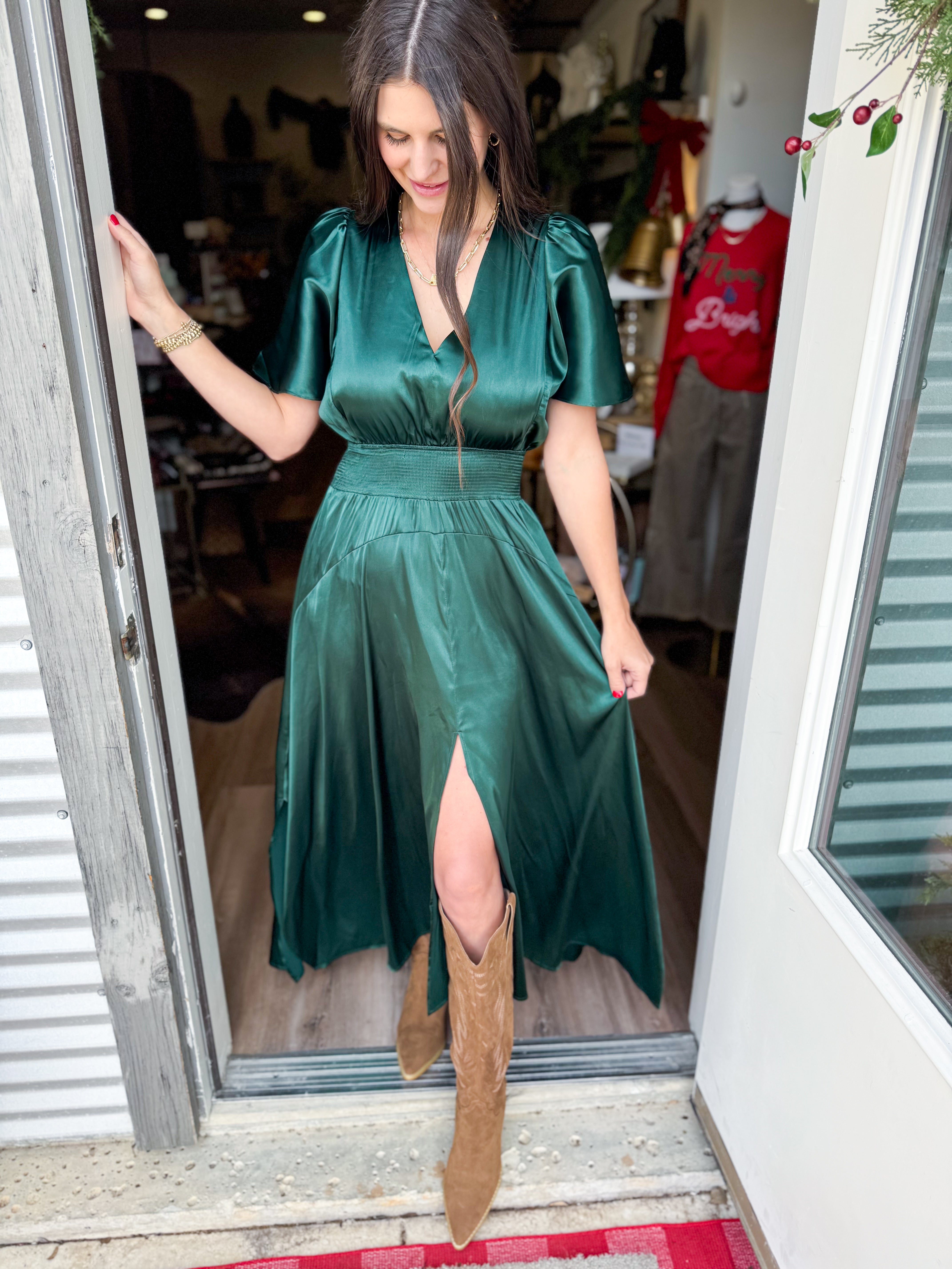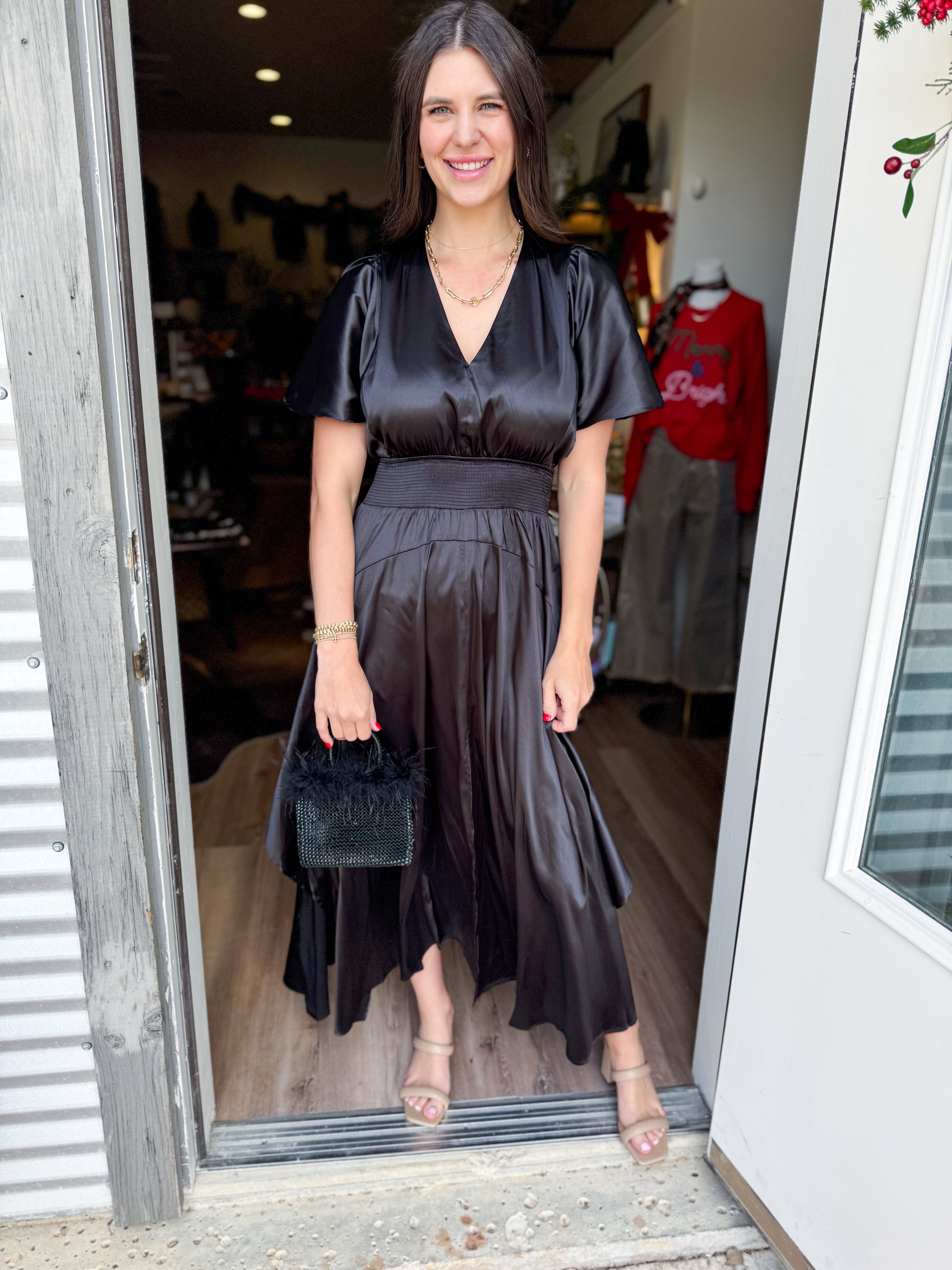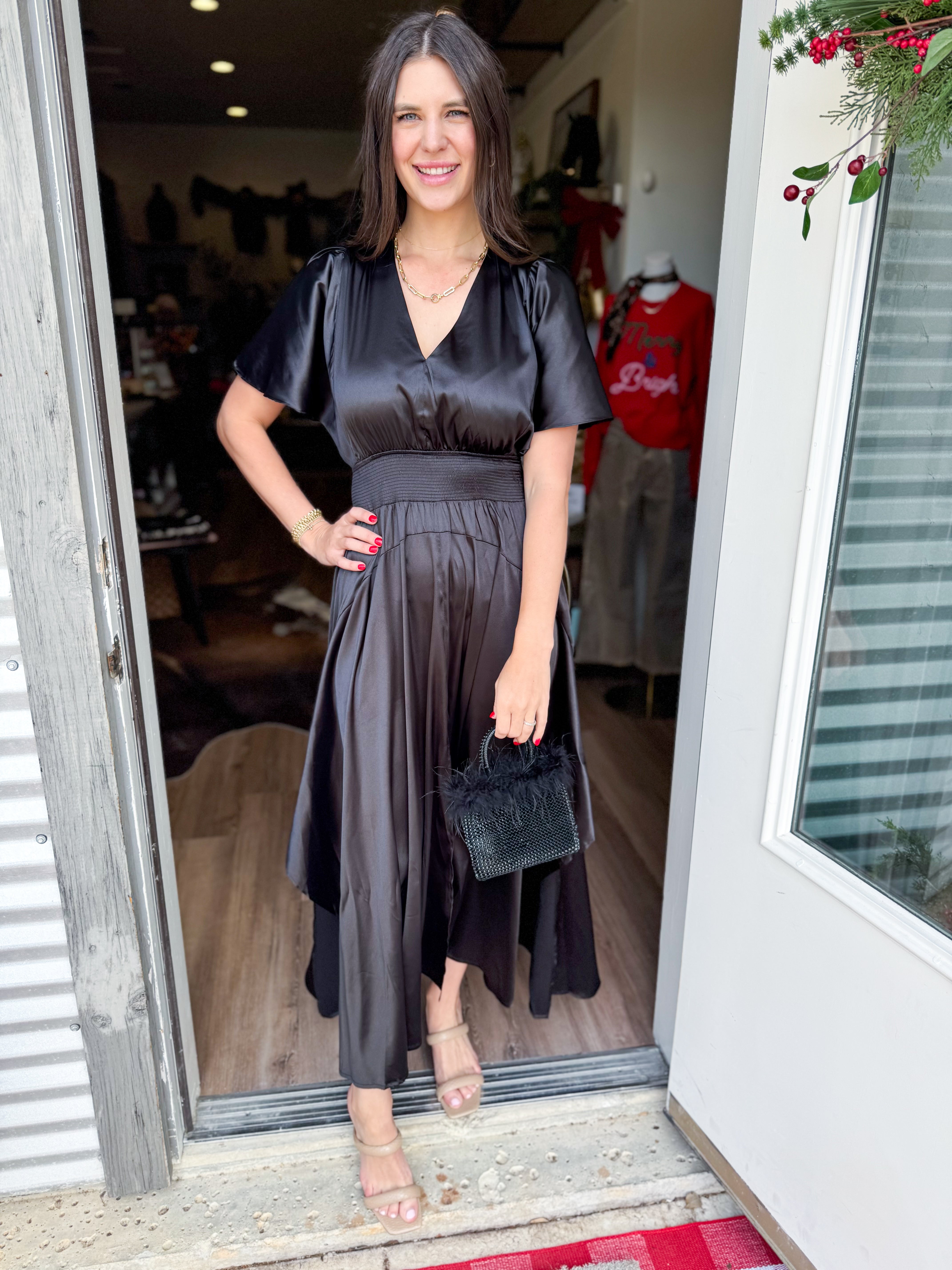 The Clarissa Maxi Dress captures understated luxury in flowing chiffon. A refined V-neckline paired with graceful cap sleeves creates an effortlessly polished silhouette, while the cinched elastic waist accentuates your natural curves. The elegant slit detail adds a whisper of allure and ease of movement, making this gown a versatile choice for any occasion requiring quiet confidence and timeless style.