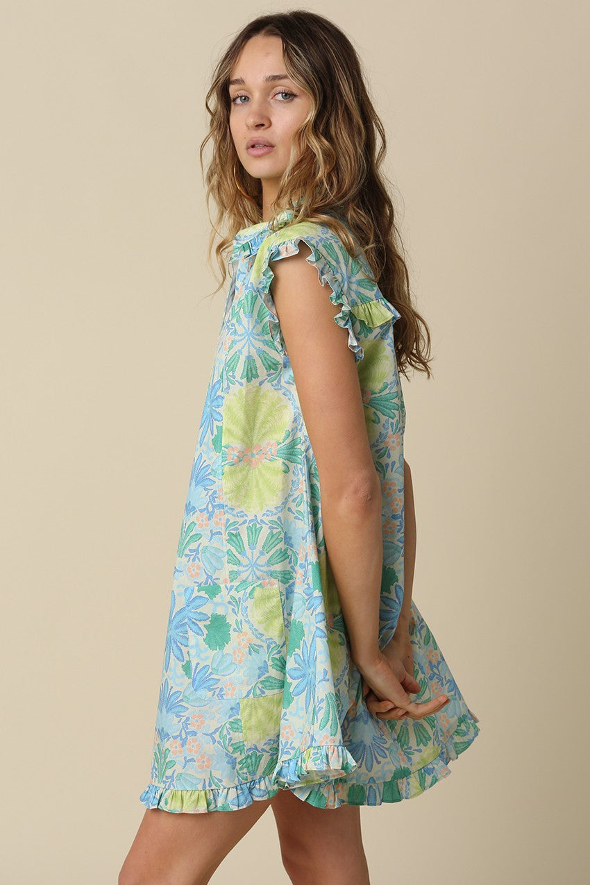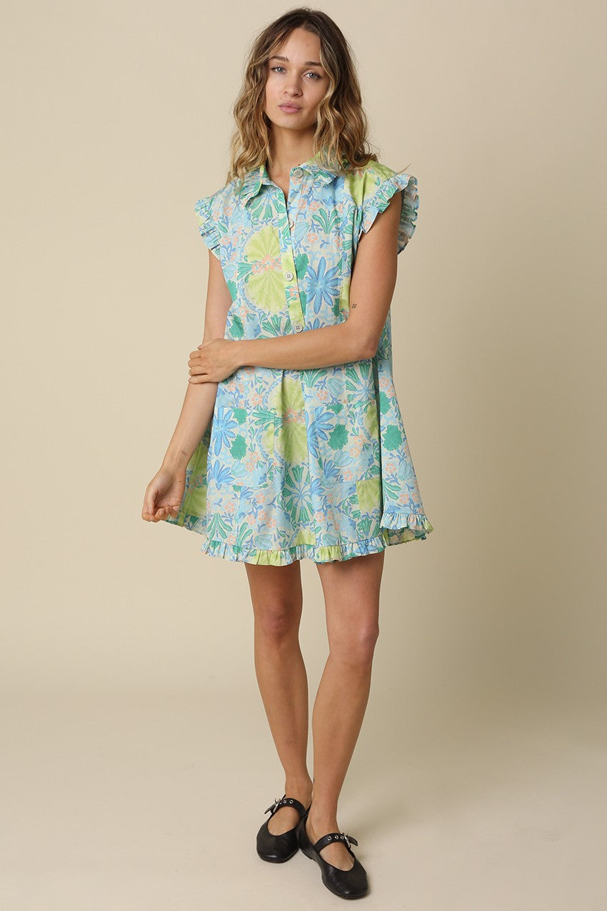 The Coastal Bloom Ruffle Sleeve Cotton Mini Dress is the perfect blend of effortless style and breathable comfort. Made from 100% cotton, this floral mini dress features a fresh blue and green botanical print that brings a light, coastal-inspired feel to your warm-weather wardrobe. Designed with a flattering button-front silhouette, feminine ruffle cap sleeves, and a softly flared skirt with a ruffled hem, this dress creates an easy yet polished boutique look.