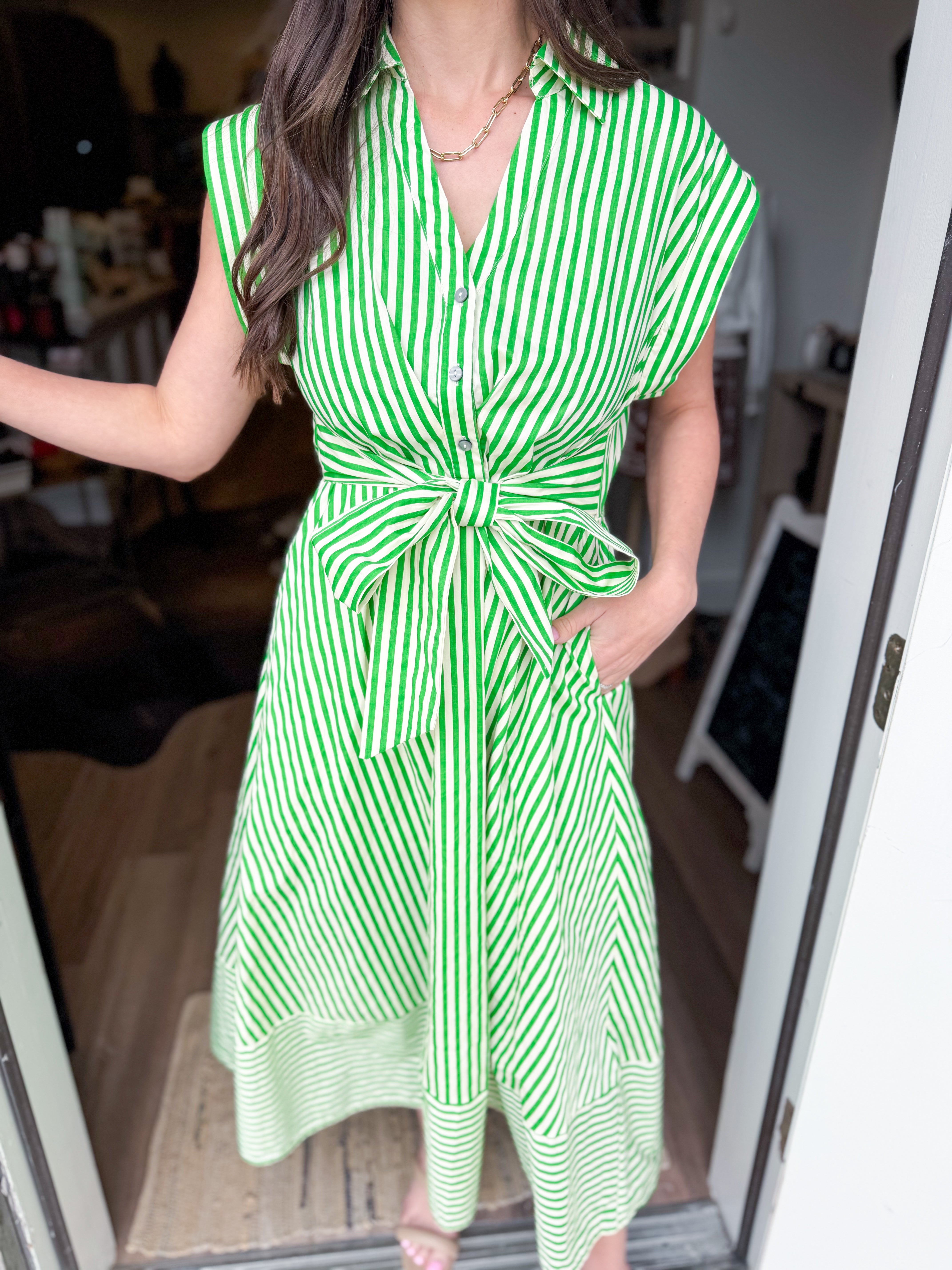 The Demi Dress brings effortless style to your everyday rotation. This striped midi features a flattering V-neck with a self-tie detail that lets you customize the fit, while the gathered waist creates a graceful silhouette. Practical side pockets keep your essentials close, and the lined construction ensures comfort and confidence all day long.