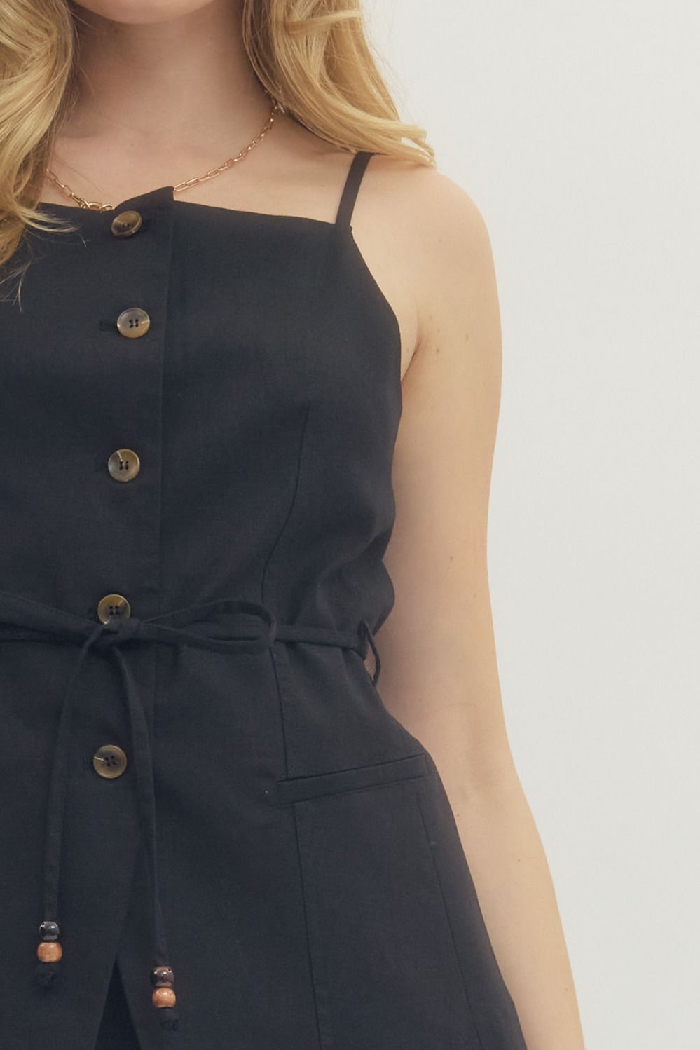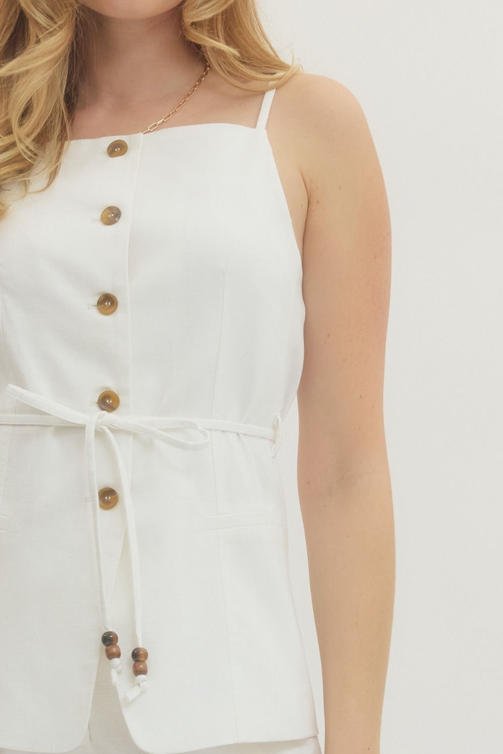 Make a statement with this polished sleeveless vest. The solid design features a button-front closure and adjustable self-tie waist embellished with wooden bead details, allowing you to achieve your ideal fit. Constructed from woven fabric with a full lining, it offers comfort and structure for all-day wear. Decorative front pockets complete the refined look.