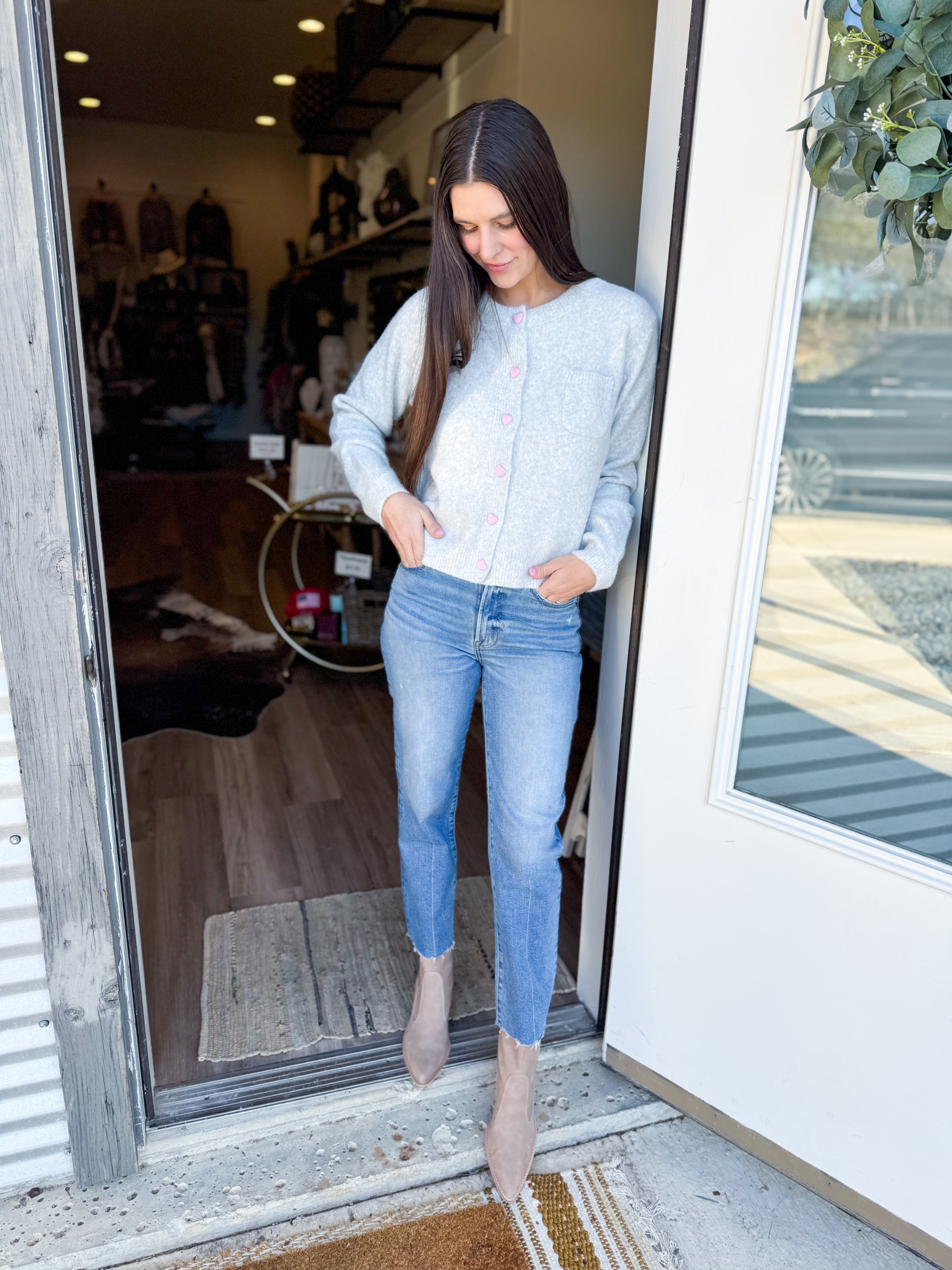 Introducing the luxurious fluffy gray cardigan beautifully adorned with charming heart-shaped buttons that add a playful touch. Crafted with soft high-quality materials this cardigan features long sleeves that provide warmth and coverage while the cozy crew neck ensures a comfortable fit. Whether you're dressing up for a casual outing or snuggling at home this versatile knitted layer is ideal for any occasion.