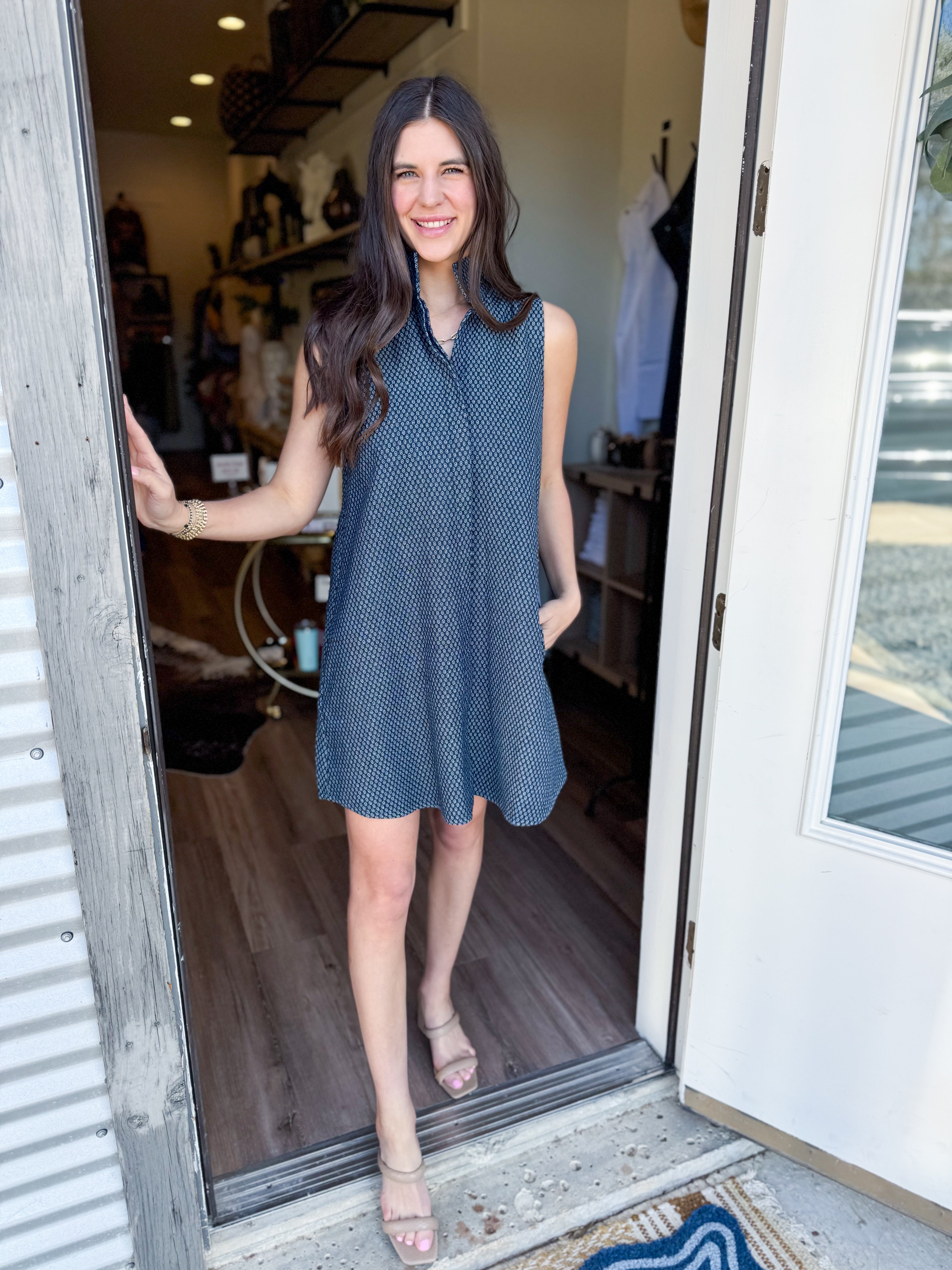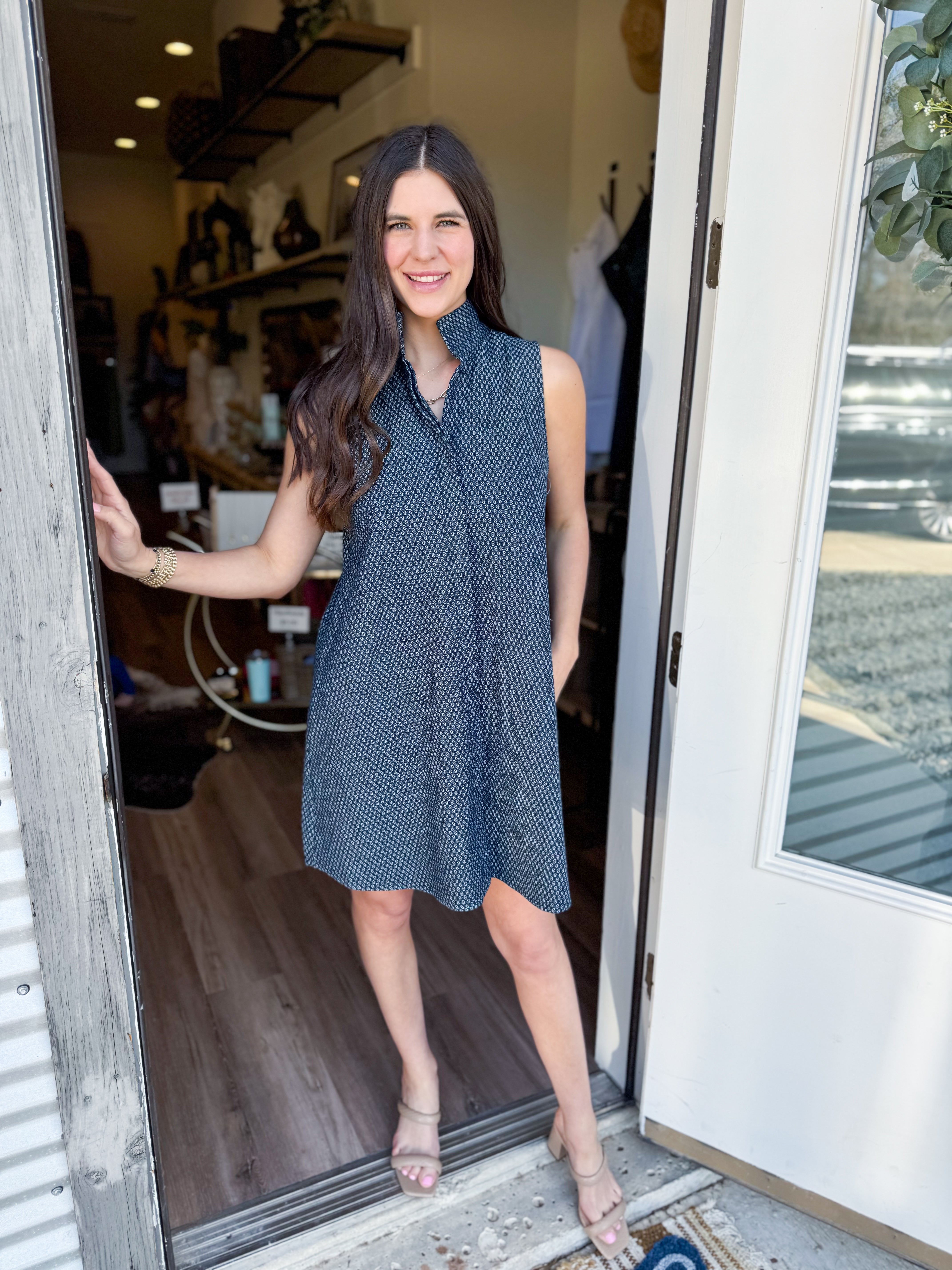 The Jennifer Dress combines timeless elegance with modern simplicity. This sleeveless shift dress features a distinctive stand collar that adds polish and structure to your everyday wardrobe. The relaxed, straight-cut silhouette offers comfortable movement while maintaining a refined appearance—perfect for layering or wearing solo