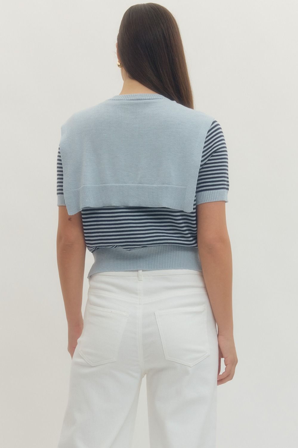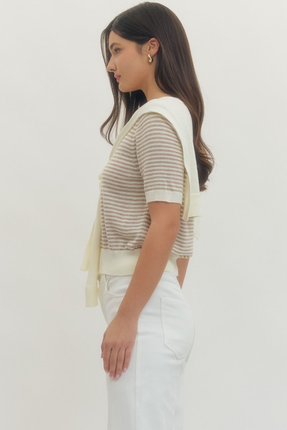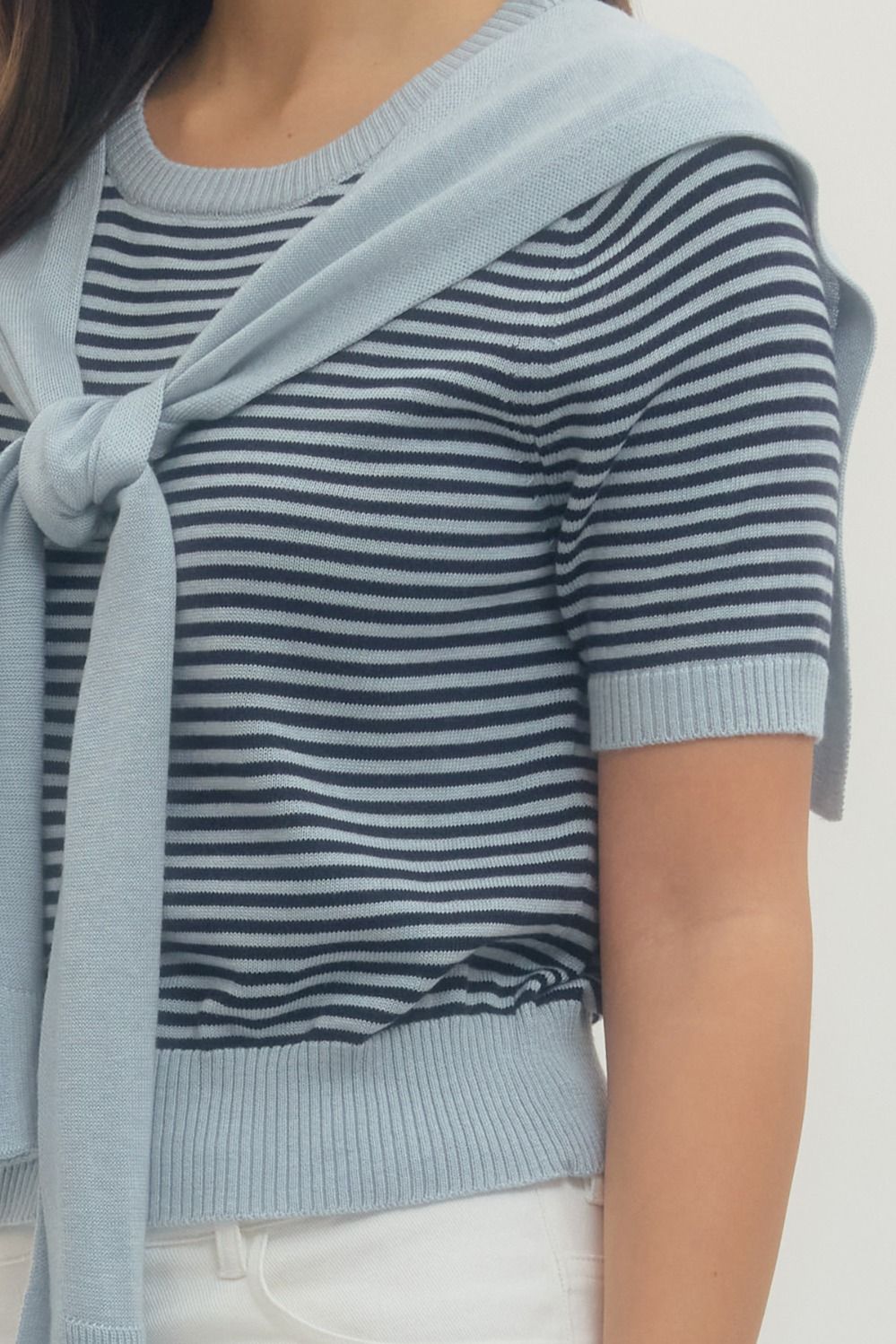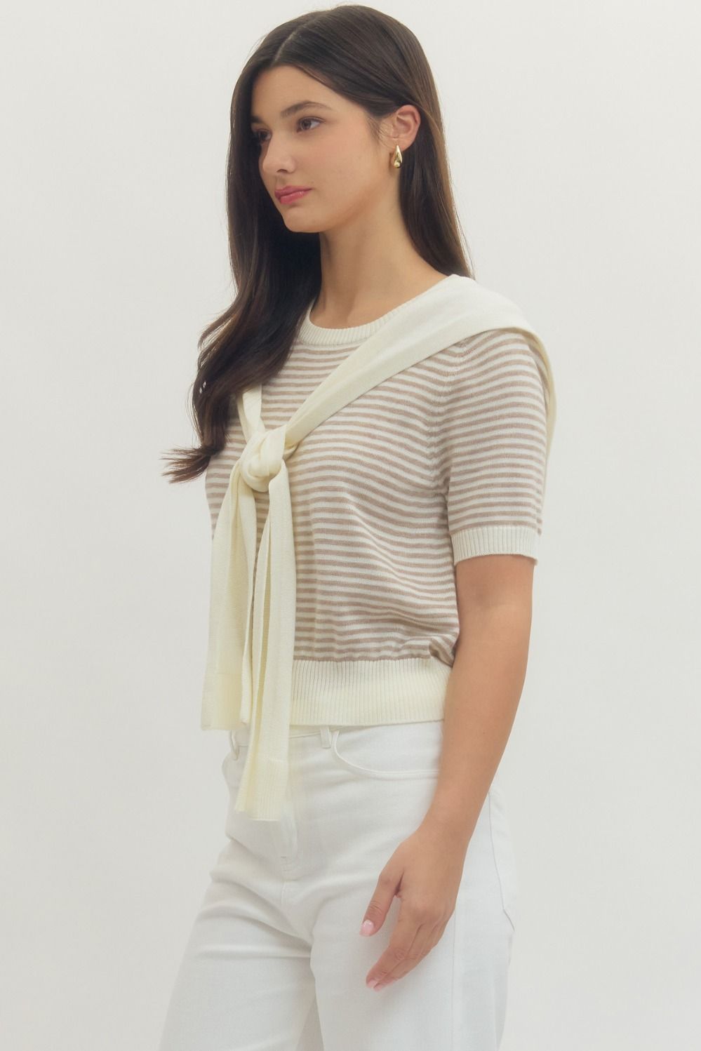 Striped short sleeve knit top with an attached knit scarf detail at the neckline that drapes elegantly and ties at the front. Features ribbed finishing at the neckline, sleeve cuffs, and hem for a polished, structured look. Perfect for layering or wearing solo, this versatile piece transitions seamlessly from casual to dressed-up occasions.