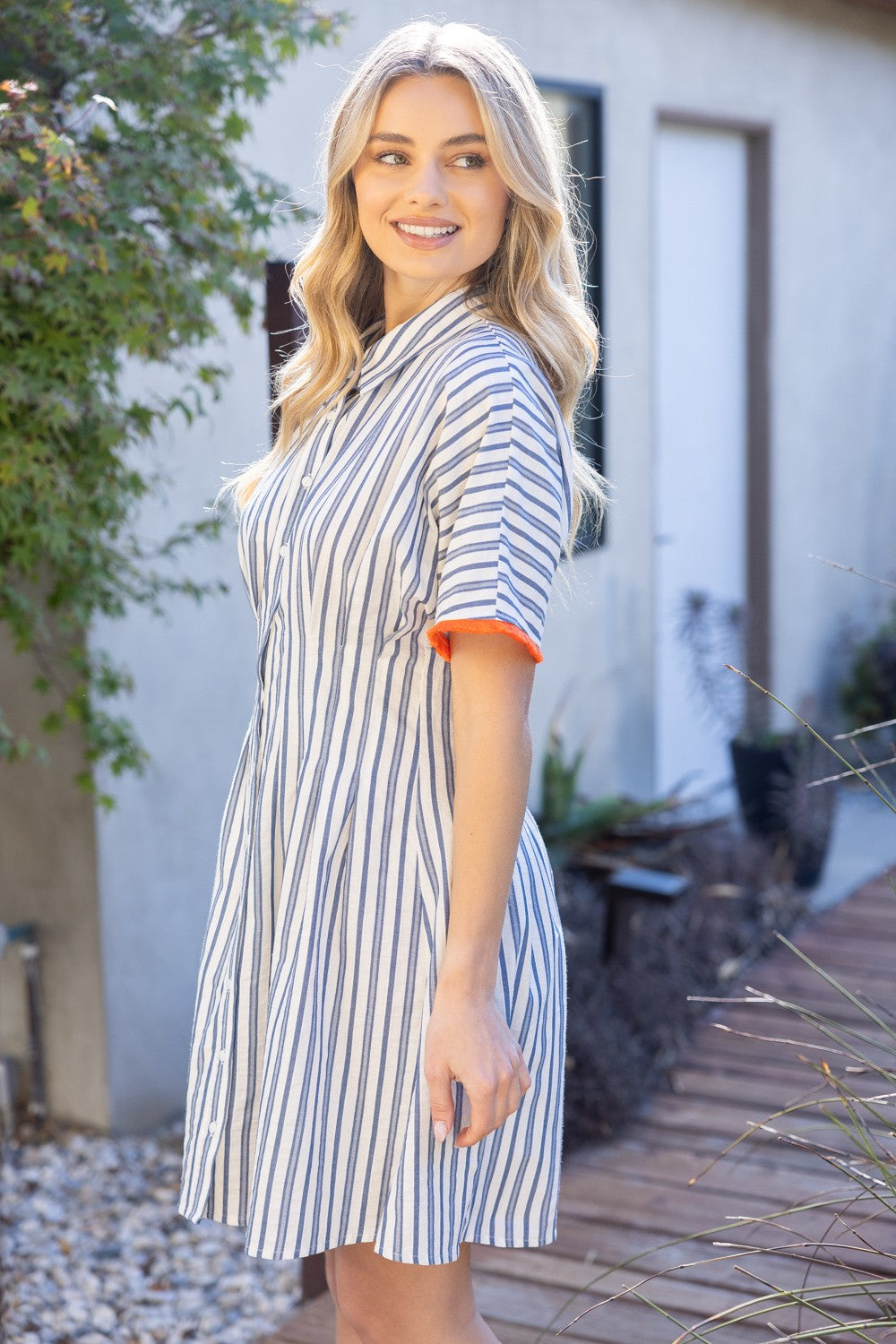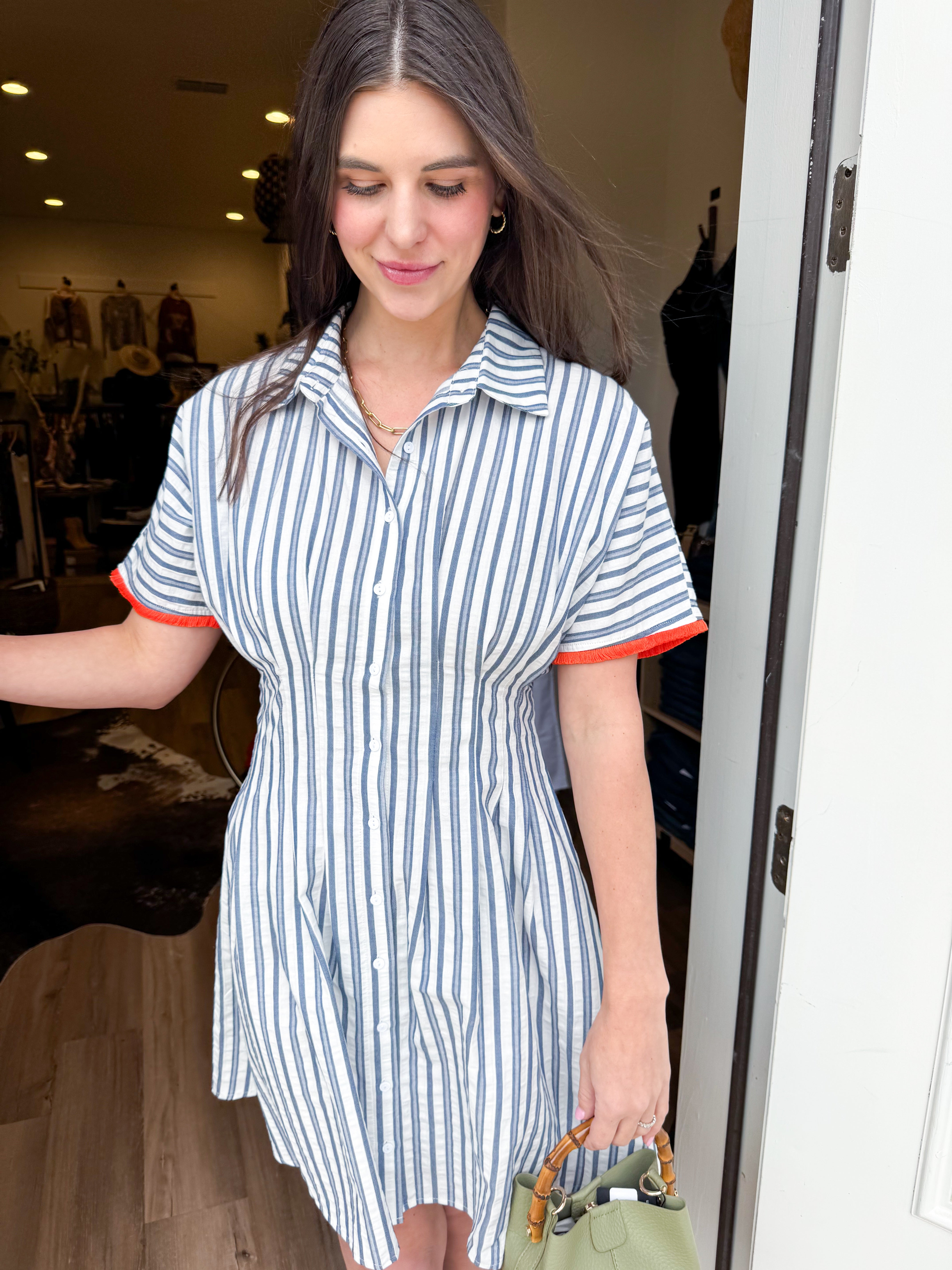 A breezy striped shirt dress with a timeless silhouette and easy fit.