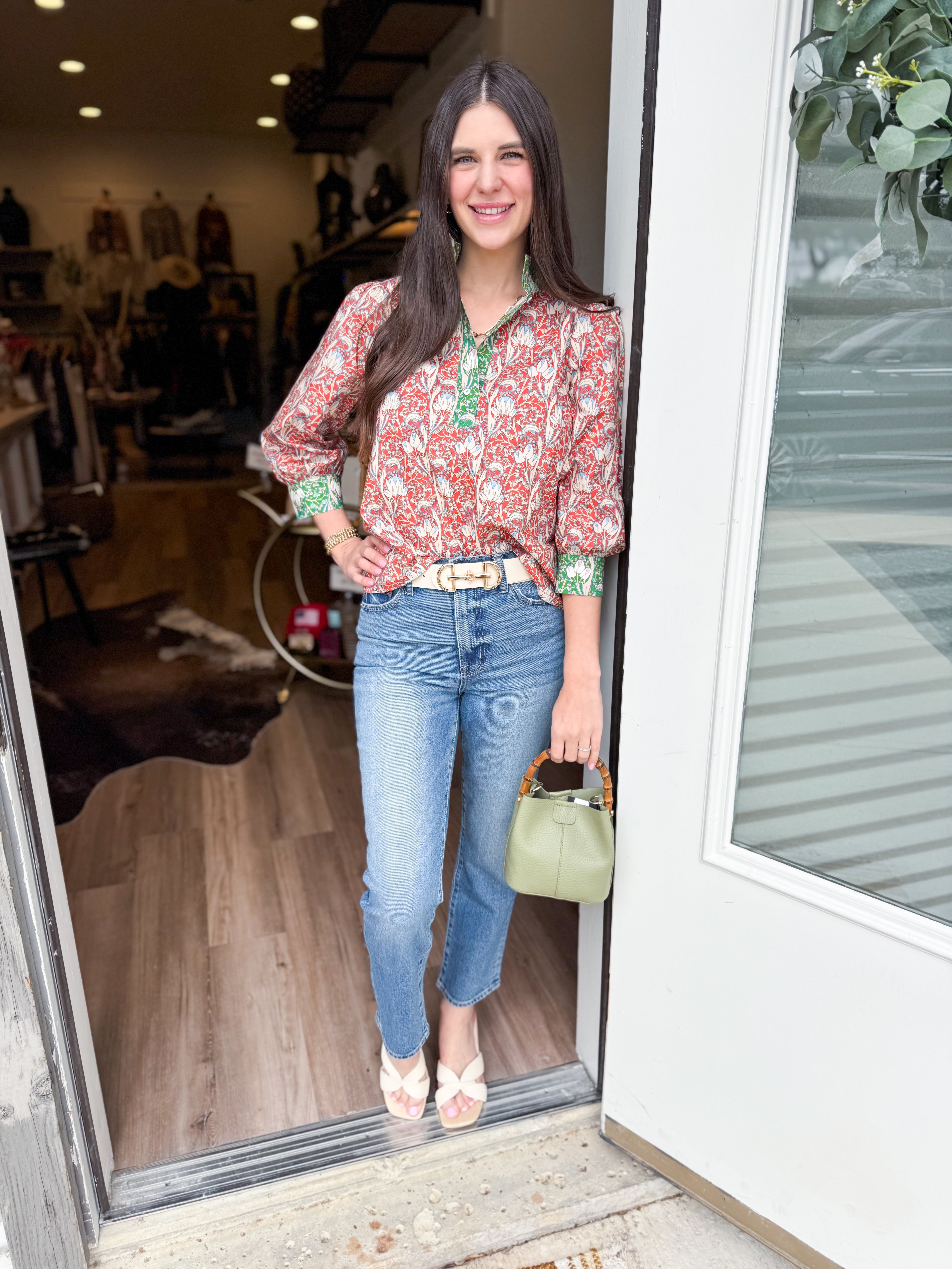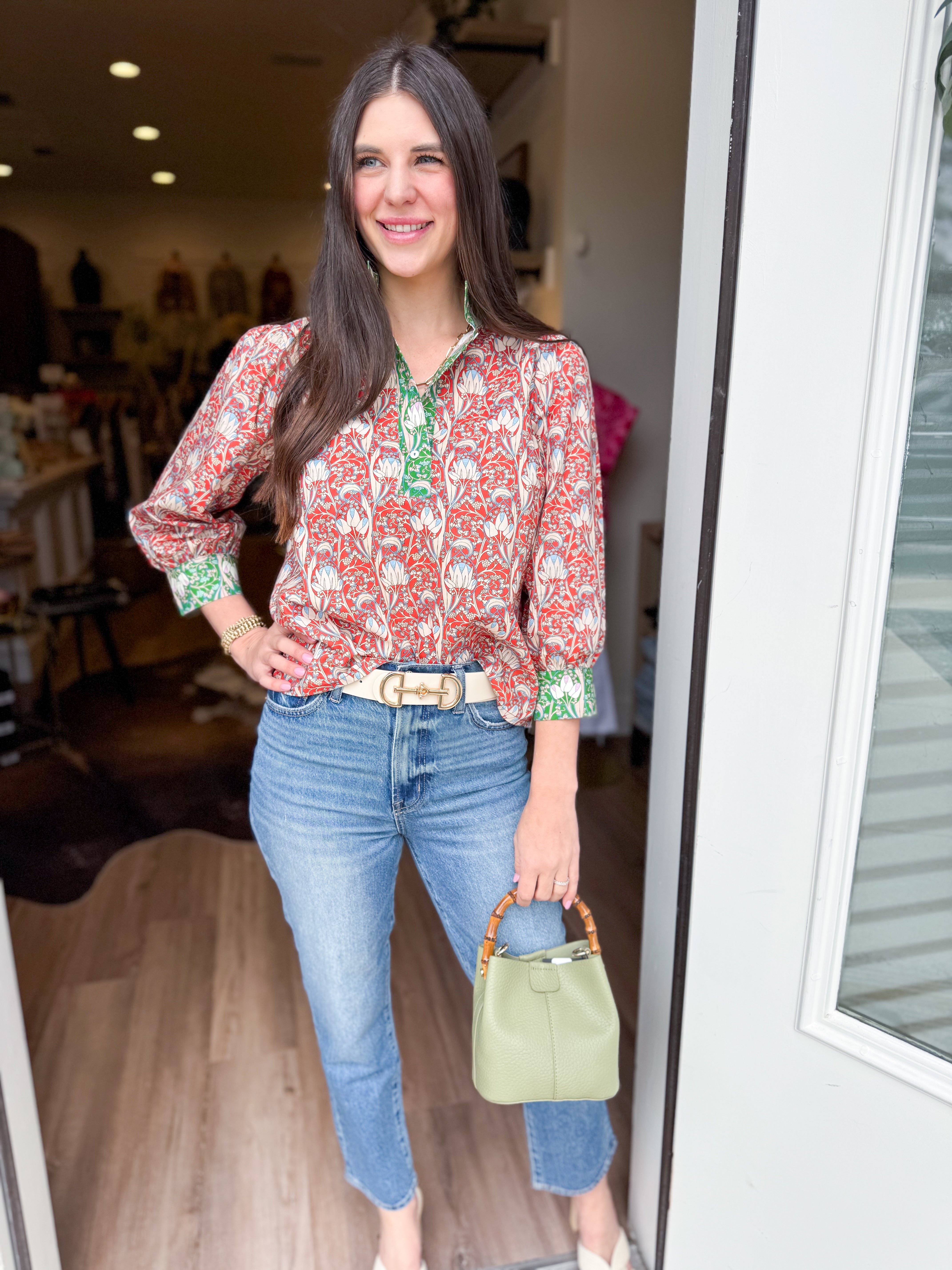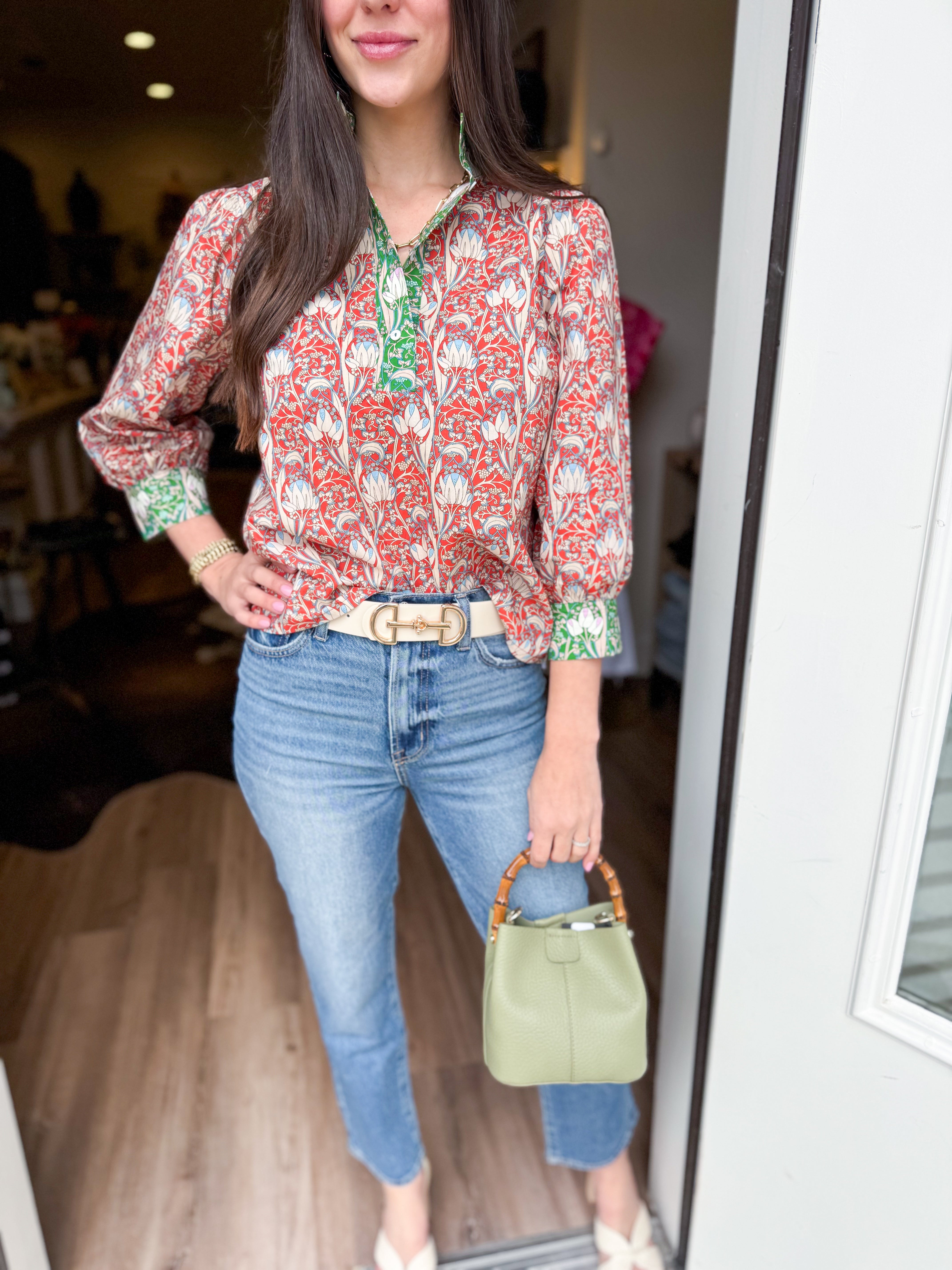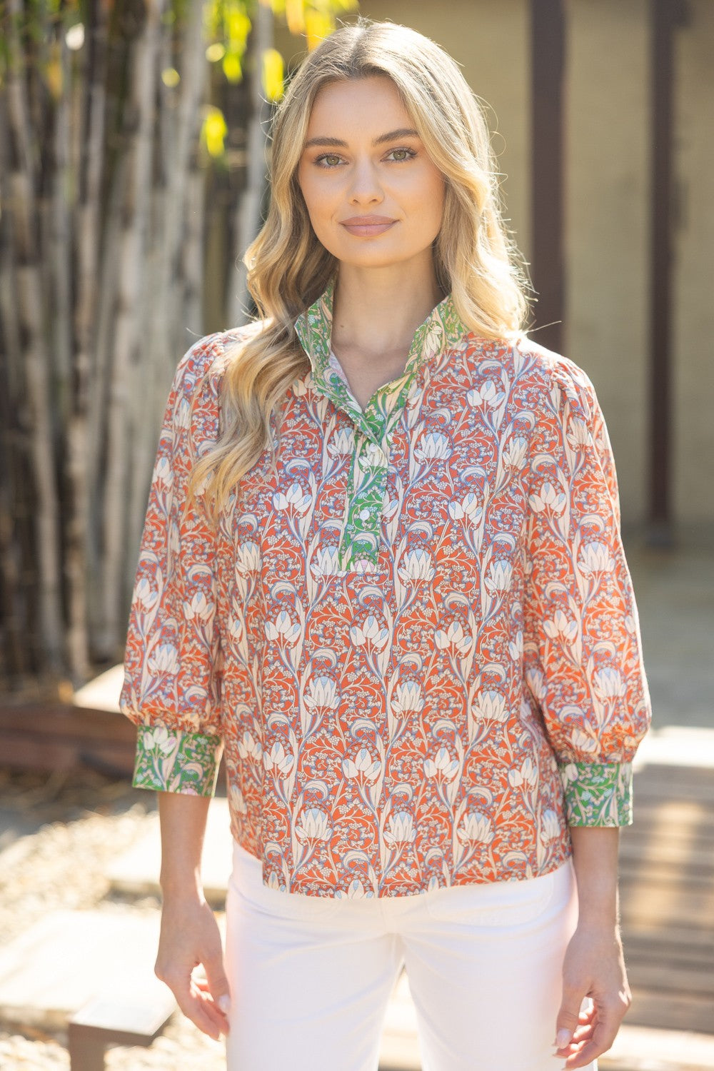 The Ruthie Top brings effortless style to your everyday wardrobe. Featuring a striking wide contrast print with a banded neckline, this piece offers visual interest from every angle. Three-quarter length sleeves with contrast cuffs provide a polished finish, while the quarter button-down closure lets you adjust the fit to your preference. Crafted from a color-block floral mixed woven fabric, this top seamlessly transitions from casual outings to work settings.
