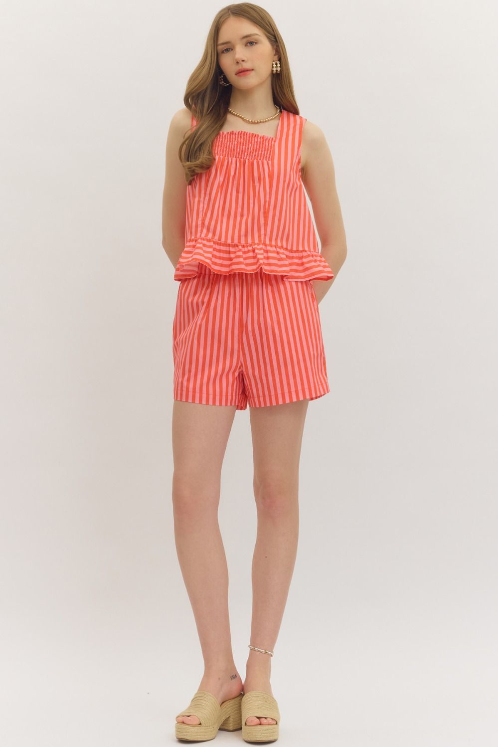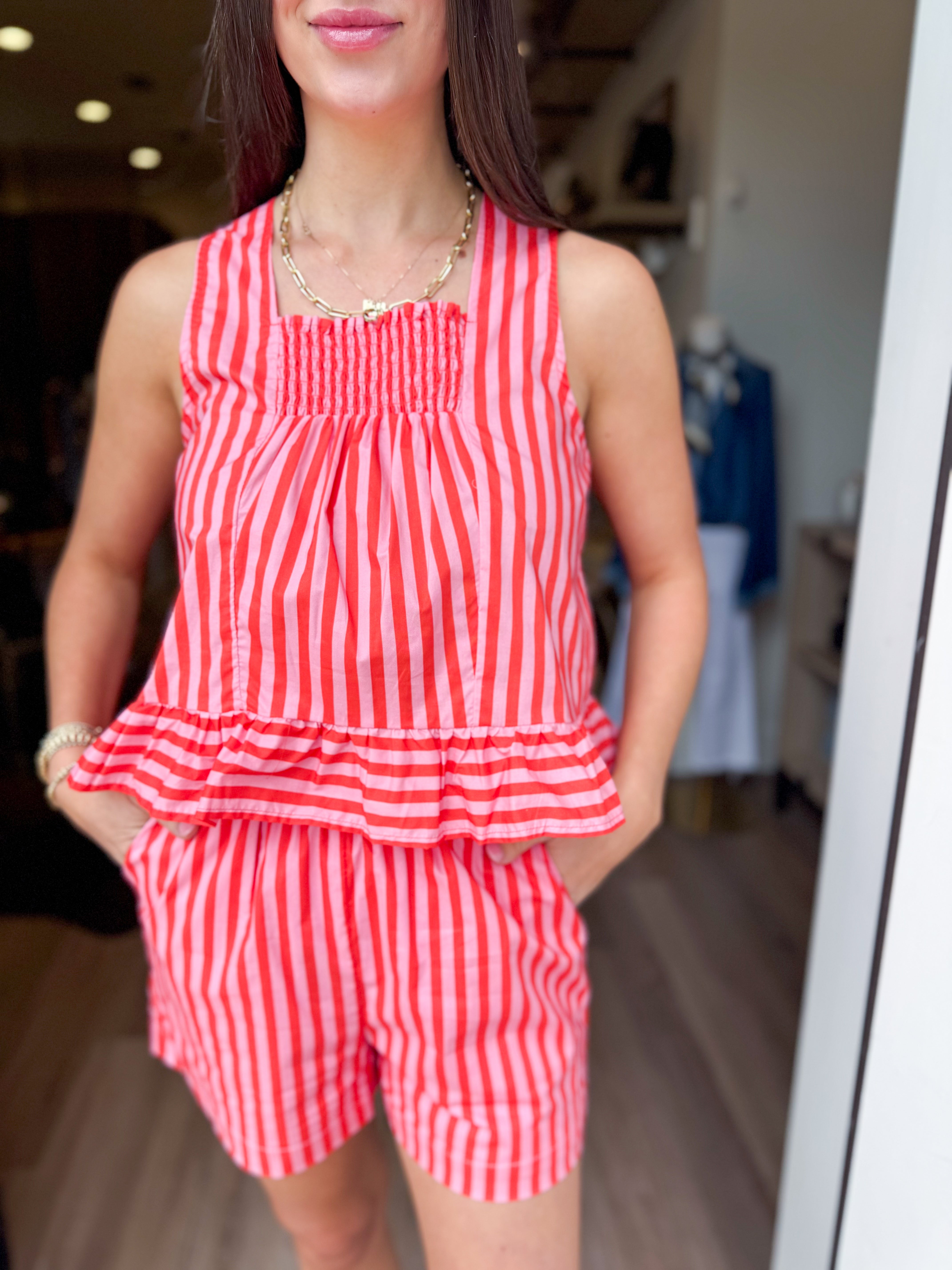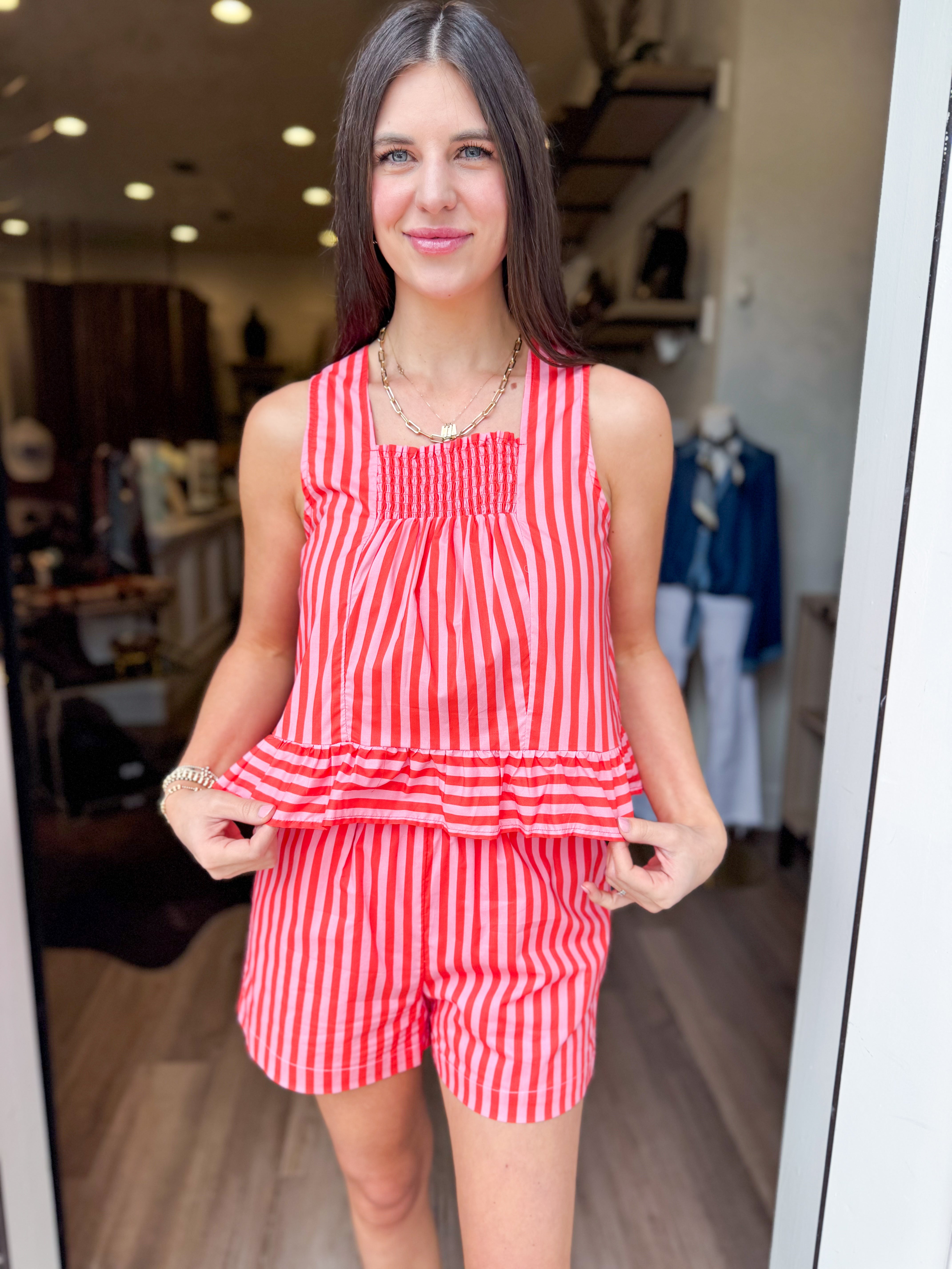 The Set of the Summer! Striped sleeveless peplum top with a playful smocked chest and back detail paired with Striped elastic waist shorts featuring side pockets. Square neckline keeps things fresh and modern. Lightweight 100% cotton construction means you'll stay cool and comfy all day long. Perfect for casual outings or dressing up for special occasions.