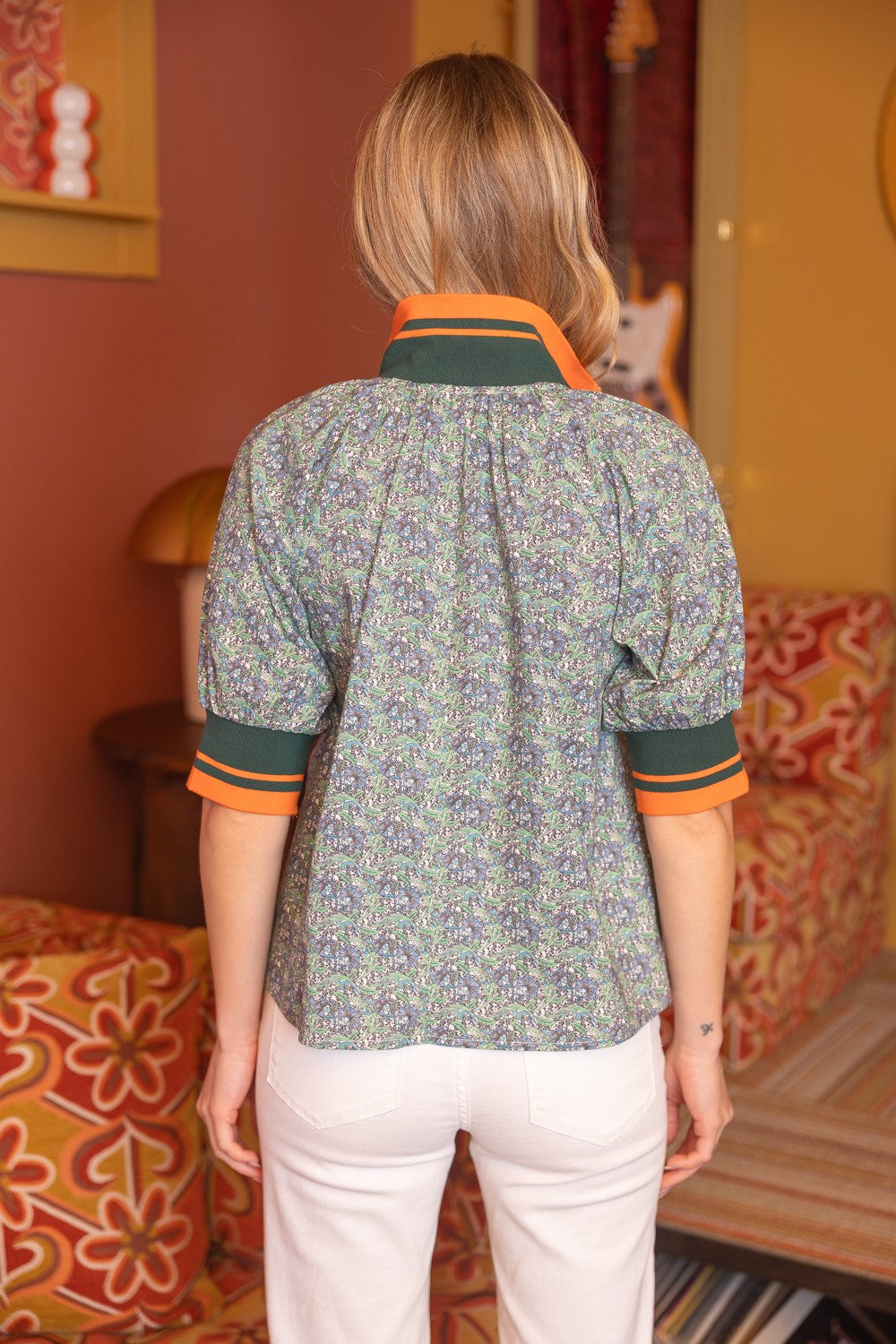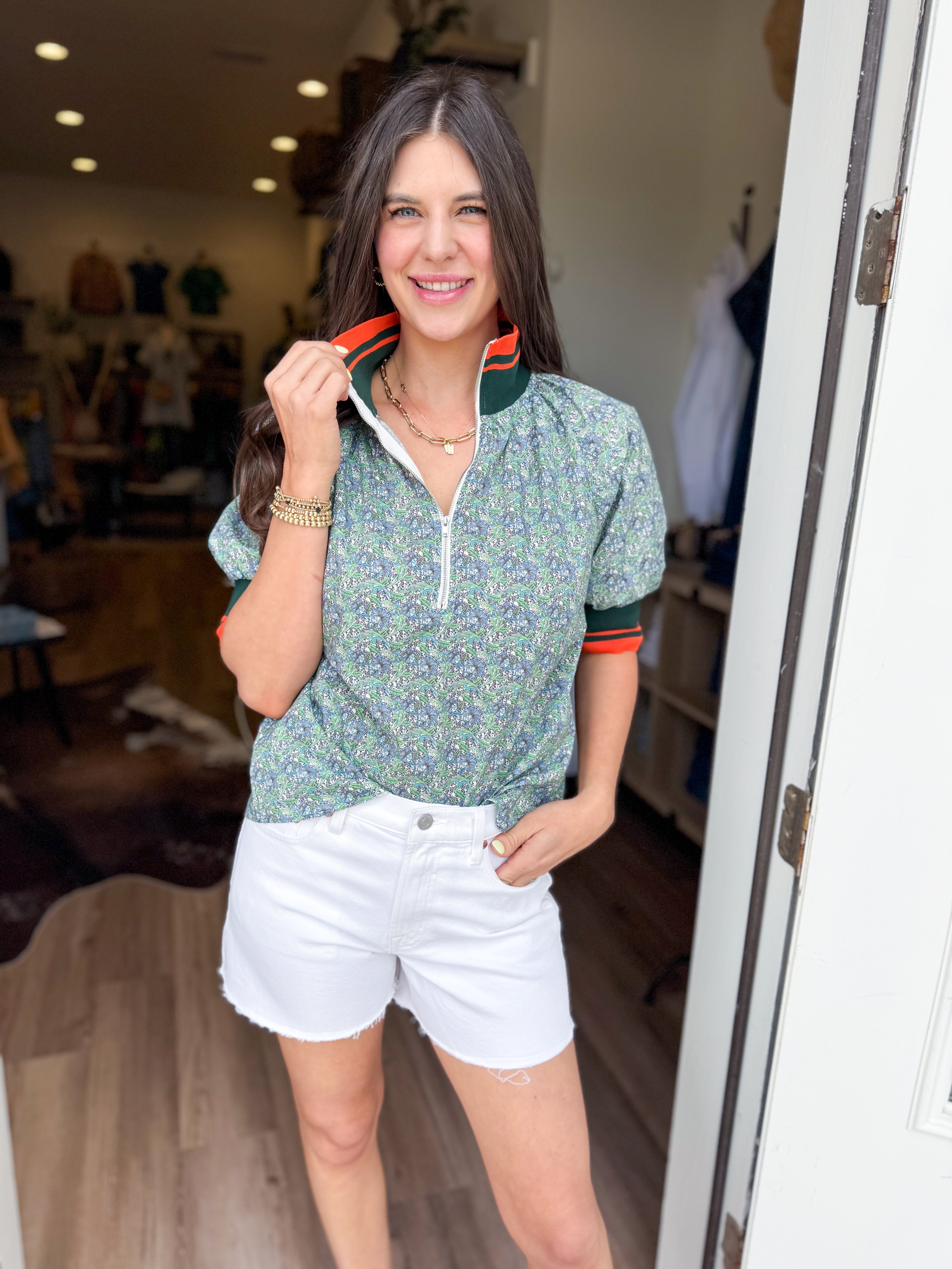 The Chic Girl Half Zip Top brings effortless style with its sleek metal half-zip neckline and playful short puff sleeves. Striped ribbed knit trim at the neck and cuffs adds a polished finishing touch, while the printed woven fabric keeps things fresh and on-trend. Perfect for layering or wearing solo, this top is your go-to for casual days with serious style.