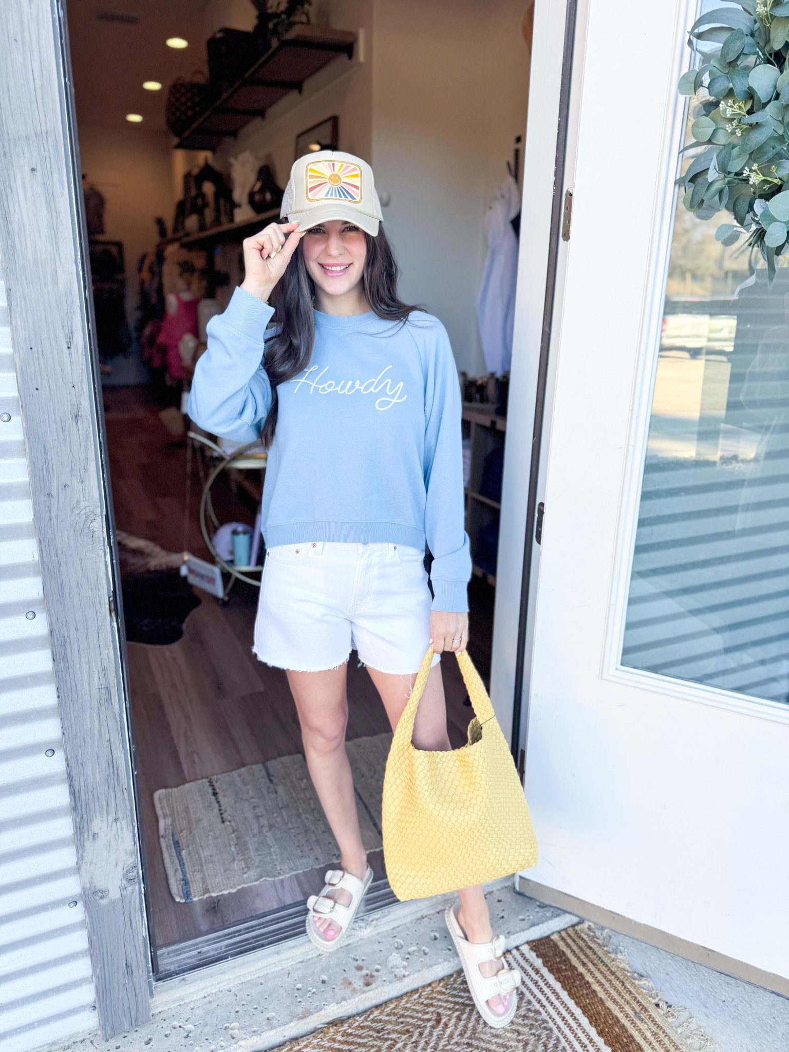 Introducing the Howdy Fleece Sweatshirt by Z Supply, a blend of cozy and cool style in Coastal Blue. Featuring long sleeves and crafted from a signature fleece fabric with 60% Cotton and 40% Polyester, this sweatshirt ensures all-day warmth and softness. This relaxed fit piece sports a classic crew neck and an embroidered front graphic, perfect for a stylish casual look. Easy to care for, simply machine wash cold on a gentle cycle, and tumble dry low or lay flat to dry.