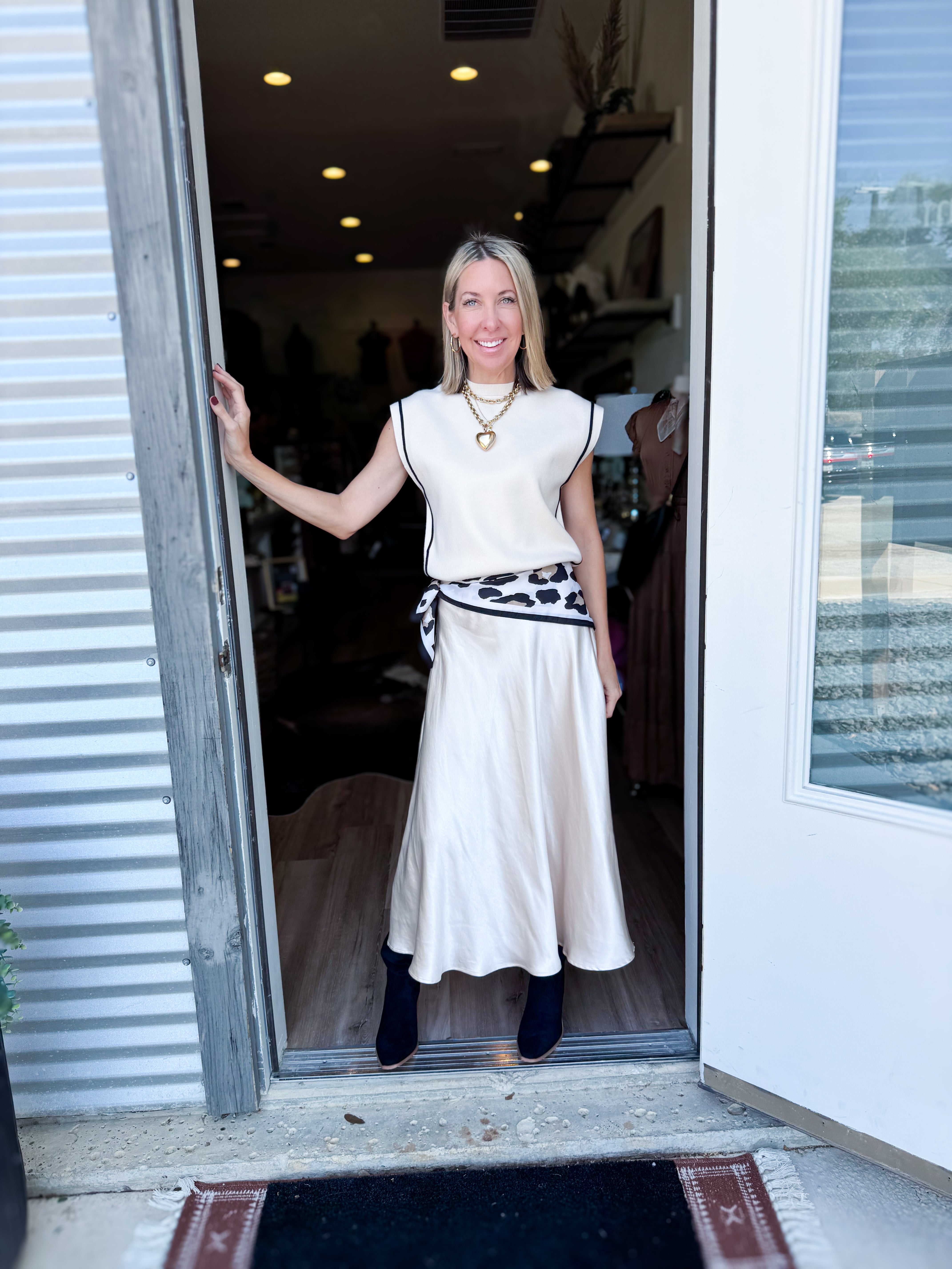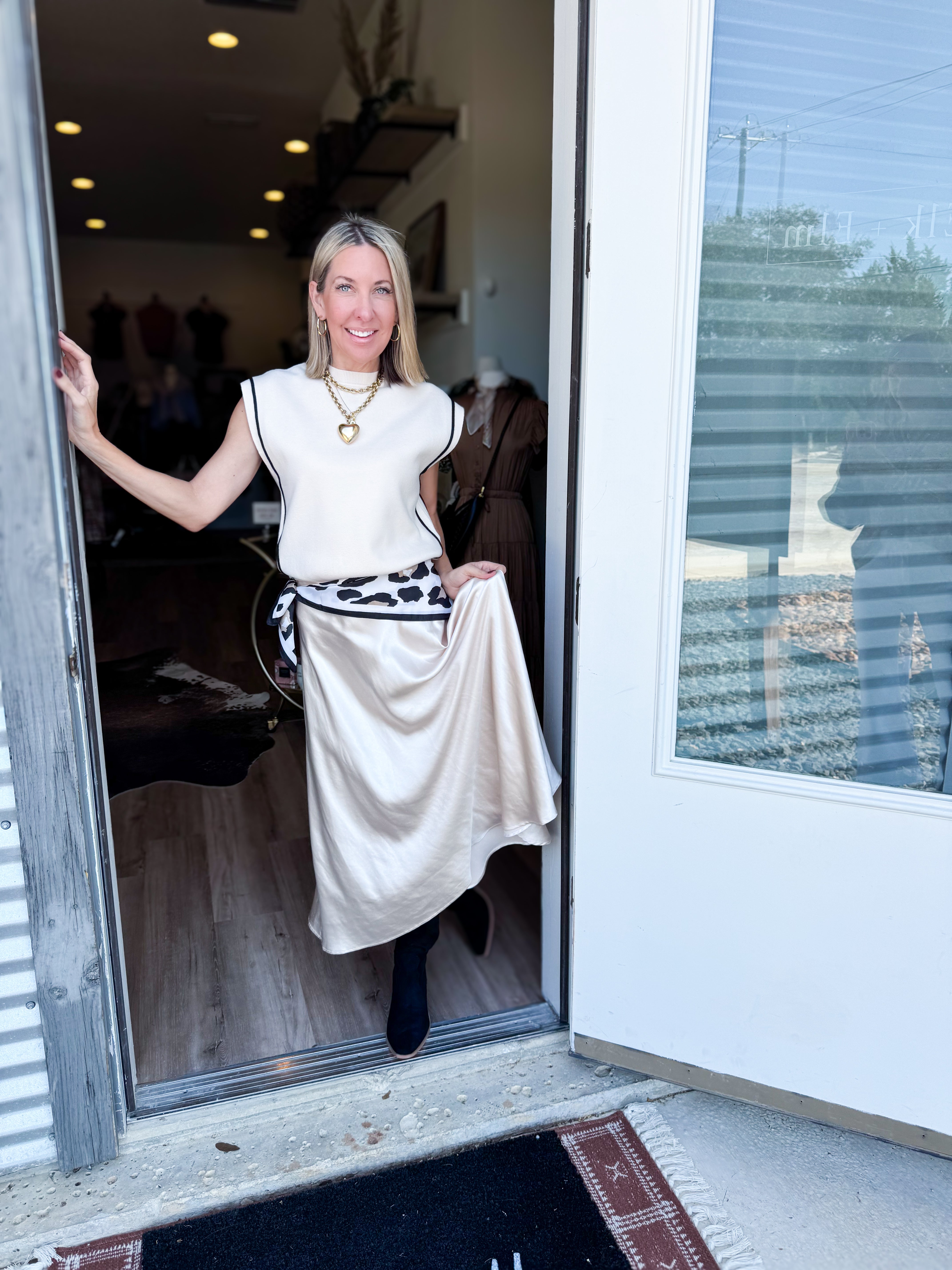 Step out with confidence in this midi-length woven flare skirt, designed to move with you and turn heads. The hidden side zipper keeps the silhouette sleek while making it easy to slip on and off. Perfect for twirling through your day with a playful bounce!