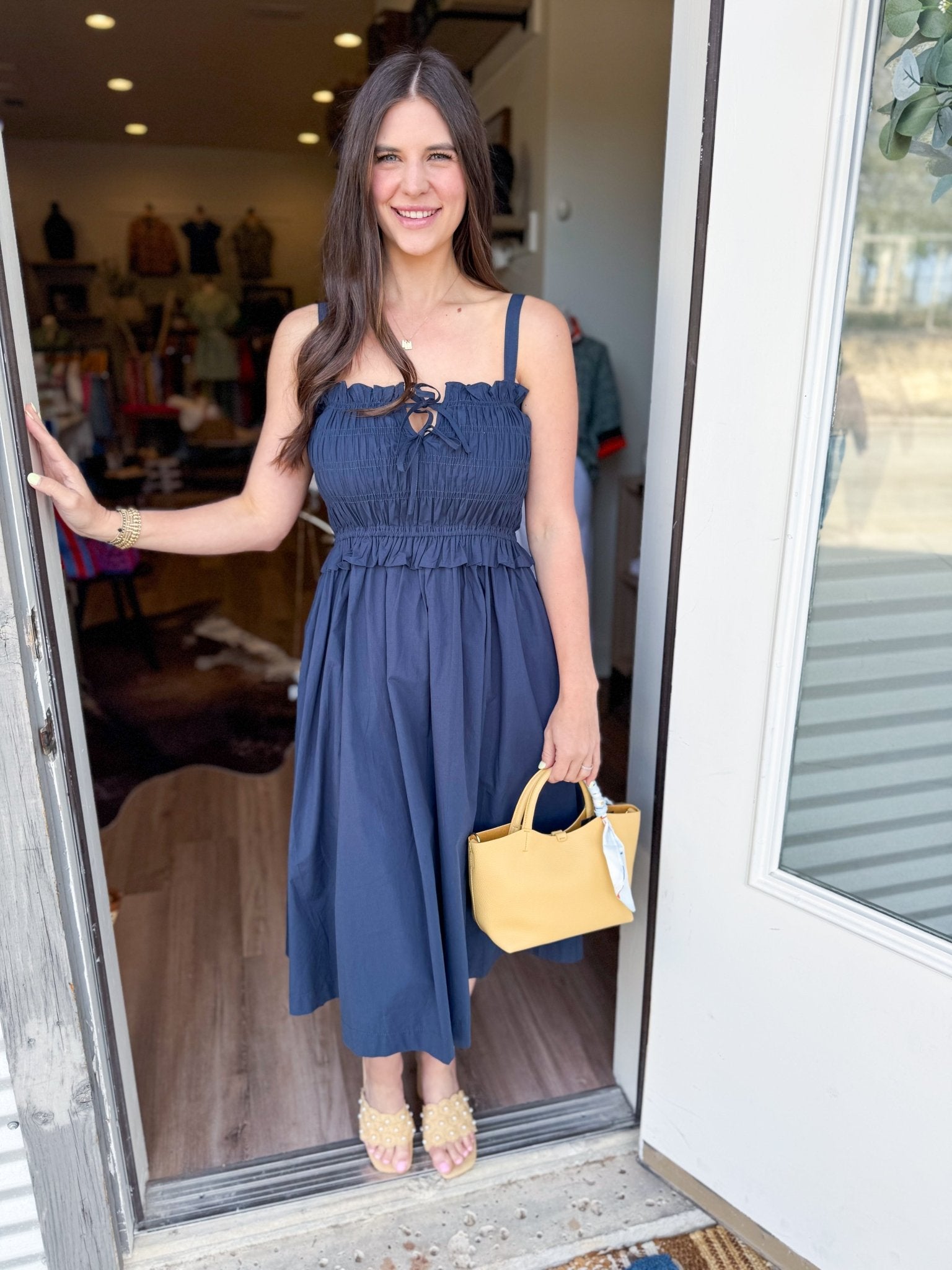 Navy Breeze Dress features a flattering smocked bodice that provides comfortable stretch and movement throughout your day. The midi length offers a timeless silhouette perfect for casual outings or dressed-up occasions. Crafted in a rich navy tone, this versatile piece pairs effortlessly with your favorite accessories and footwear. The smocking detail adds texture and visual interest while allowing the fabric to move with you.