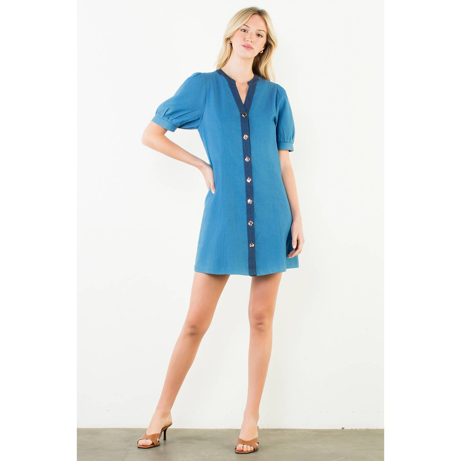 Short Sleeve Denim Button Up Dress . / Style Measurements for Size S / Designed in USA - Body Length: 36 in - Bust Width: 36 in - Sleeve Length: 15 in . / Model Sizes - Wearing Size S - Height 5' 9", Bust 32", Waist 25 1/2", Hips 36" . / Prepack Contents - In a Pack of XS(1), S(2), M(2), and L(1) per Color Only . / Fabric Content - WOVEN / 65% Cotton, 33% Polyester, 2% Spandex