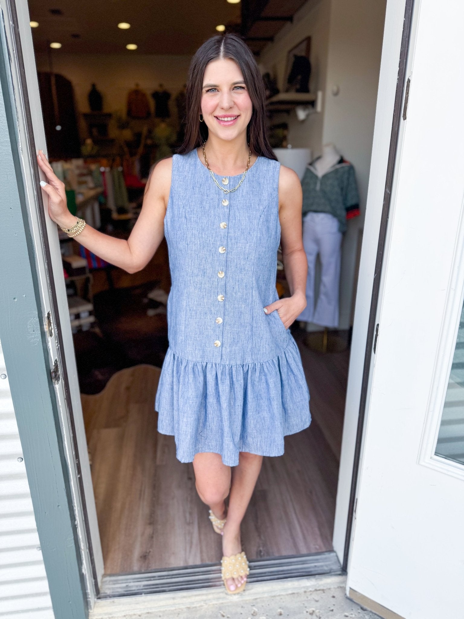 Effortless elegance meets playful style with the Skyline Mini Dress. This sleeveless design features a classic button-down front and a charming flounce skirt that adds movement and dimension to every step. Perfect for warm-weather outings, casual dates, or weekend adventures.