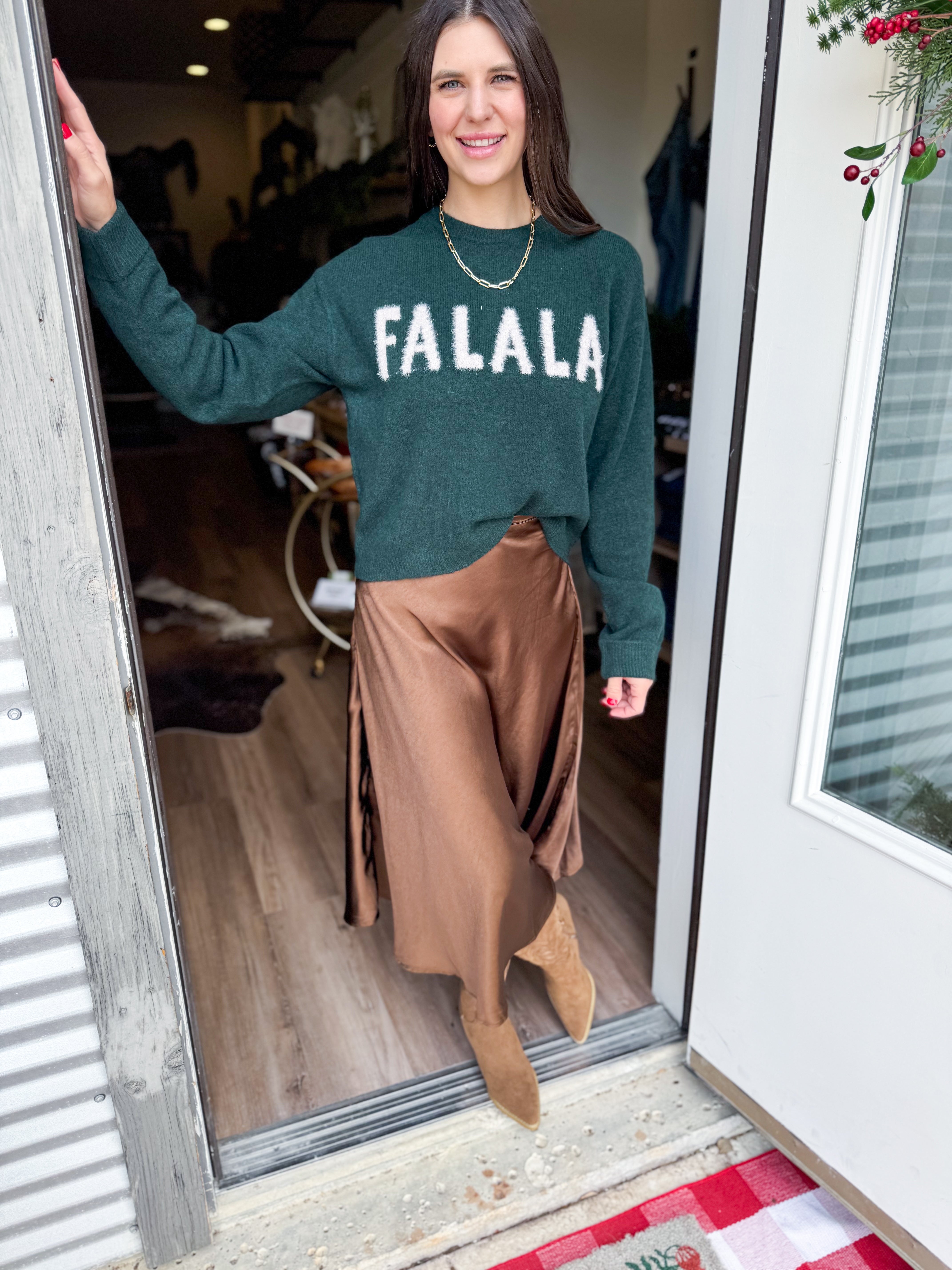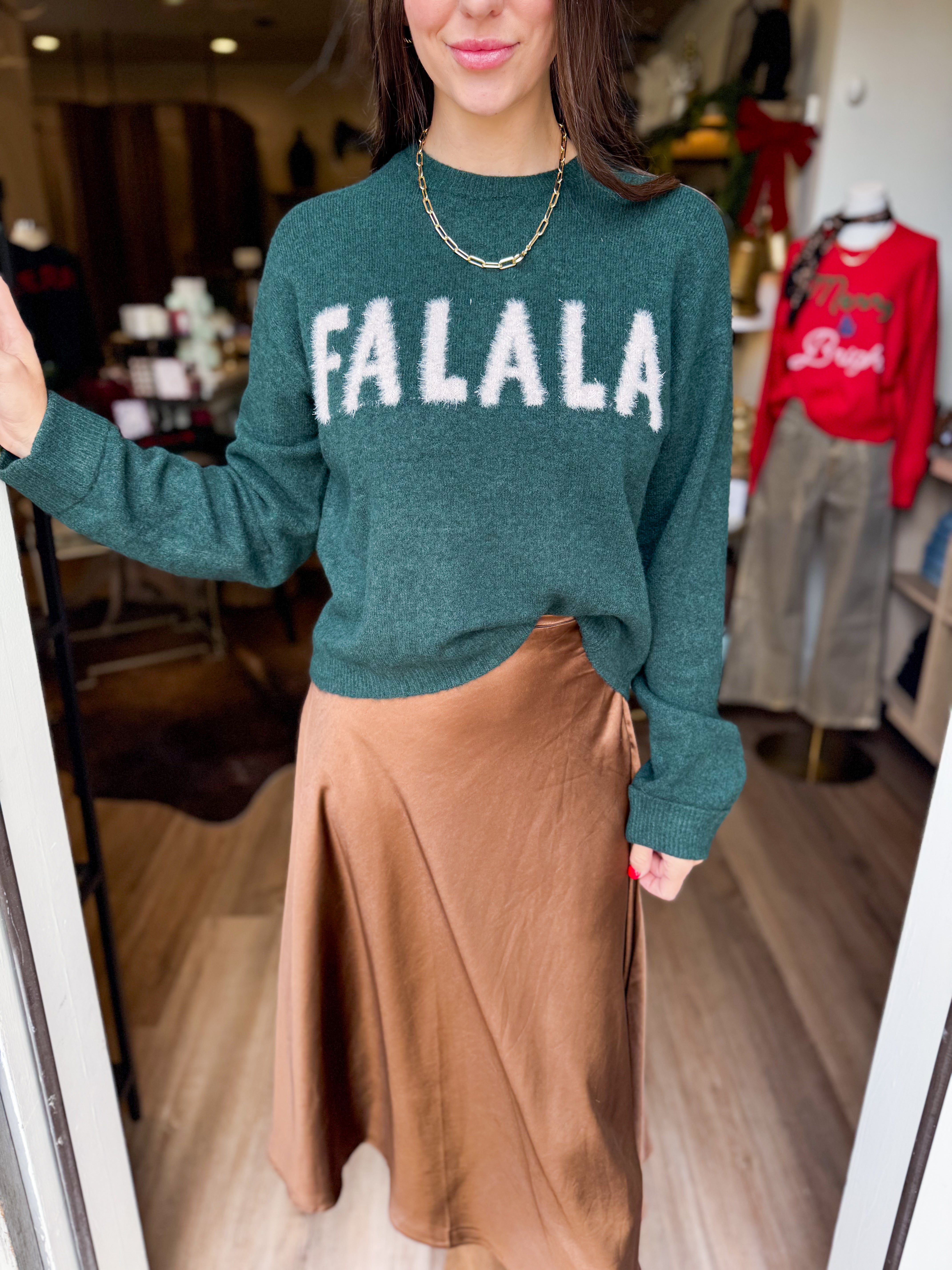 Festive without trying too hard, this crewneck sweater features metallic “Fa La La” intarsia on a cozy midweight knit. It’s playful, soft, and made for everything from casual get-togethers to relaxed days at home.