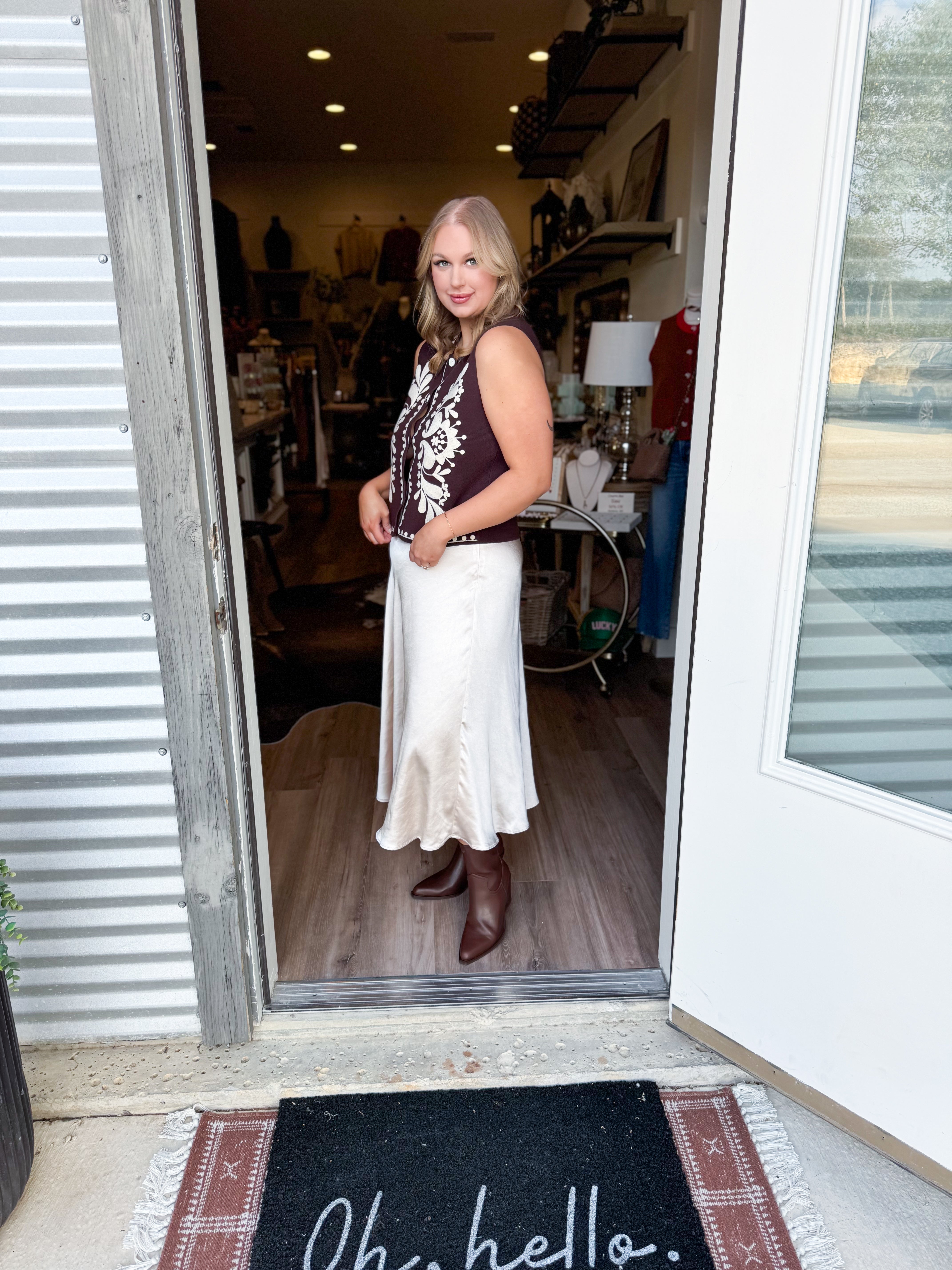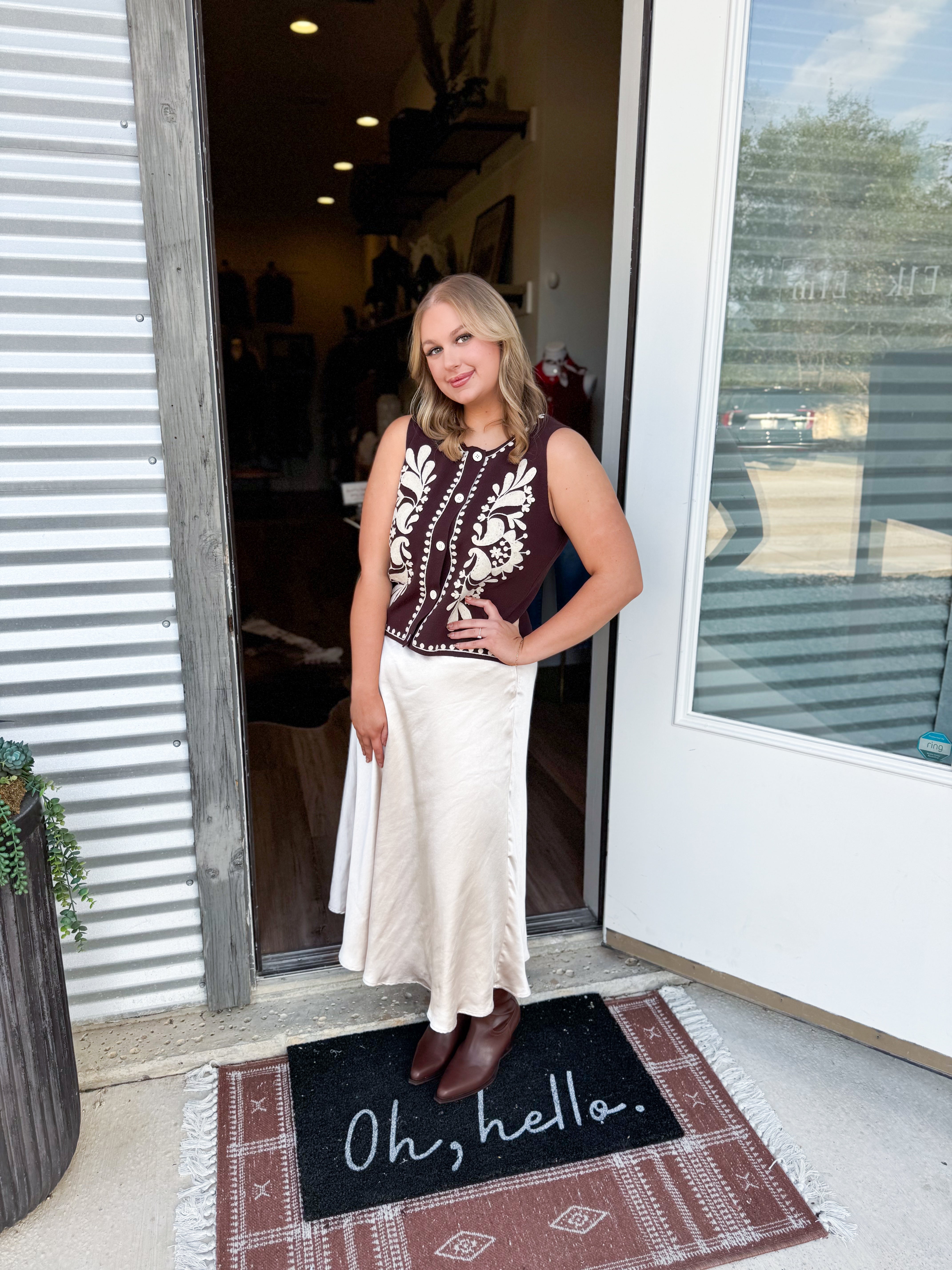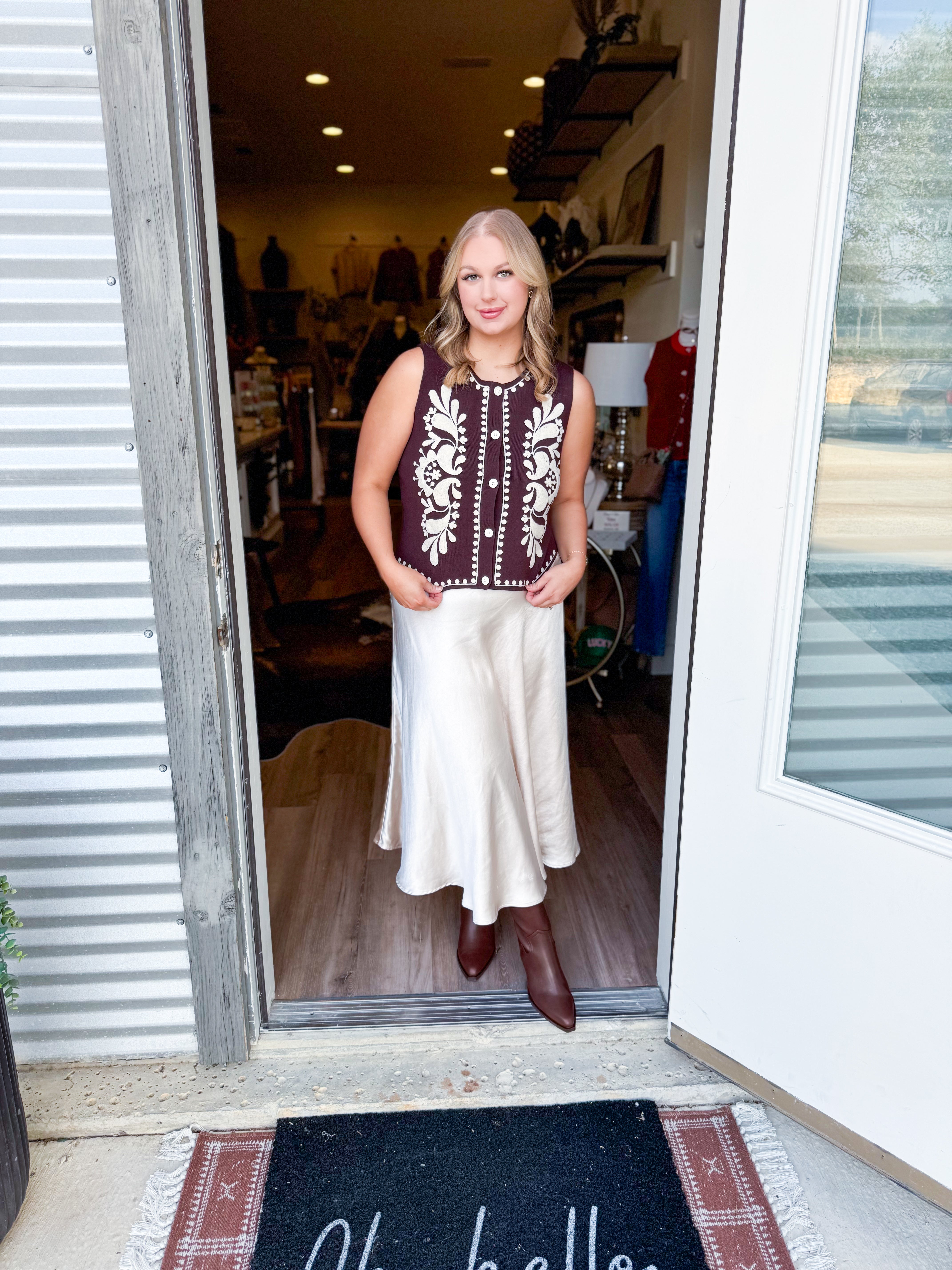 Elevate your look with this playful sleeveless vest top crafted from soft knit fabric. Featuring a button-down front and a charming round neck, it’s adorned with vibrant floral embroidery that brings a fresh, fun vibe to your outfit. Perfect for layering or wearing solo, this top adds a touch of whimsy and warmth to any wardrobe.