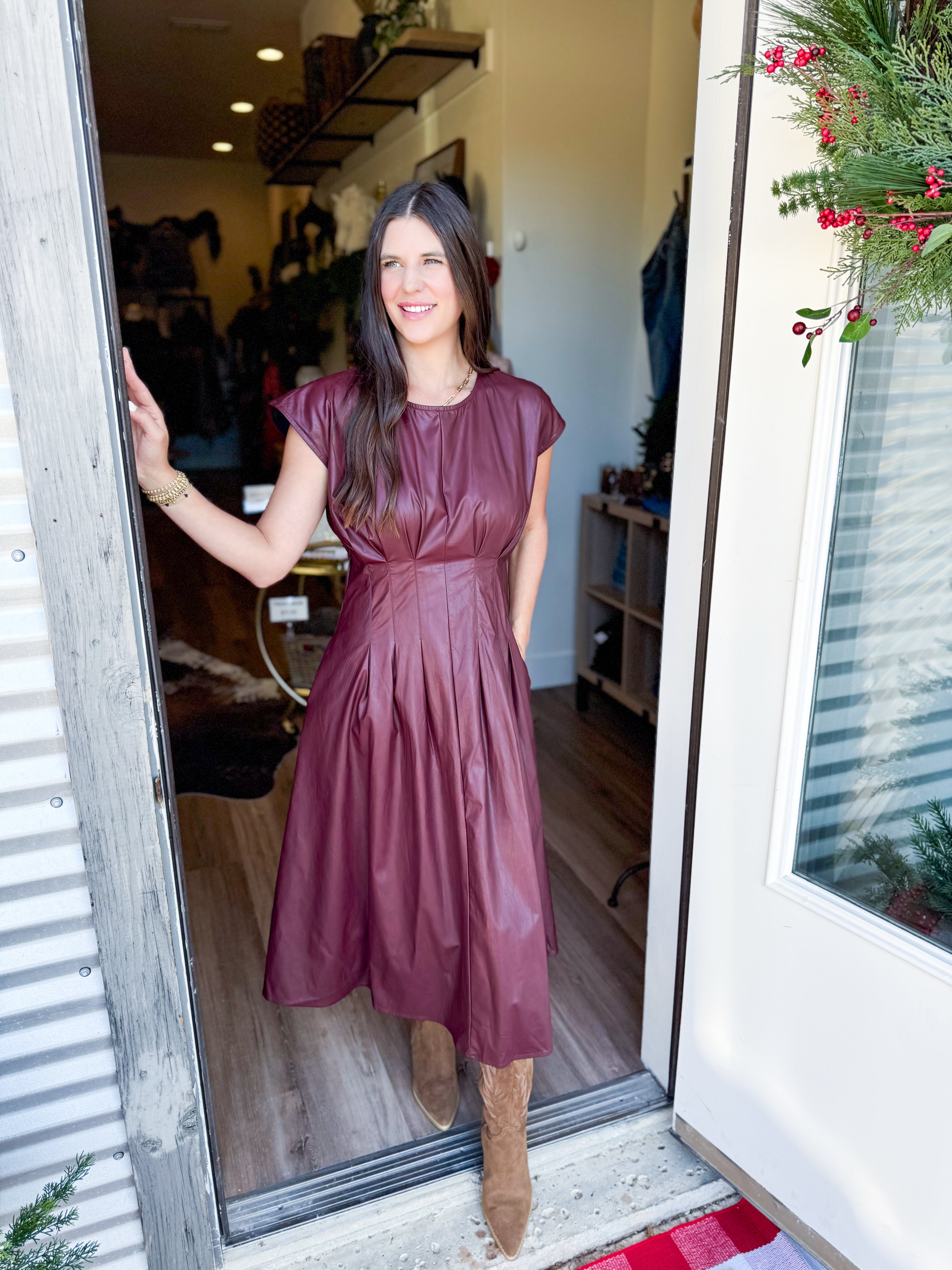 Meet the Peyton Dress—your new favorite way to turn heads. This sleek sleeveless leather number features gorgeous detailing at the waistline that hugs you in all the right ways. The rich leather fabric brings serious edge and sophistication, while the minimalist silhouette lets that waistline magic do all the talking.