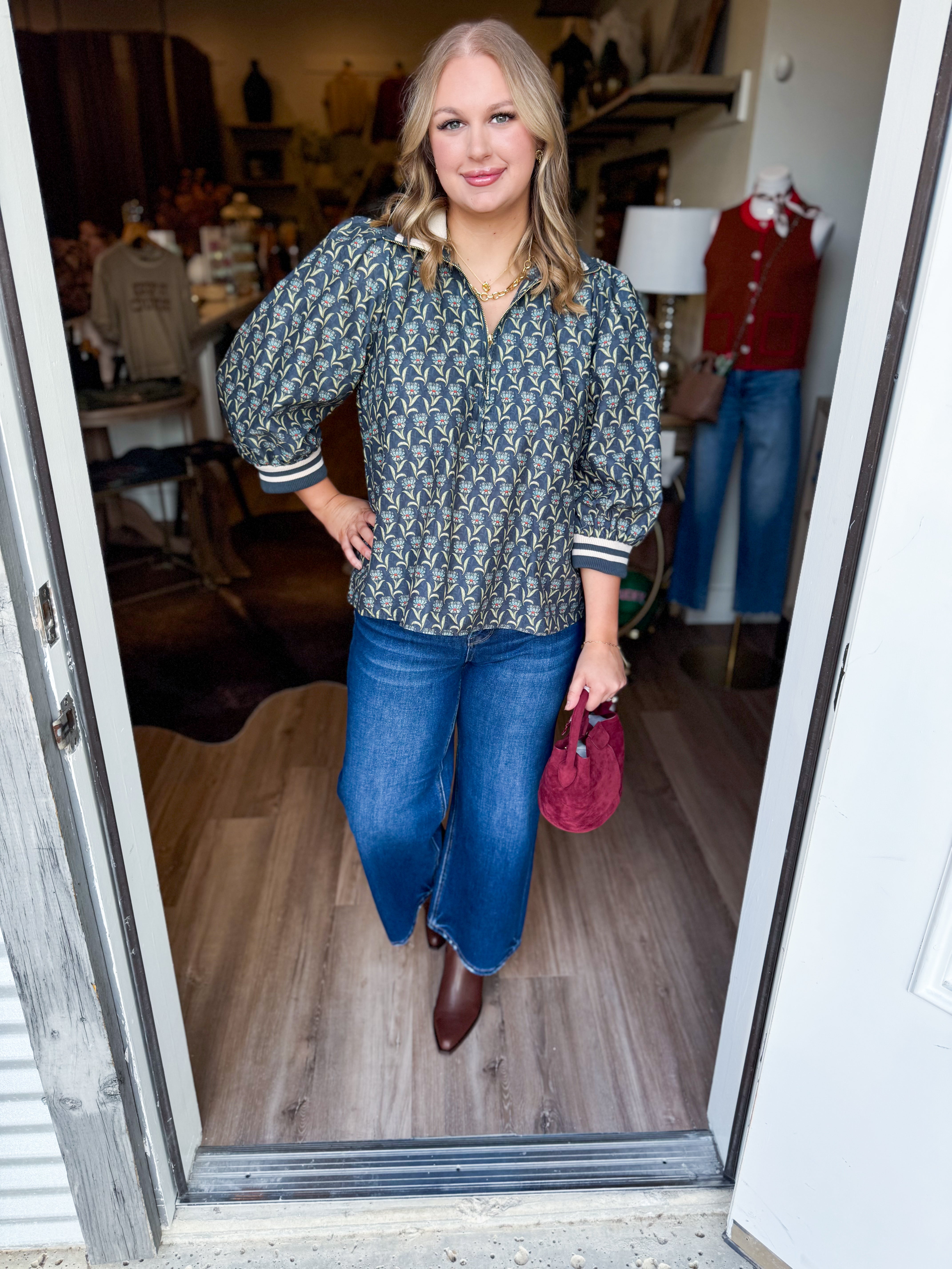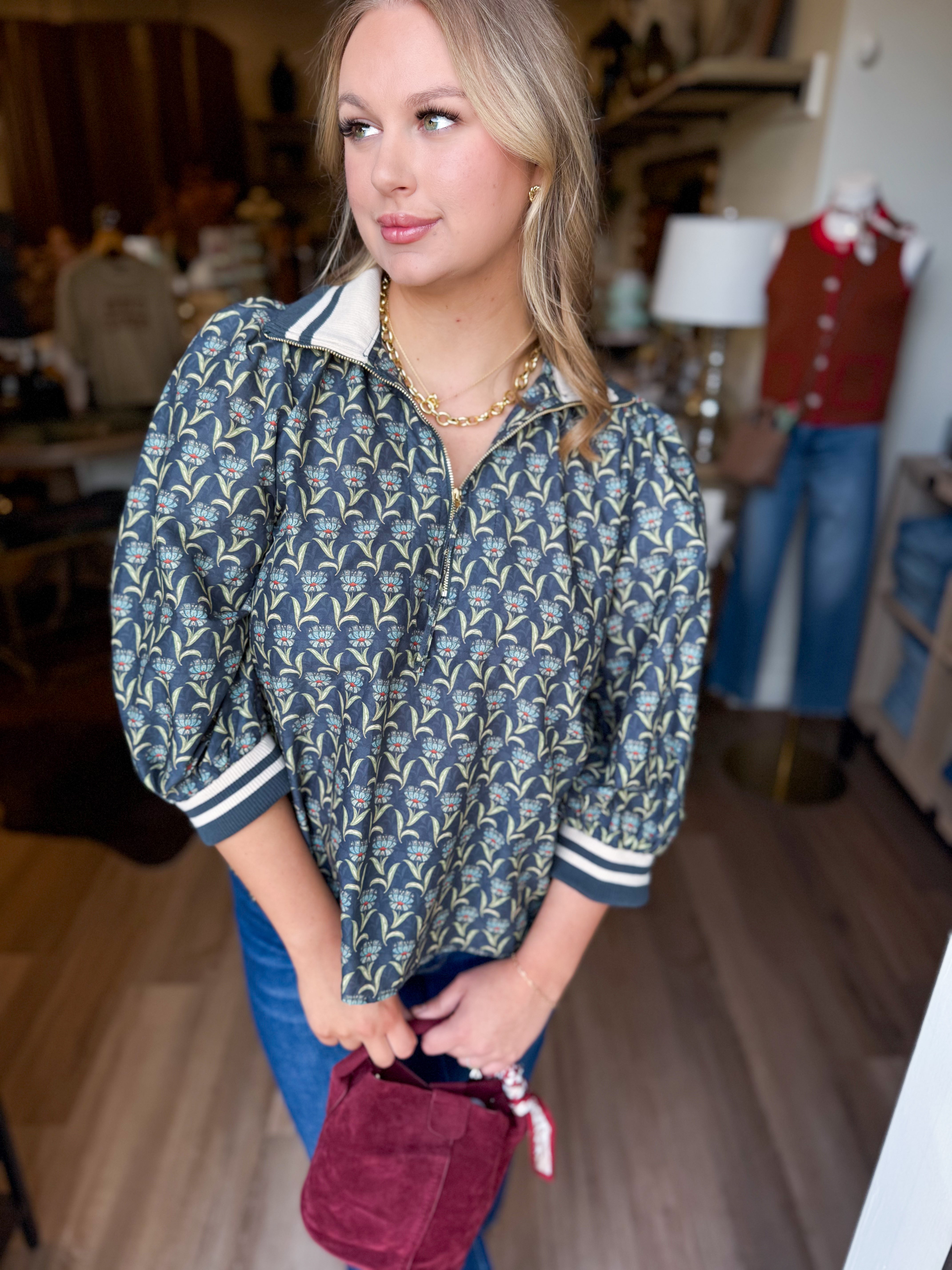 The Addison Top brings a fun twist to your wardrobe with its floral print and charming 3/4 puff sleeves. Featuring a half-zip front for easy style and a bold contrast stripe on the ribbed stand collar and cuffs, this top adds a playful pop to any outfit. Perfect for those who love comfort with a splash of personality!