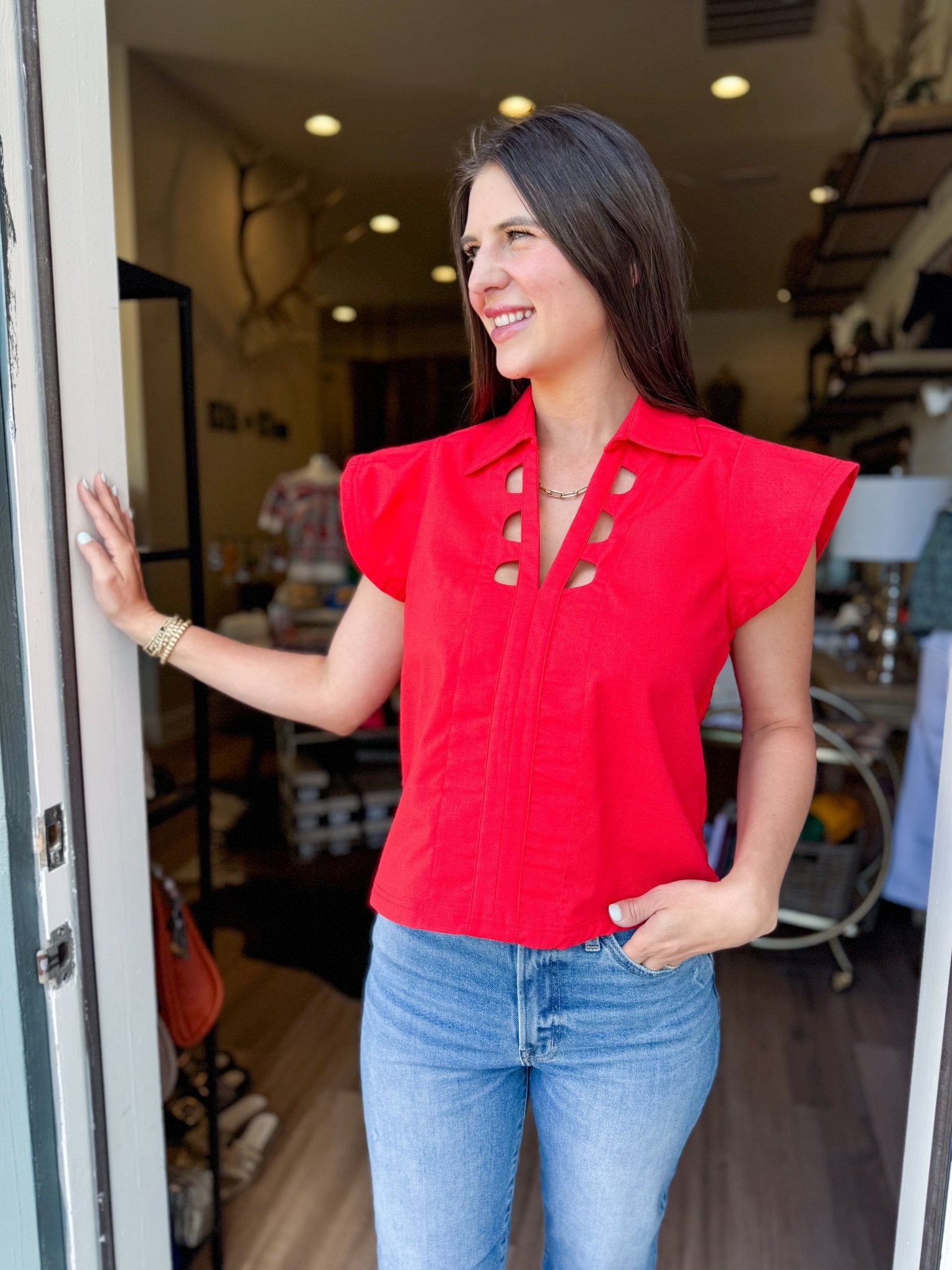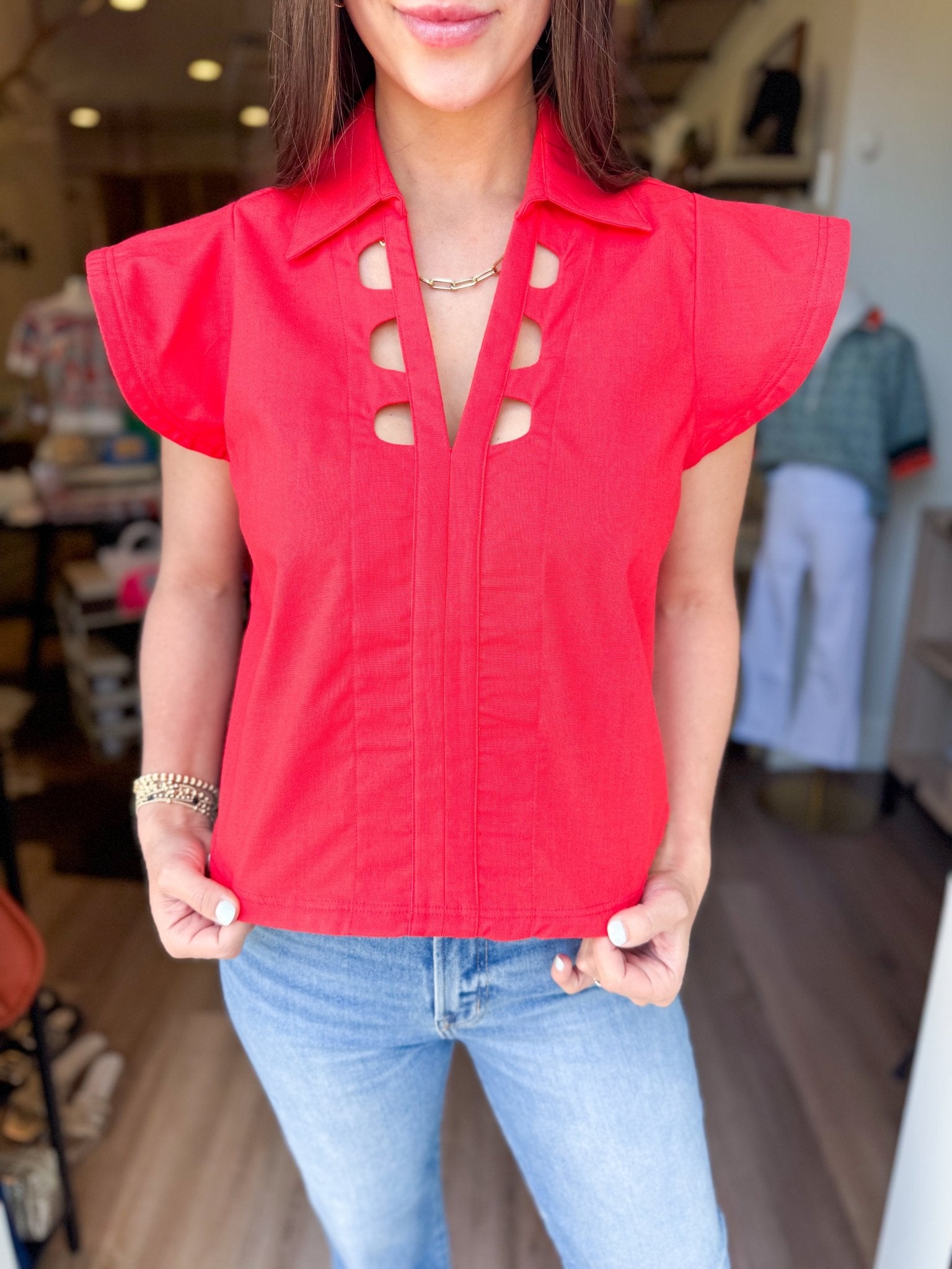 A timeless wardrobe essential with modern edge. This short-sleeve top features a striking cutout detail at the neckline, adding visual interest and sophistication to any outfit. The classic crimson hue pairs effortlessly with jeans, skirts, or tailored trousers. Comfortable fit designed for all-day wear.
