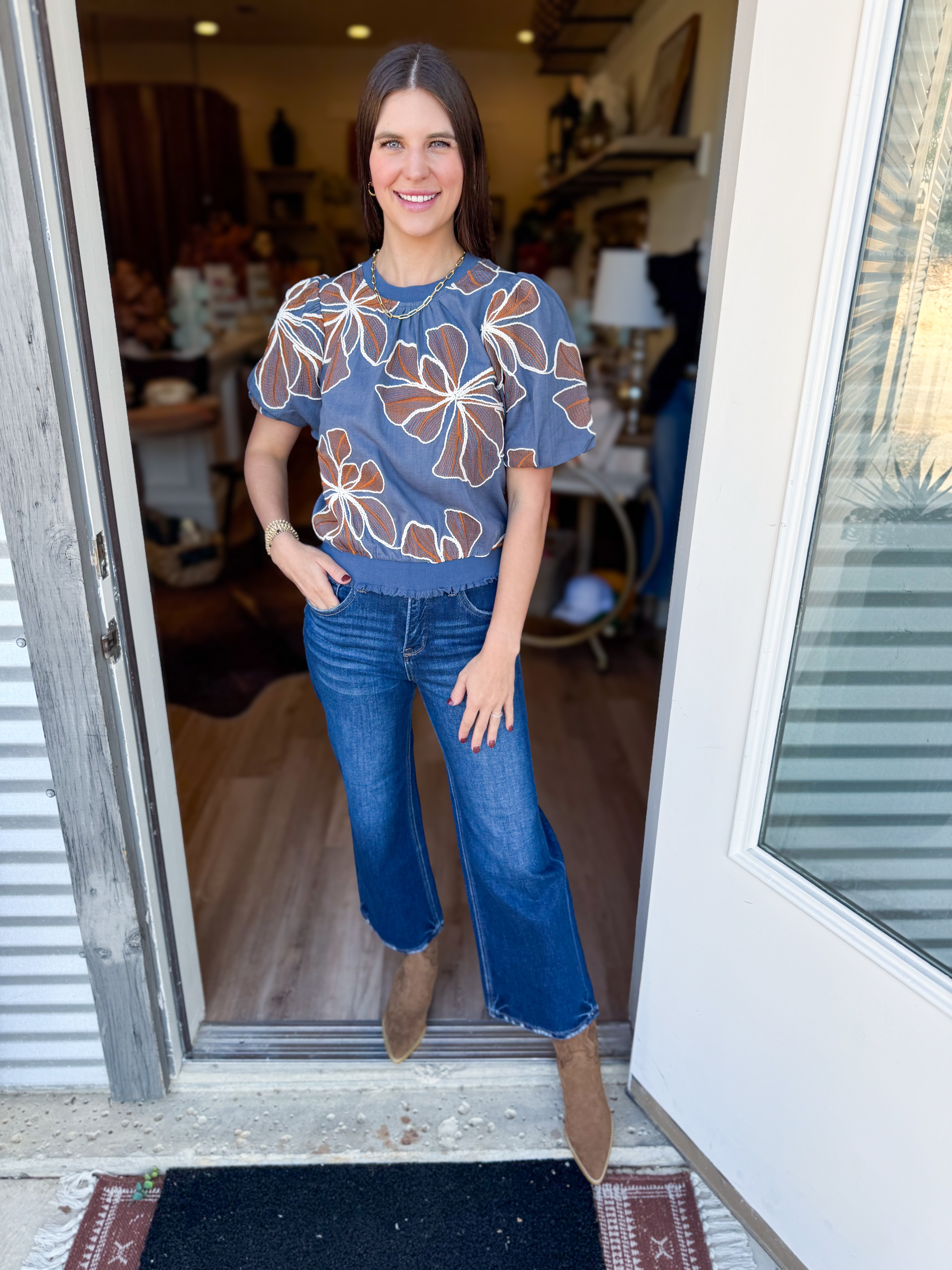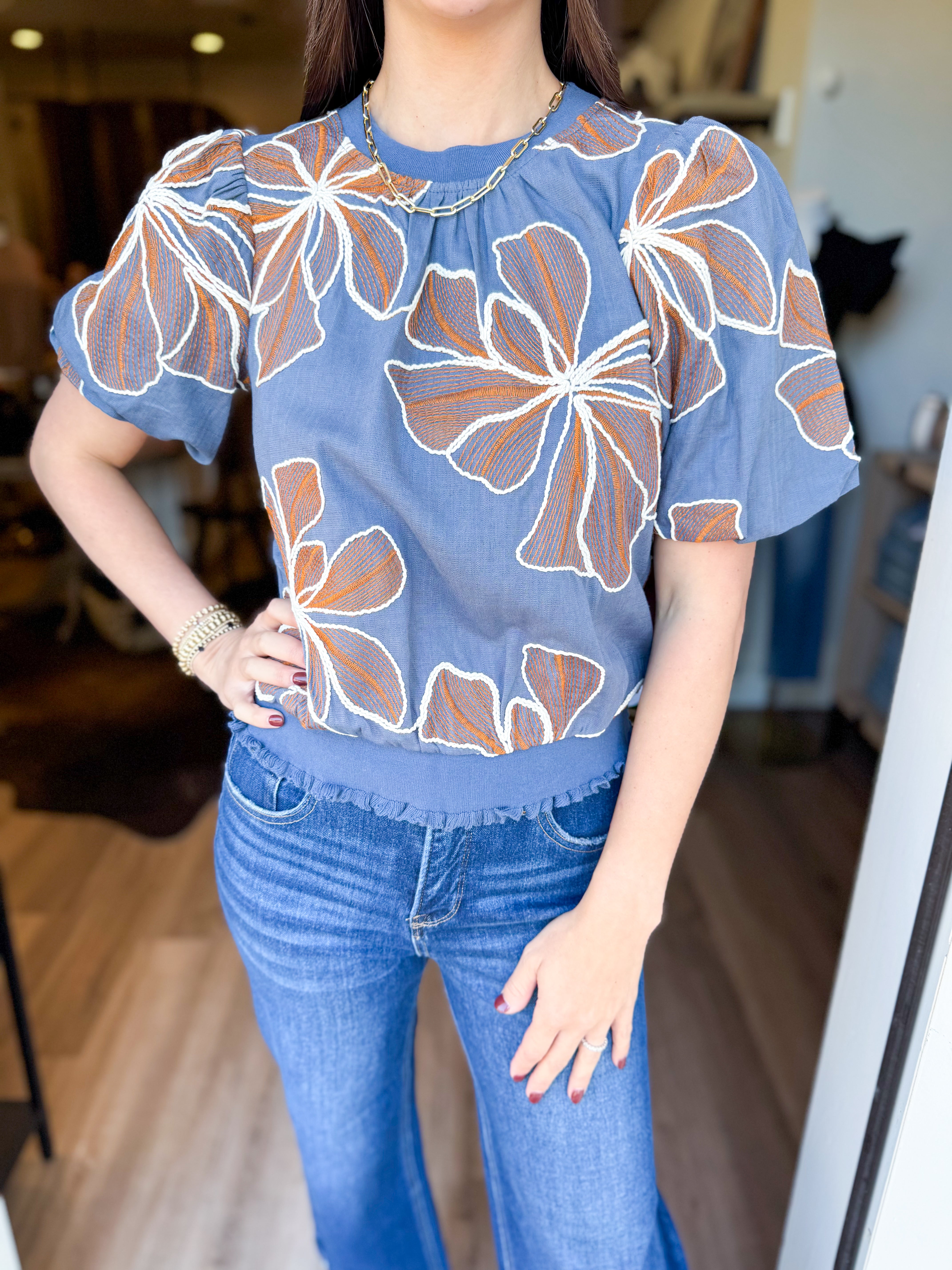 This playful short sleeve top features a charming round neckline and soft elastic detailing at the hem and neck for a comfy, flattering fit. Made from floral embroidered woven fabric, it adds a touch of fun and femininity with its cute bubble sleeves and delicate texture. Perfect for brightening up your everyday look!