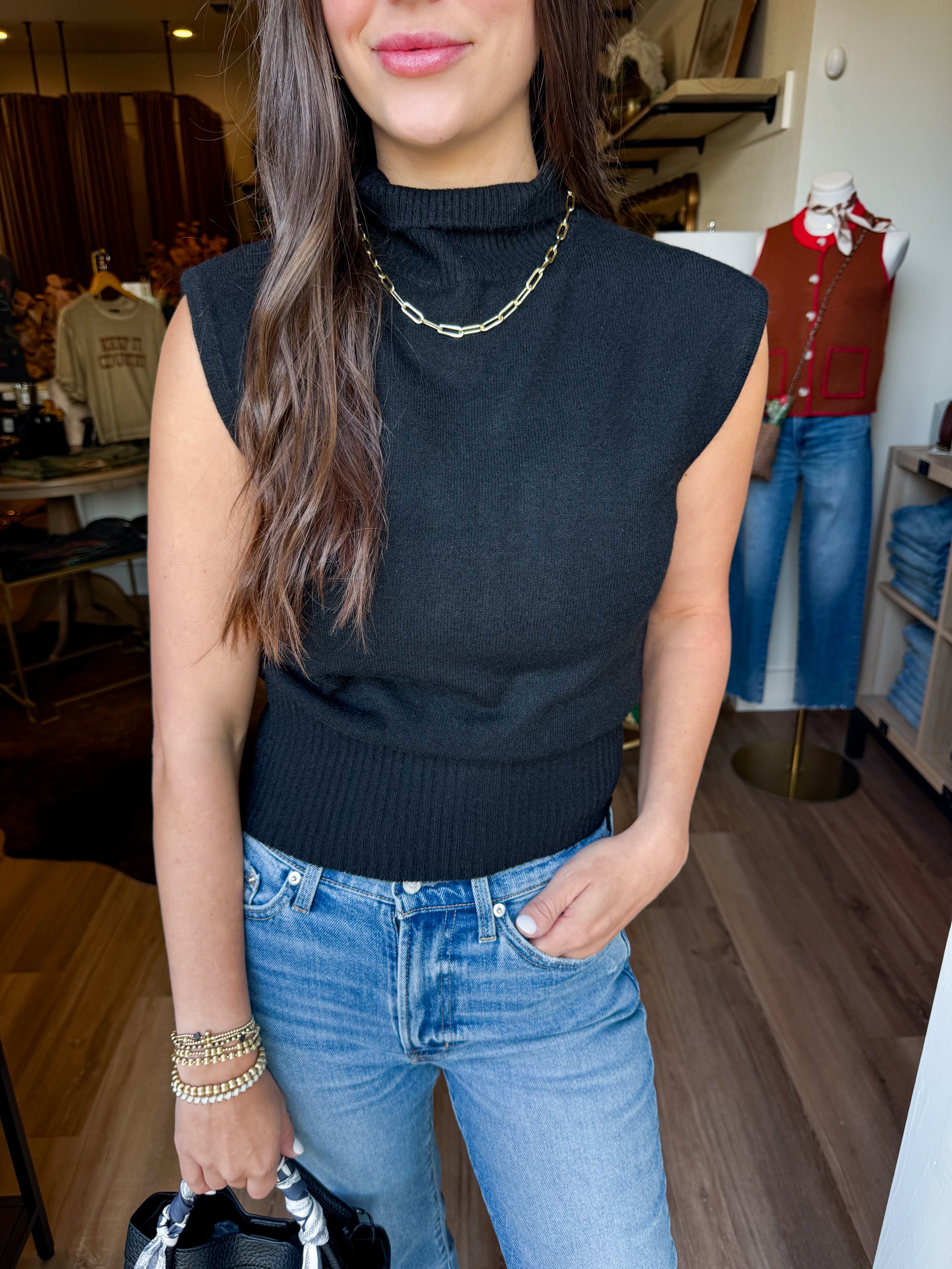 High neck sleeveless knit top in black.