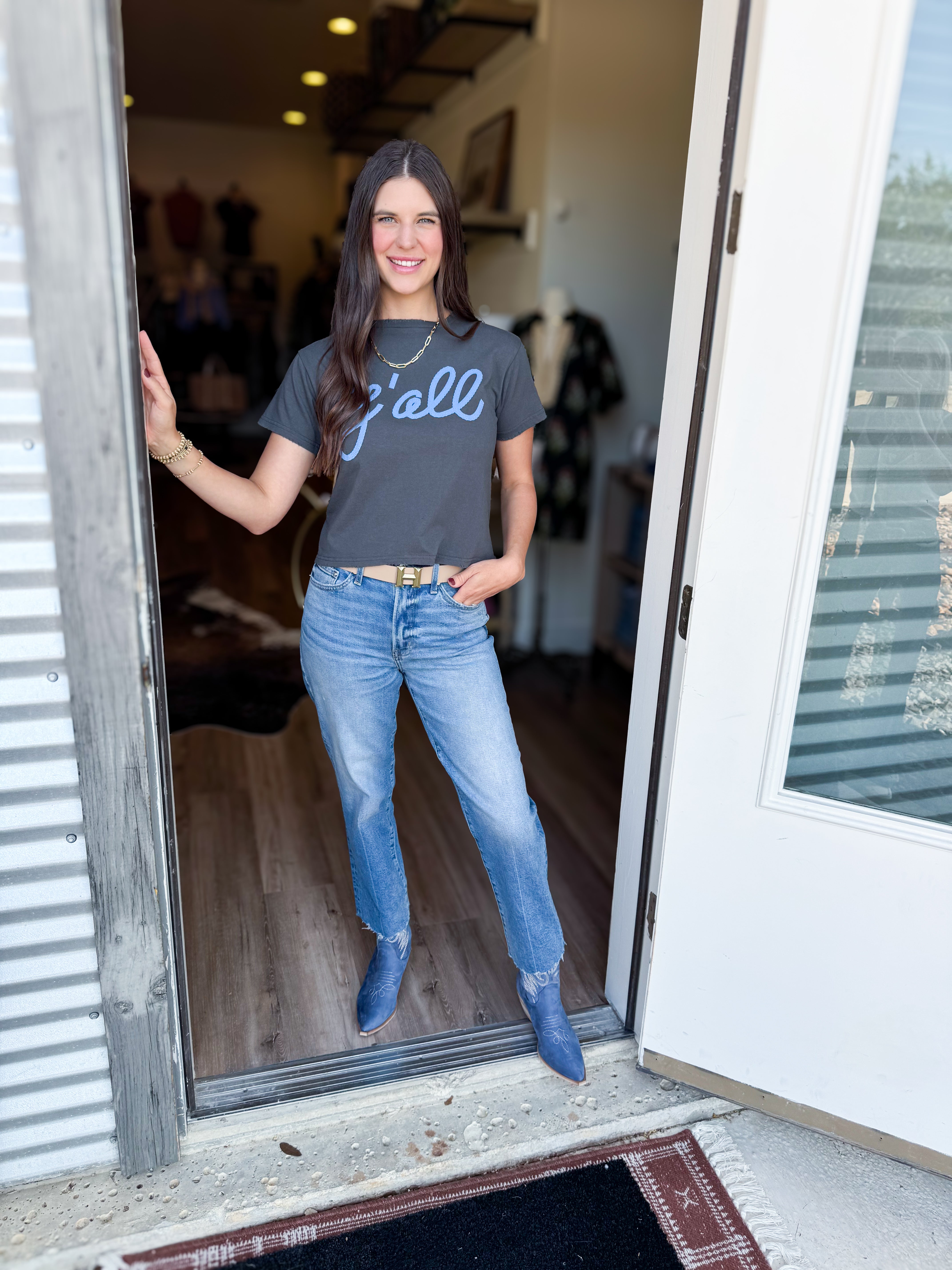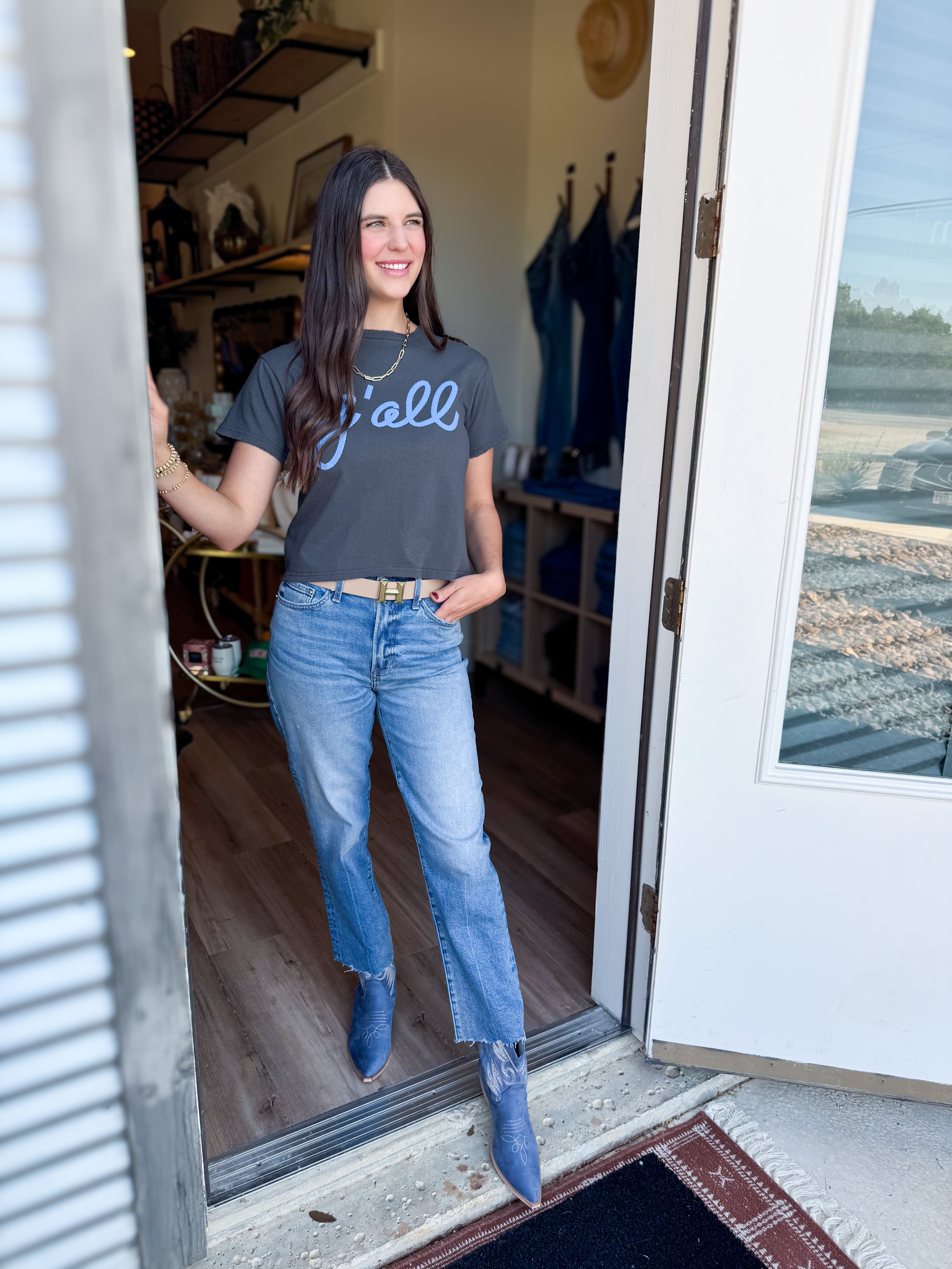 This adorable embroidered graphic tee is the perfect addition to your wardrobe! We are obsessed with the neutral charcoal colored tee, with a pop of color in the prettiest blue! The embroidered wording adds a touch of class to a simple tee, making it fun and chic!