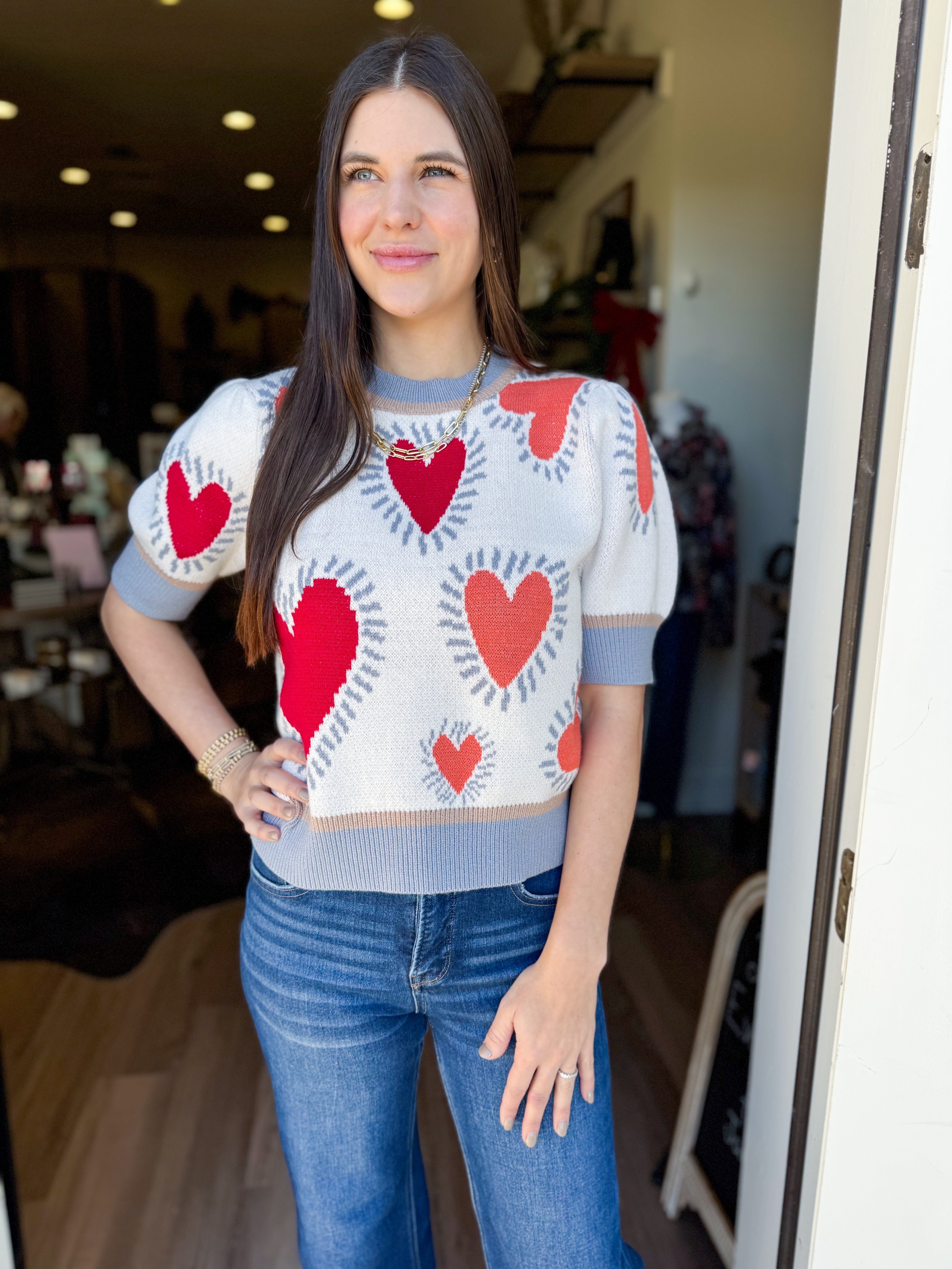 This charming sweater top features adorable short puff sleeves and a sweet heart design, making it a playful addition to your wardrobe. Crafted from a soft blend of 50% viscose, 28% polyester, and 22% nylon, it offers a comfy fit.