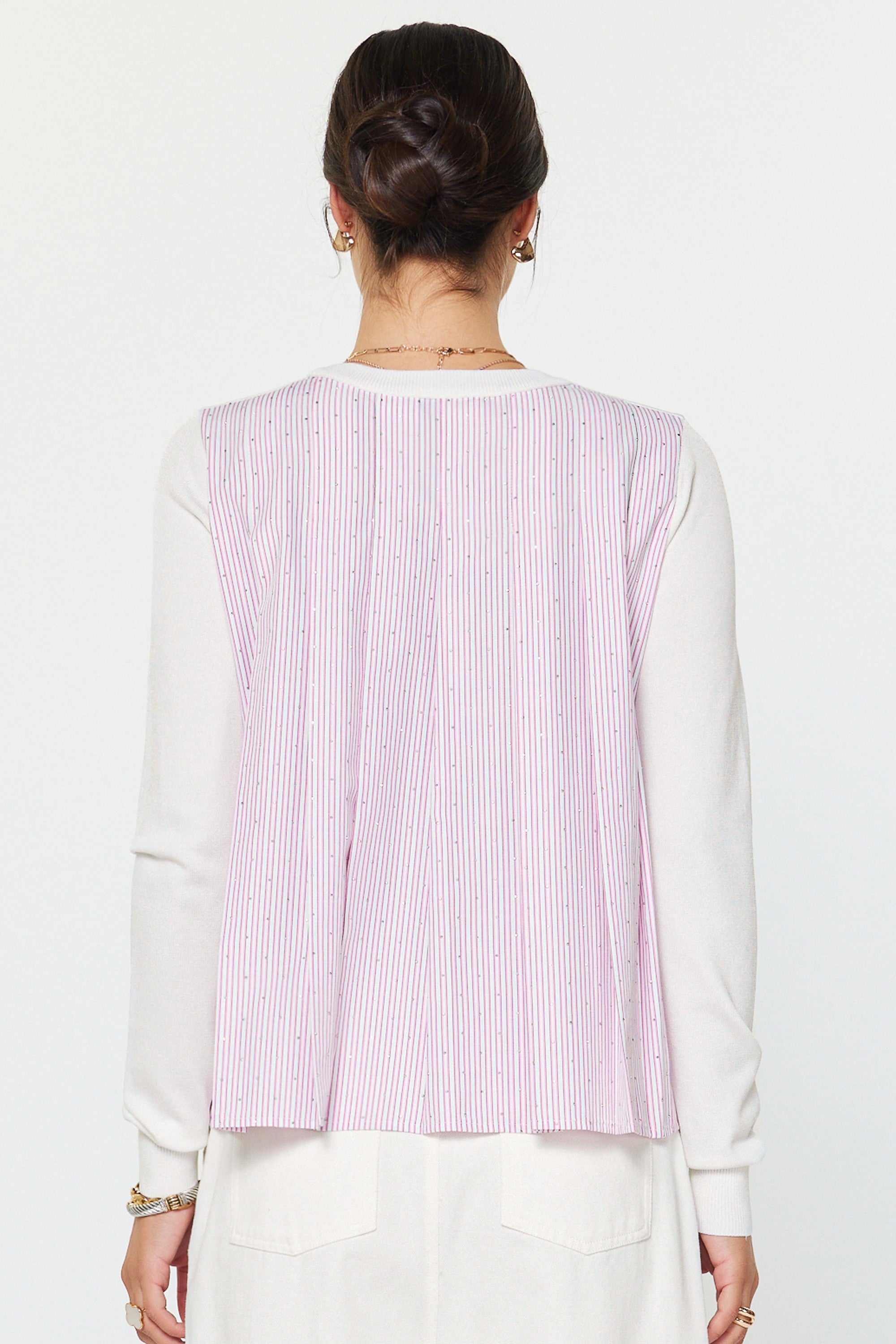 The Margaret Top is your new go-to for mixing textures and vibes. Featuring a solid knit front and sleeves paired with a striped pleated woven back adorned with rhinestone sparkle, this piece brings unexpected dimension to your everyday rotation. The crew neck and ribbed cuffs keep things polished, while the relaxed fit makes layering effortless—throw it over a tee, under a blazer, or wear it solo. Hand wash cold and lay flat to dry to keep it looking fresh.