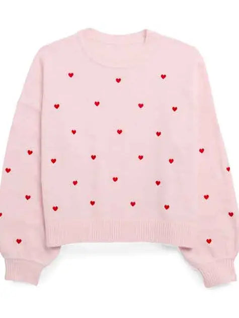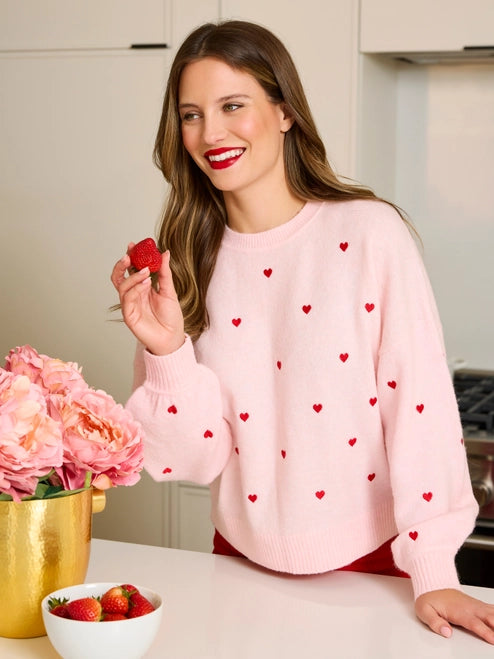 Made from 79% polyester, 14% acrylic, 4% wool, 3% elastane. Hand wash, dry flat. Low iron, reverse side only, Fall in love with your wardrobe all over again in our Hearts Sweater. This cozy pullover features a soft pink base sprinkled with tiny red embroidered hearts that add the perfect dose of sweetness. With a relaxed fit and classic crewneck, it’s made for everything from Galentine’s brunches to snuggly nights in.