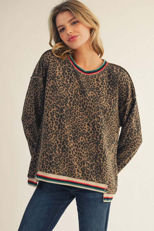 This playful drop shoulder leopard top features a fun unbalanced hem and a contrasting rib band binding detail in color, adding a touch of wild charm to your casual wardrobe. Perfect for effortless style with an edgy twist.