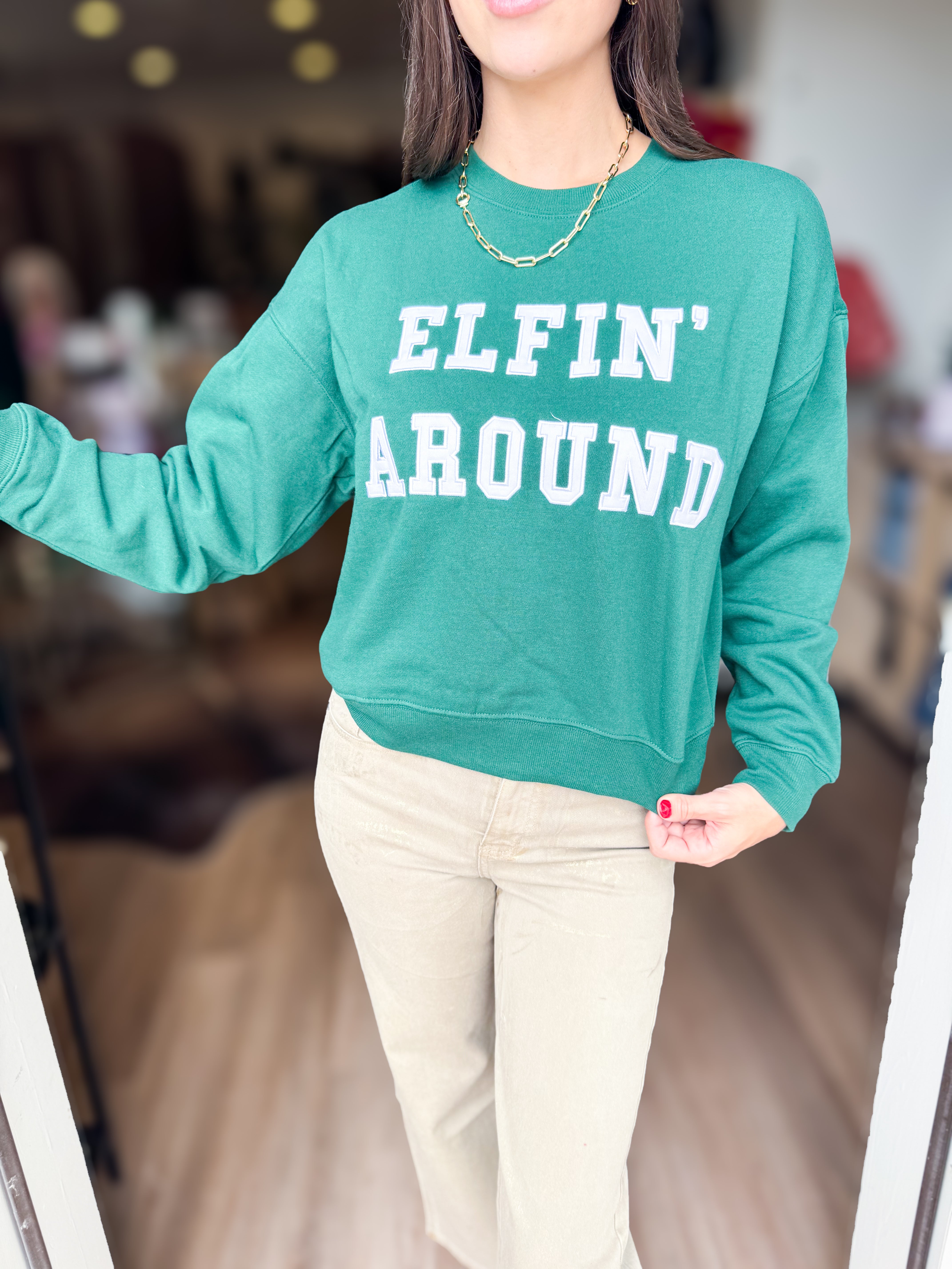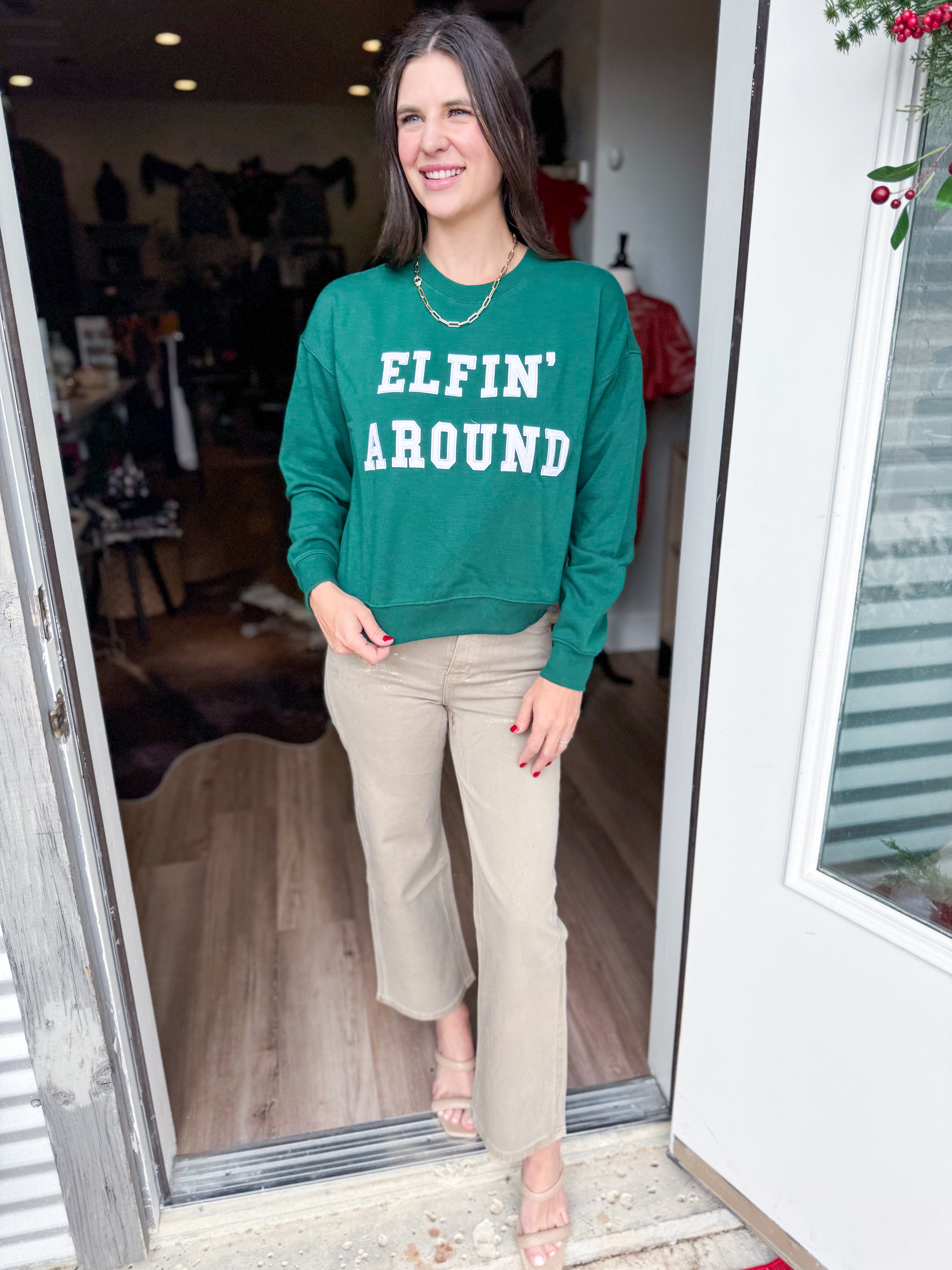 An oversized fit and soft fleece fabric create a lived-in feel from the first wear. Finished with a collegiate "Santa's Helper" twill applique, it brings a playful energy to cozy days and nights.