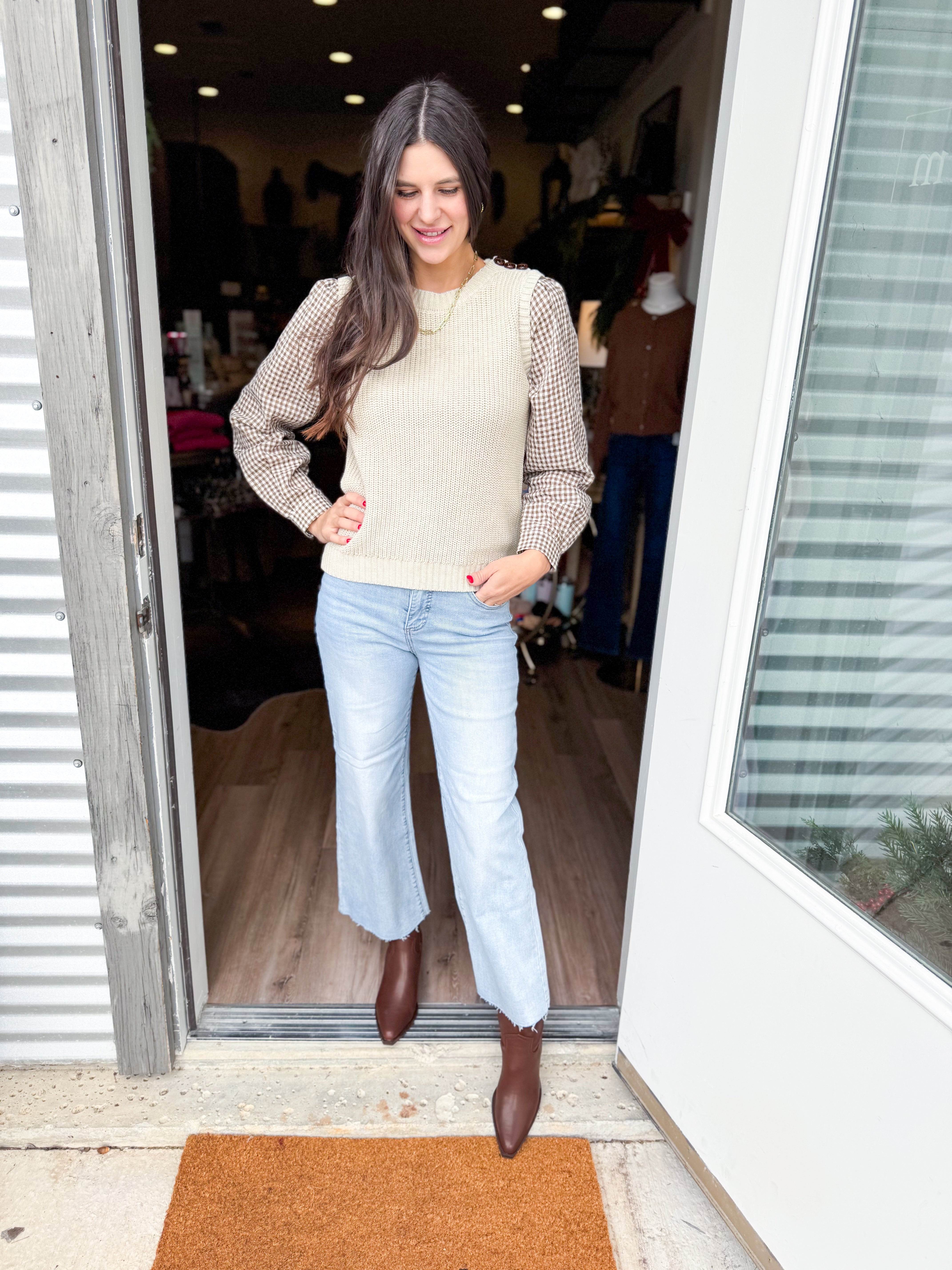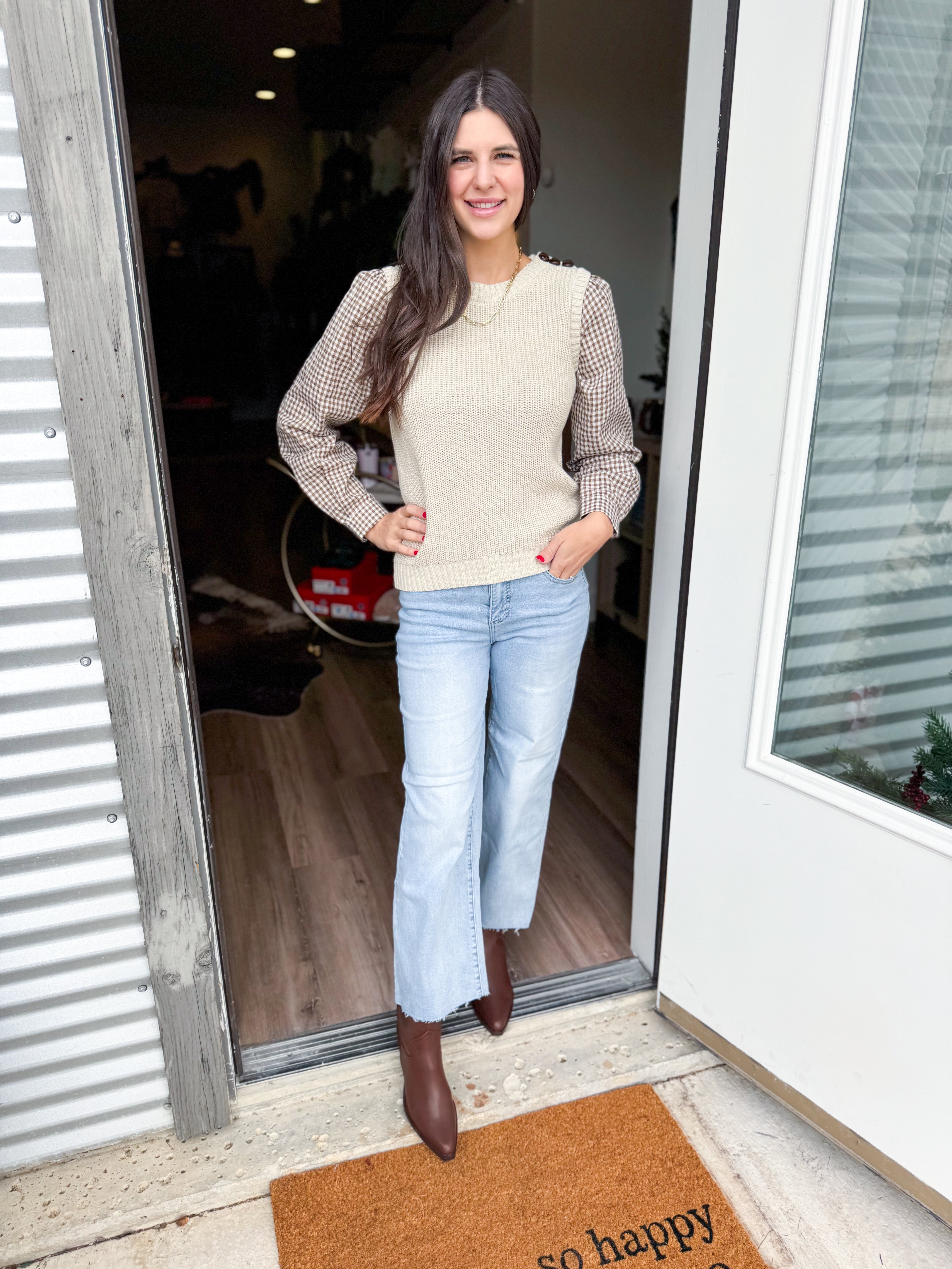 Layer up with the Faith Sweater, where classic meets clever. This twofer design pairs a cozy sweater with contrasting gingham pattern sleeves that add a preppy twist to your everyday look.