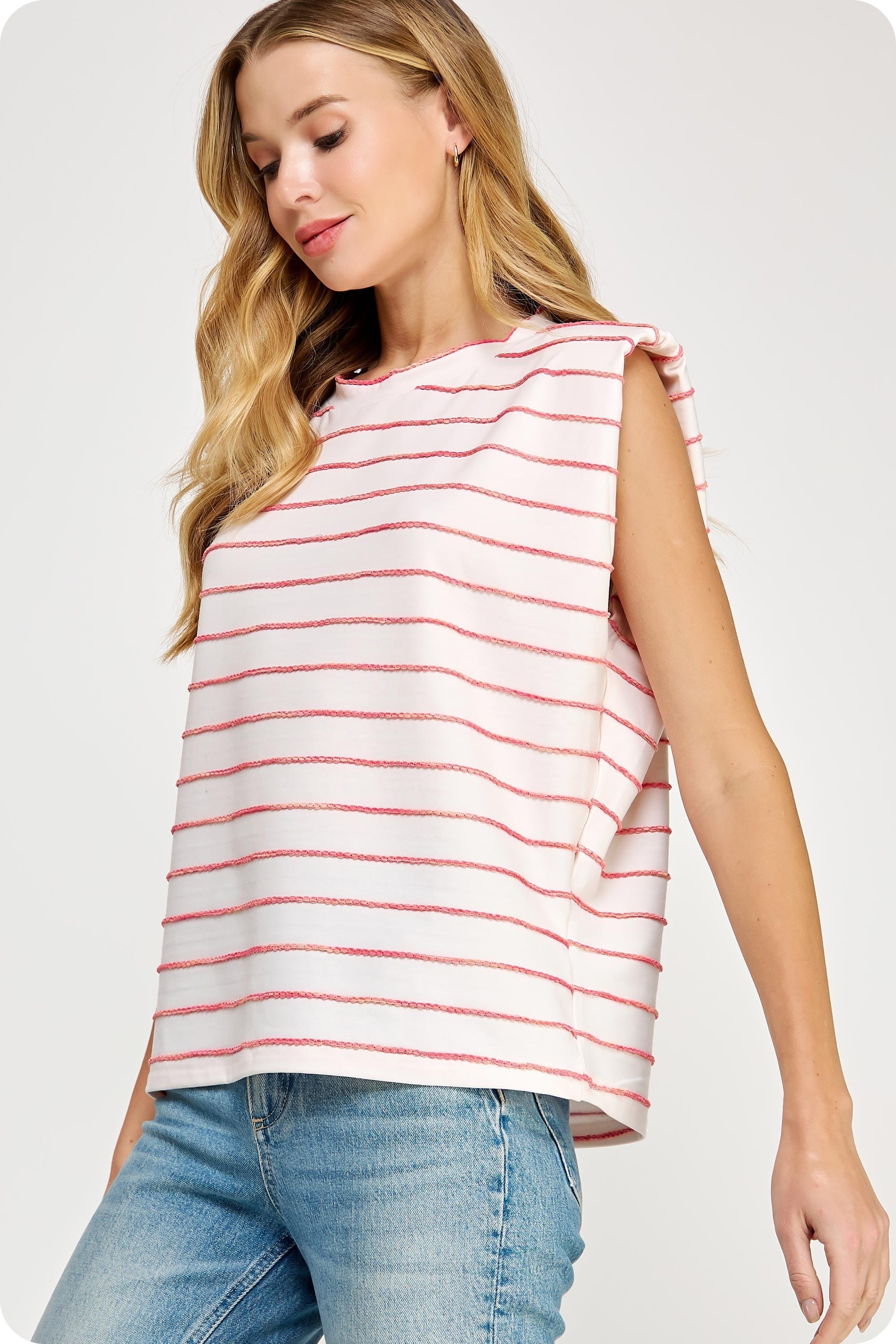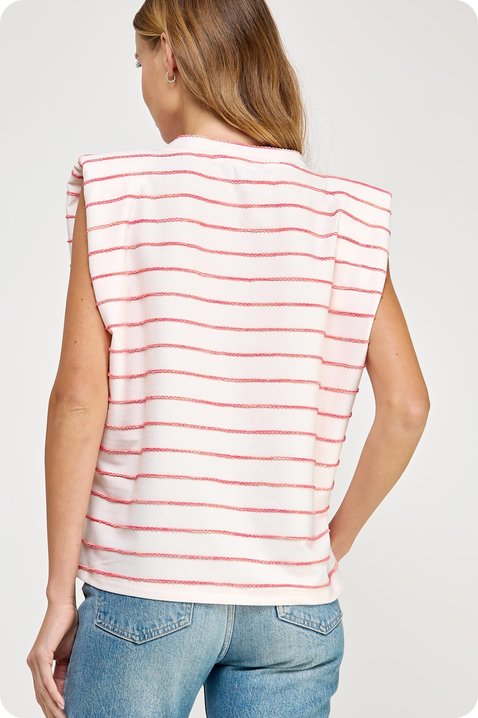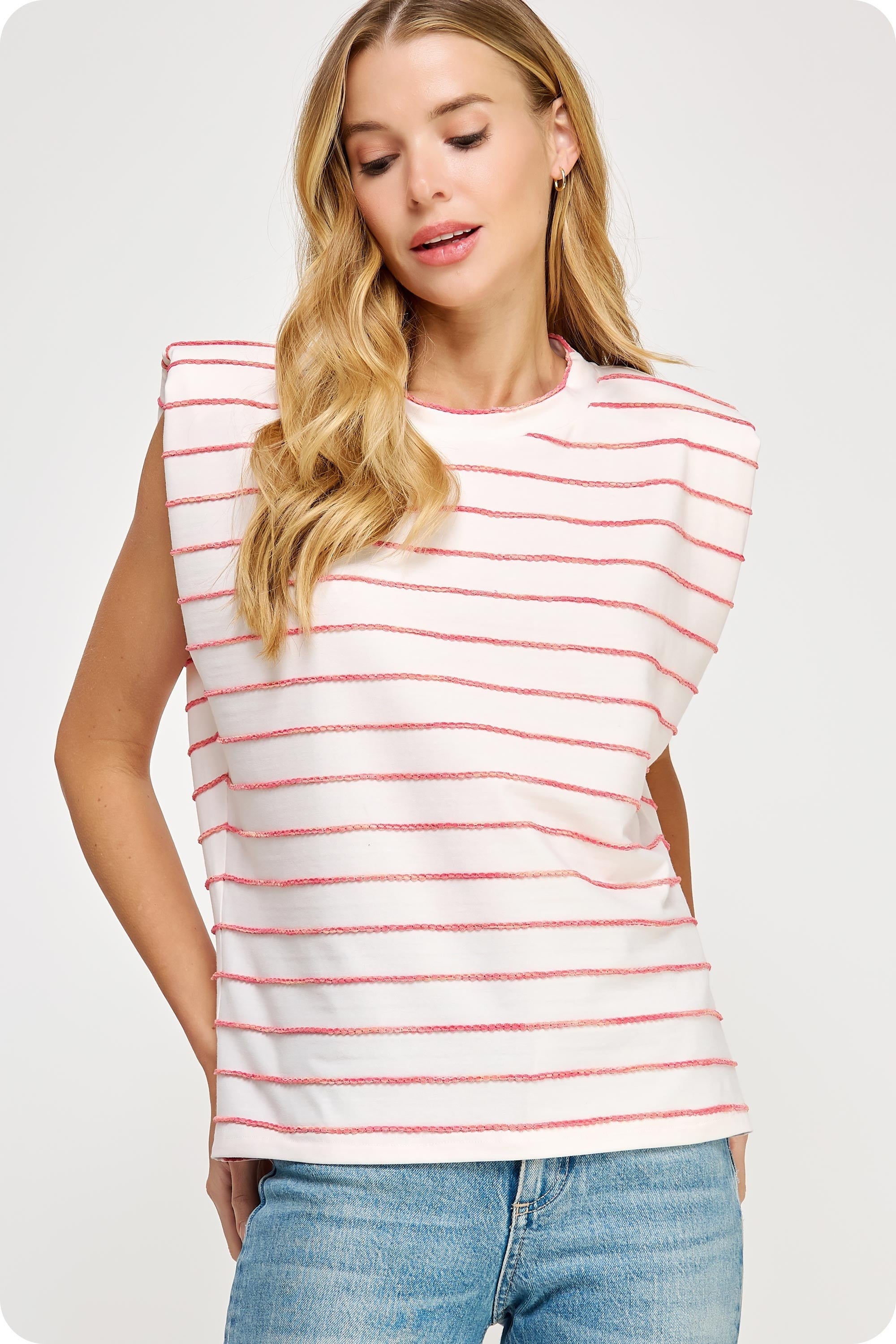 Shoulder padded muscle t-shirt top in texture stripe knit fabric.