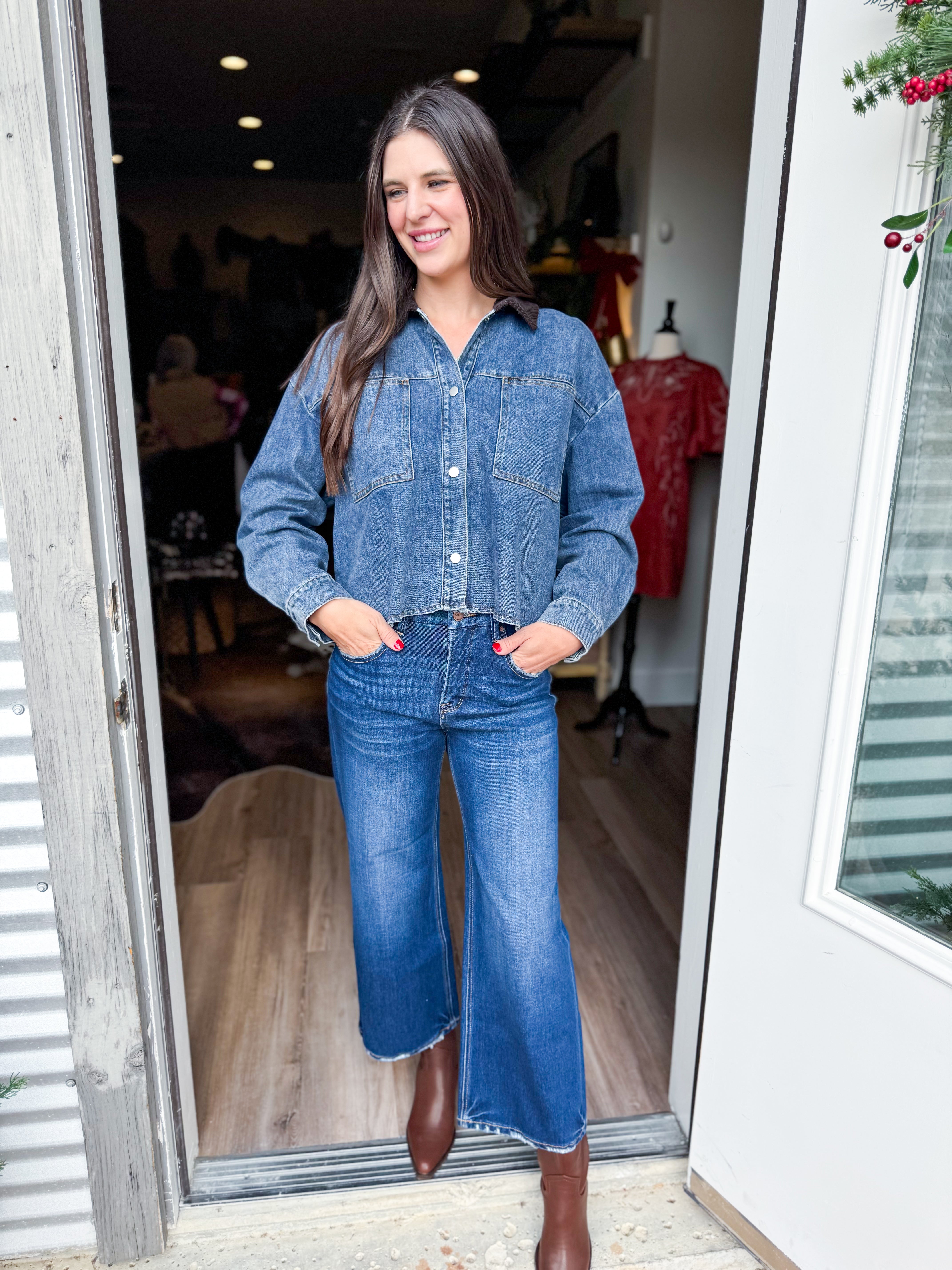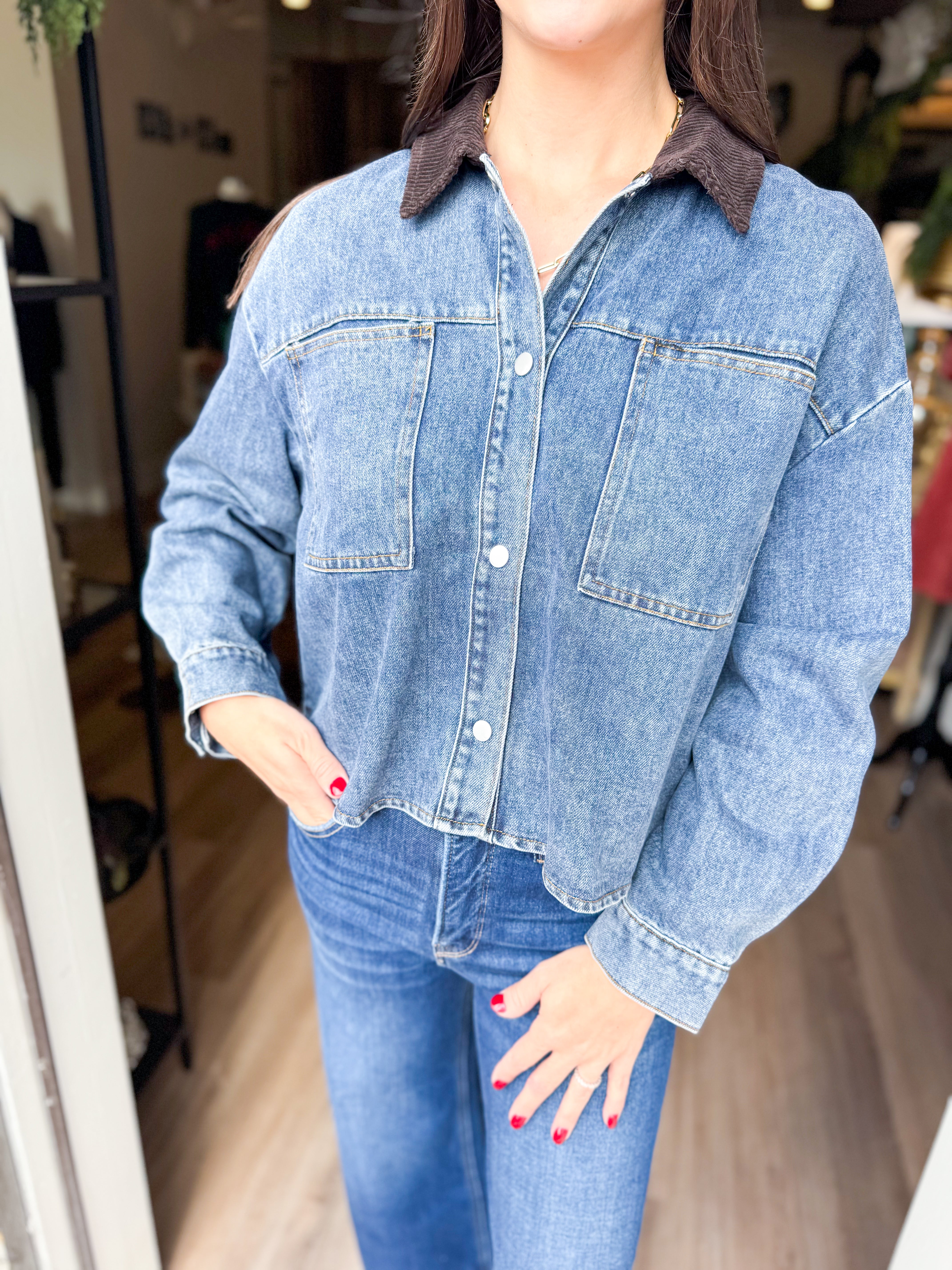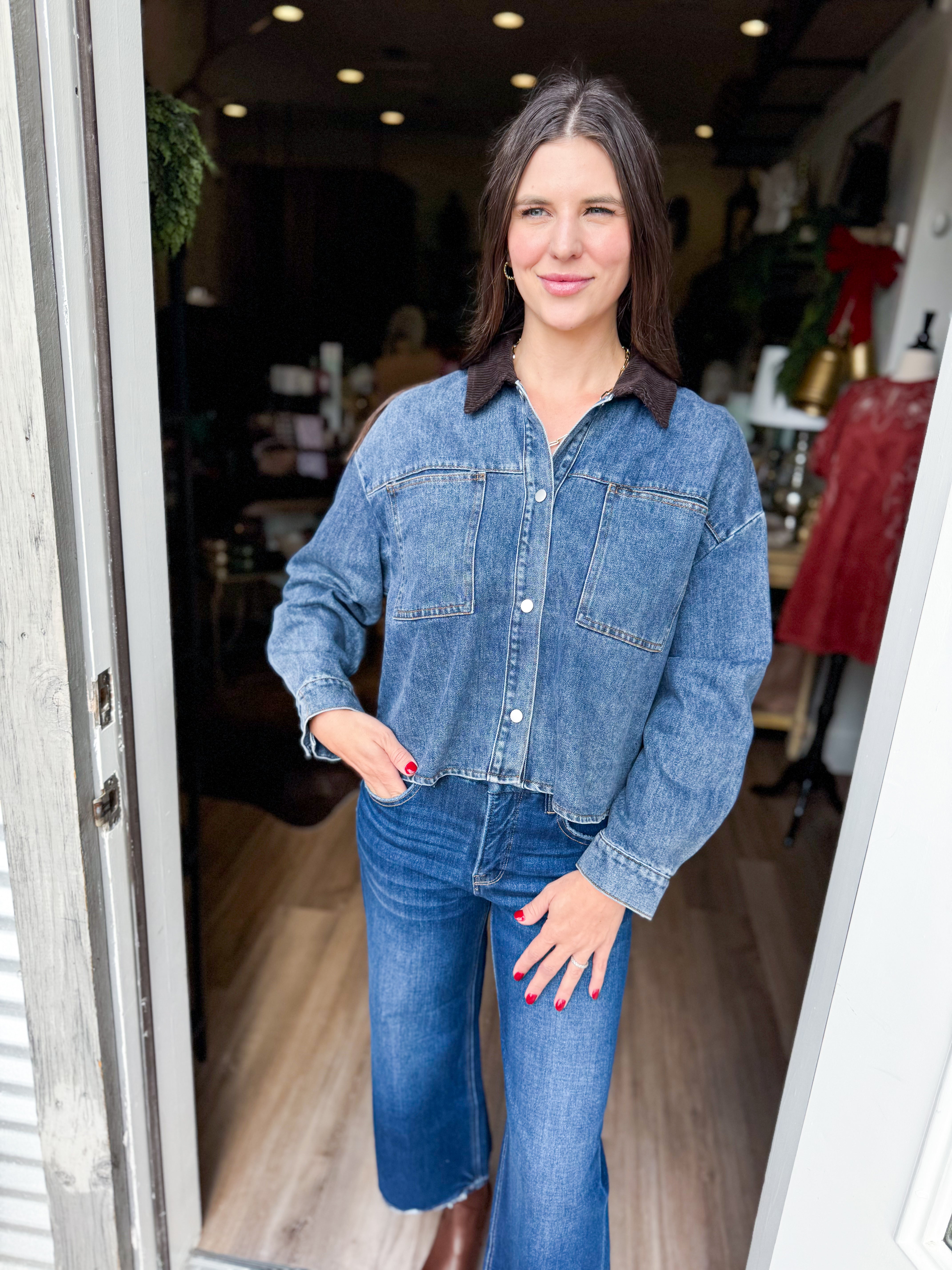 The Riley Denim Jacket is your new go-to layer for effortless cool. This cropped beauty pairs classic denim with a cozy corduroy collar in rich brown—think vintage vibes meets modern edge. Crafted from 100% cotton, it's breathable and built to last through countless adventures.